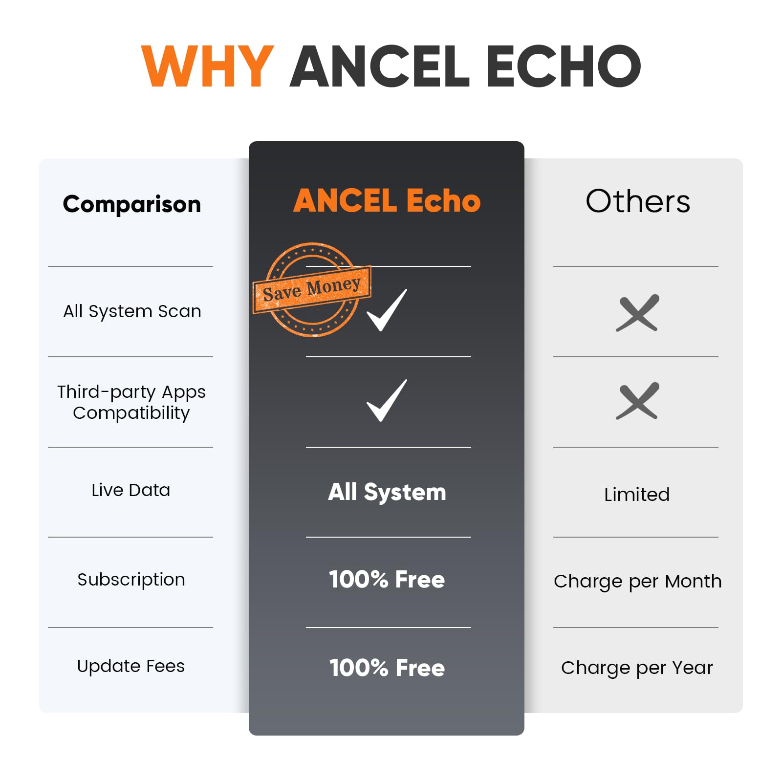 AFFORDABLE TOOL – No update fees, no subscriptions, and no in-app purchases—Ancel Echo offers lifetime free updates. Unlike other Bluetooth diagnostic tools at a similar price that charge extra for advanced features, Ancel Echo provides full-system diagnostics, complete data streams, actuation test, and special functions. It’s the affordable tool for car owners & DIY enthusiasts to troubleshoot vehicle issues, you don't always have to run to a mechanic.