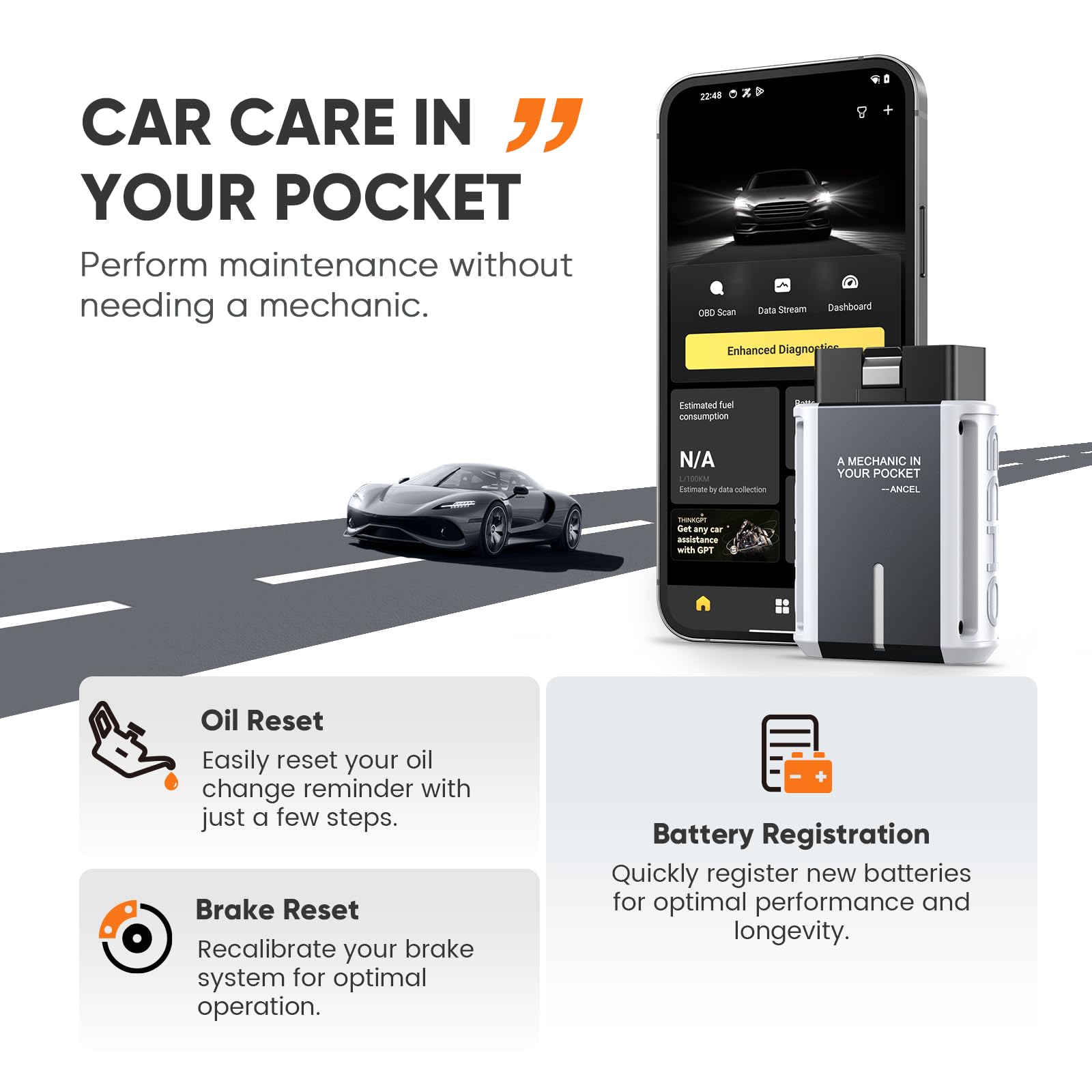 ROUTINE CAR CARE WITH EASE - This car scan tool offers three special services: oil light reset, battery registration, and brake pad reset, allowing you to manage routine car maintenance from home. The Ancel Echo app guides you through simple, straightforward steps—no complicated processes required. Please note that these services may not be available for all vehicles. For compatibility questions, feel free to reach out before purchasing.