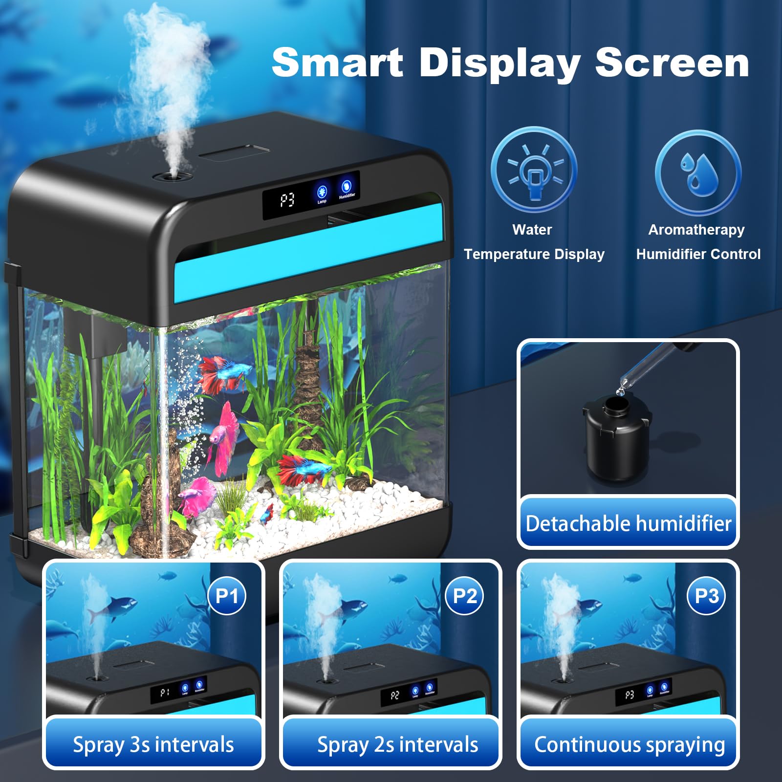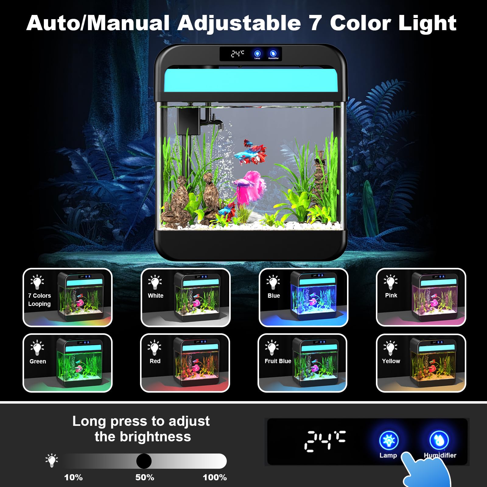 【Multifunctional Smart Aquarium】 Own this versatile fish tank and enjoy four unique features: - Automatic circulation mode - Manually adjustable 7-color lighting system - Real-time temperature sensor for continuous environmental monitoring - Aromatic humidifier with three mist settings Plus a revolutionary combination—a stunningly beautiful smart aquarium.