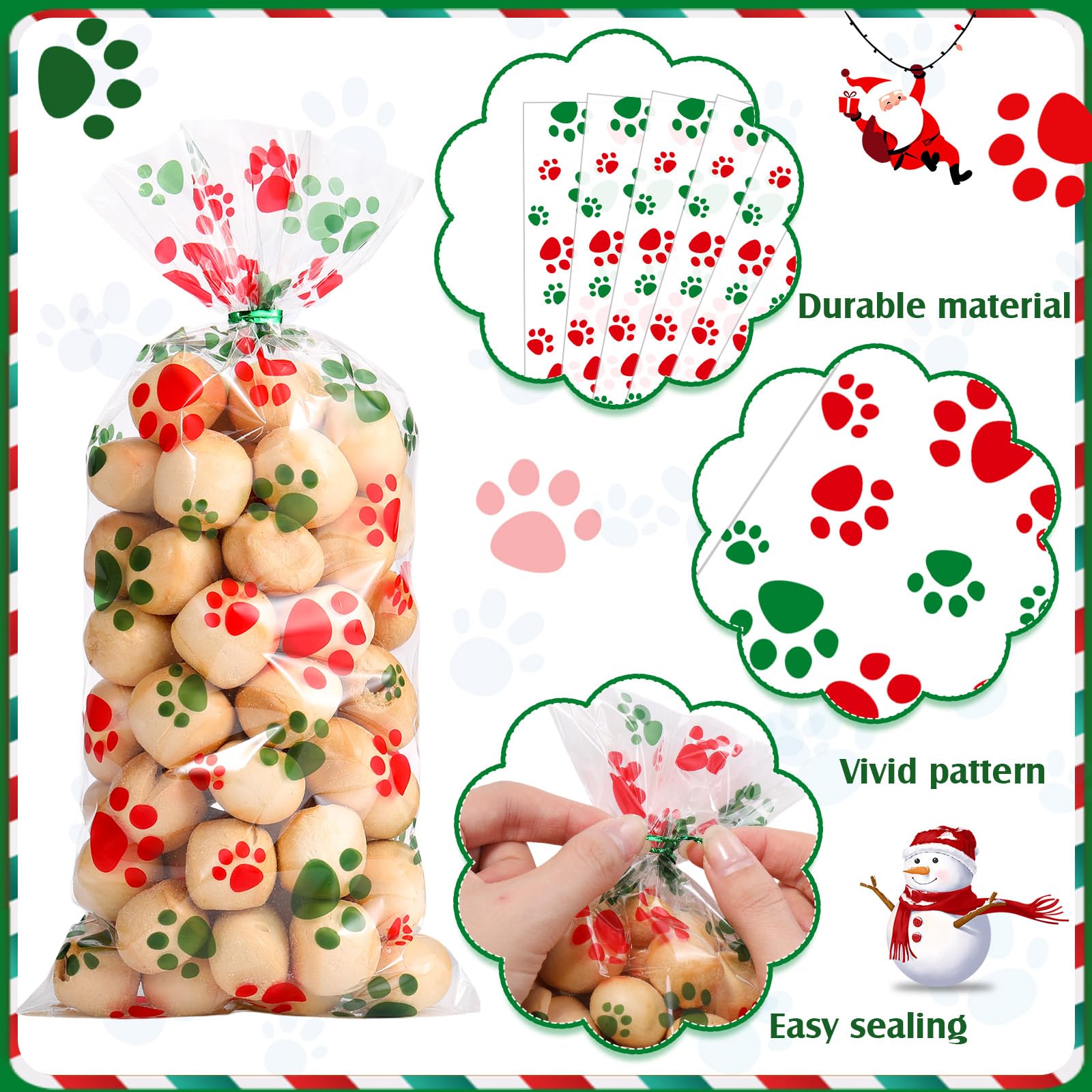 100 Pack paw print patterned cellophane bags heat sealable candy bags gift bags with 100 pieces silver twist ties for pet treat party favor Designs: Each plastic bag is 27.5 x 12.5 cm/ 10.8 x 5 inch, can hold a good amount of candy, then tighten the opening with a silver twist tie. Features: The heat sealable pet gift bags are printed with paw print pattern, these bags can decorate your pet party and make it funny. Wide usage: These paw print bags are suitable for party favors, candy bags, or other gift packaging. Specifications: Color: as the picture shown Material: clear OPP Bag size: 27.5 x 12.5 cm/ 10.8 x 5 inch Twist tie: 10 cm in length Package includes: 100 x Paw print patterned bags 100 x Silver twist ties