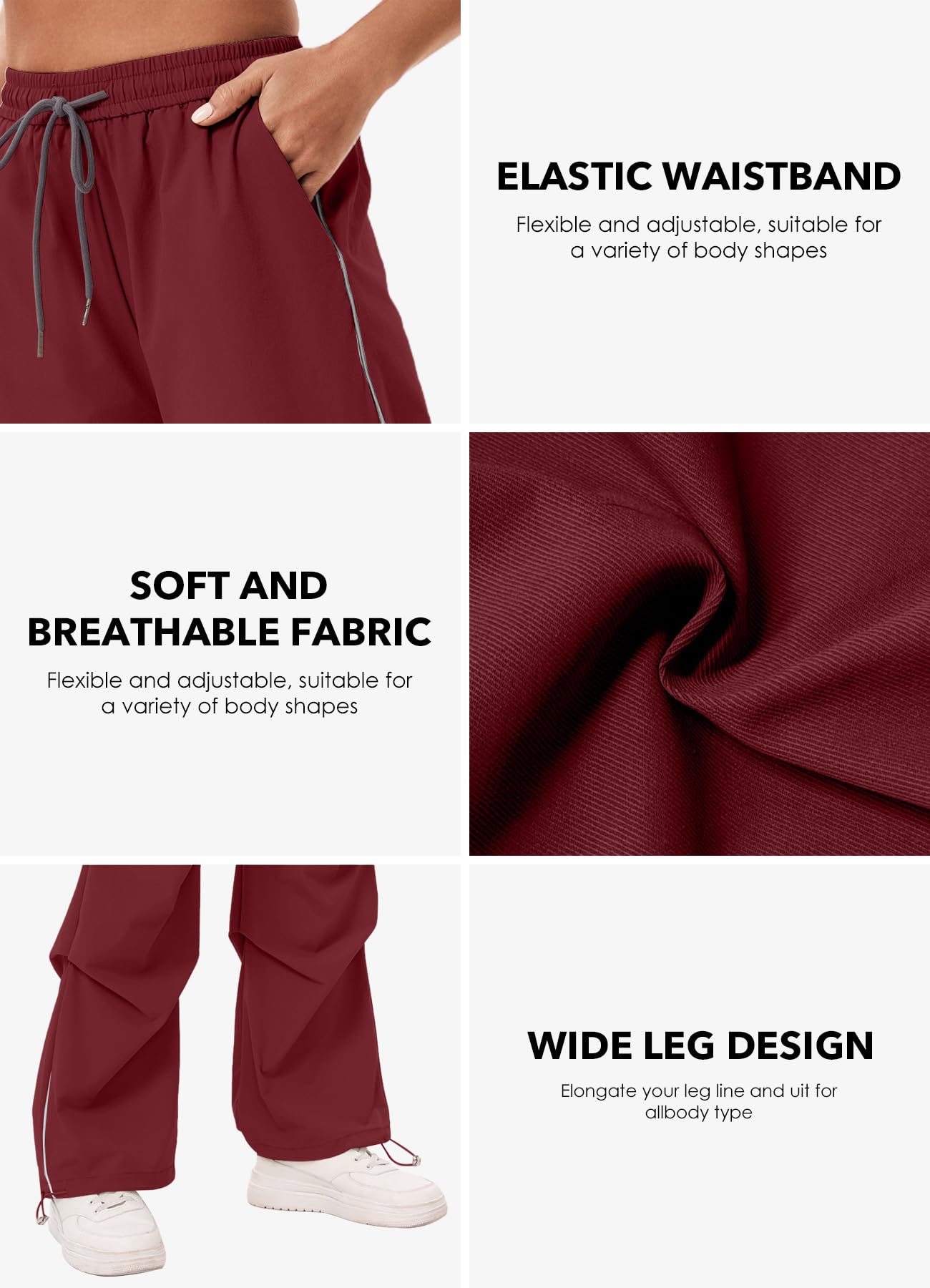 Adjustable Drawstring Waist & Hem: Featuring an elastic high waist with an adjustable drawstring and customizable hems, these wide leg track pants allow flexible styling while maintaining a comfortable fit.