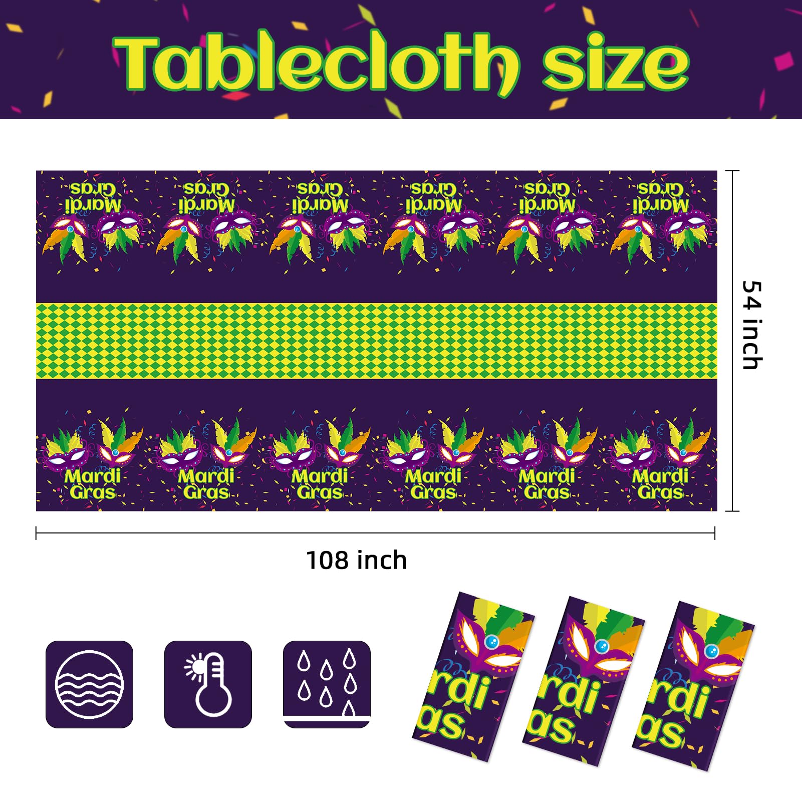 Mardi Gras Party Tablecloth Size: The size of Mardi Gras decor tablecloth is about 54 x 108 inches/ 137 x 274 cm, can cover up to an 8-foot table. The mardi gras tablecloth is a great choice for mardi gras party supplies, kids birthday party, school events, mardi gras table decorations