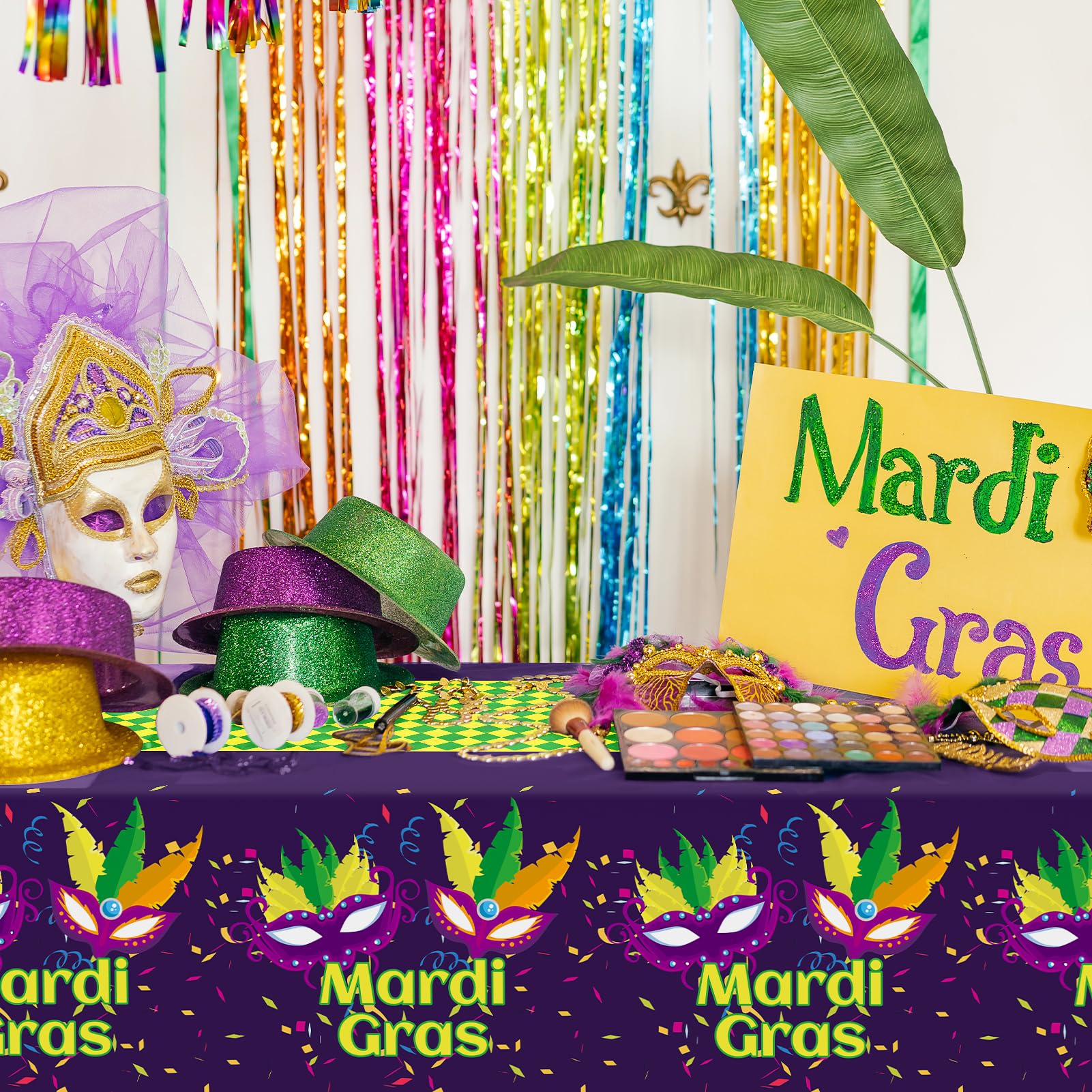 Mardi Gras Tablecloth for Party: The mardi gras tablecloth is great for mardi gras decorations, dinosaur birthday party, carnival decorations, carnival party decorations, mardi gras party favors, mardi gras decorations outdoor. The party tablecloth designed with classic elements such as mask, ribbons and others. The bright color and classic pattern will light up your party, caught everyone's eyes. Mardi Gras plastic tablecloths will fully decorate your party scene and make your party full of carnival atmosphere