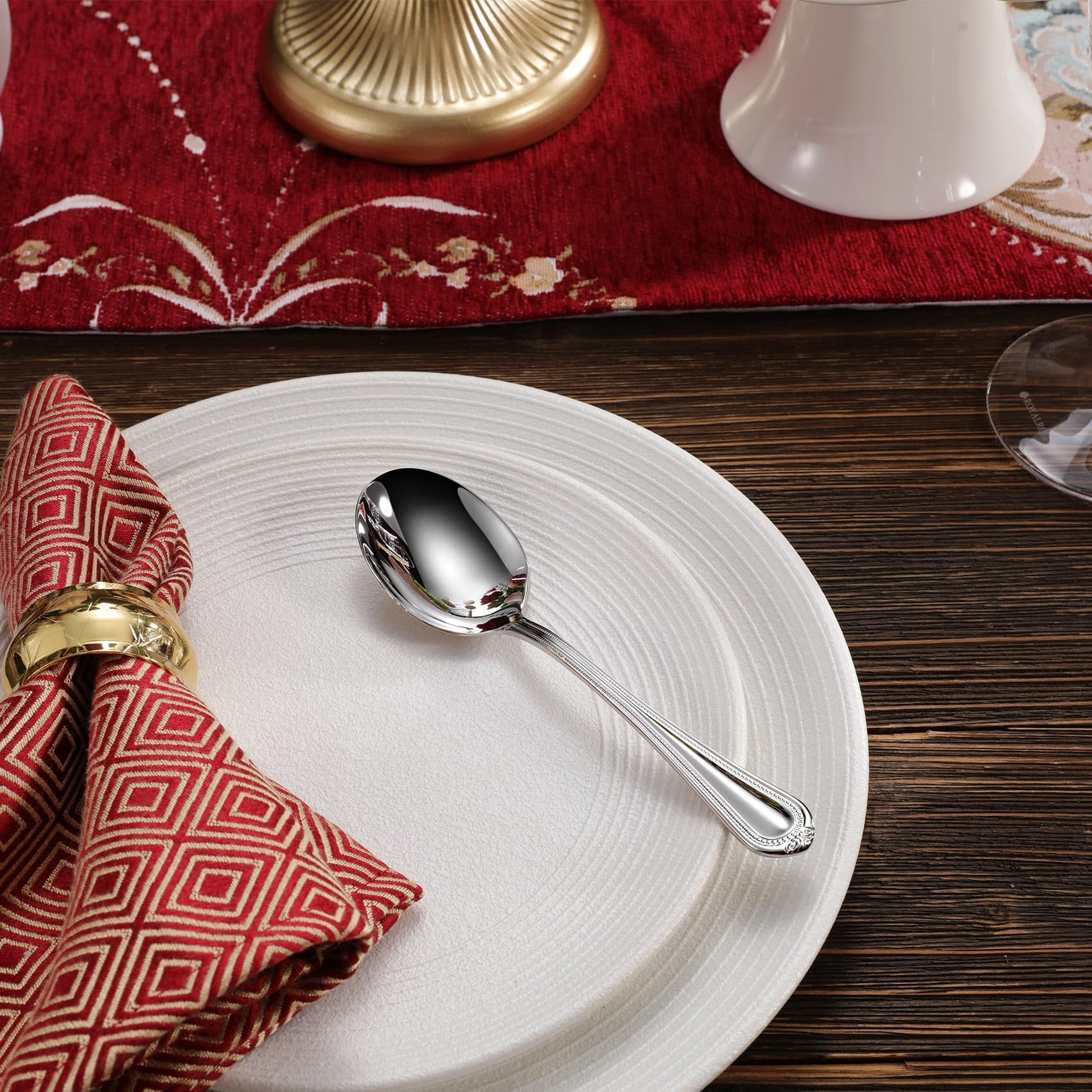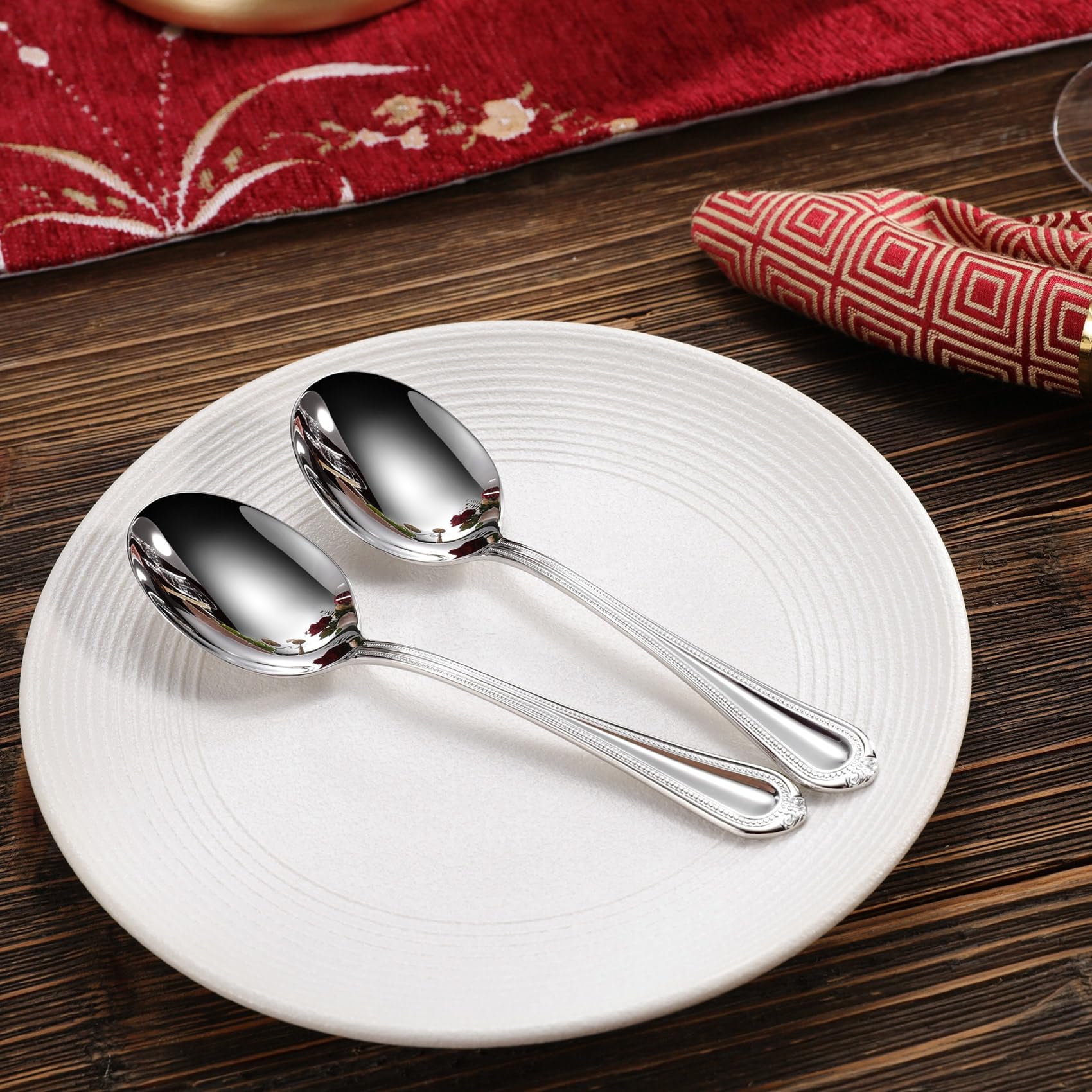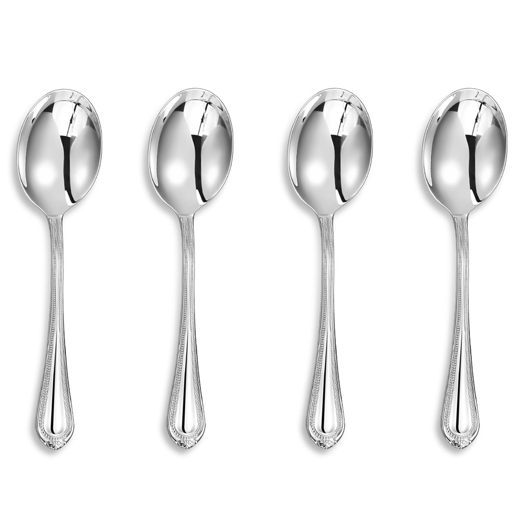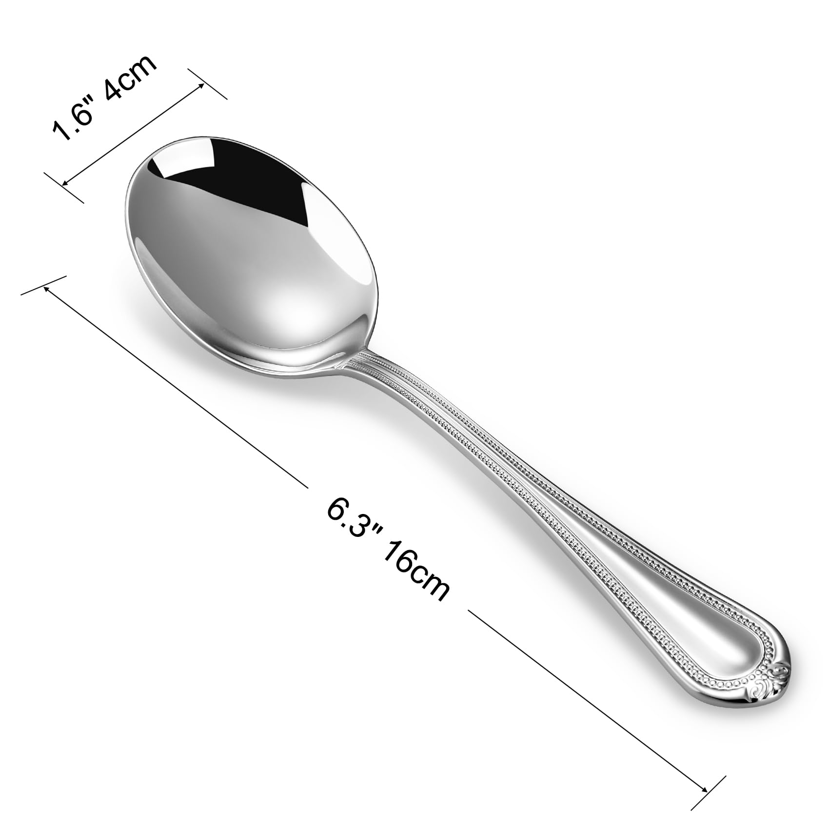 💎RUE‑TO‑SIZE — Each condiment spoons is 6.3" long × 1.6" wide (16 × 4 cm), measured tip‑to‑tail and at the bowl’s widest point. 💎Sophisticated Bead Detailing: Adorned with an intricate bead design along the Pearl Edge, these serving spoons offer a blend of classic charm and modern elegance.