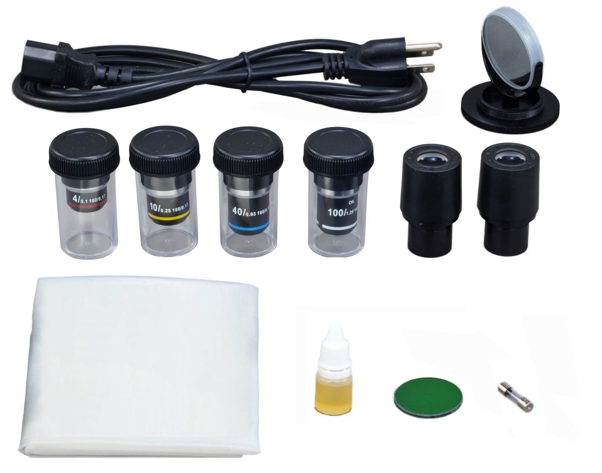 Total magnification: 40X-100X-400X-1000X; Eyepieces: widefield WF10X/18; Objectives: achromatic DIN 4X, 10X, 40X (S), 100X (S, Oil); Viewing head: 45degrees inclined 360 degrees swiveling trinocular; Interpupillary distance: sliding adjustable 2-3/16inch ~ 2-15/16inch (55mm ~ 75mm); Diopter: adjustable on both eyepiece tubes