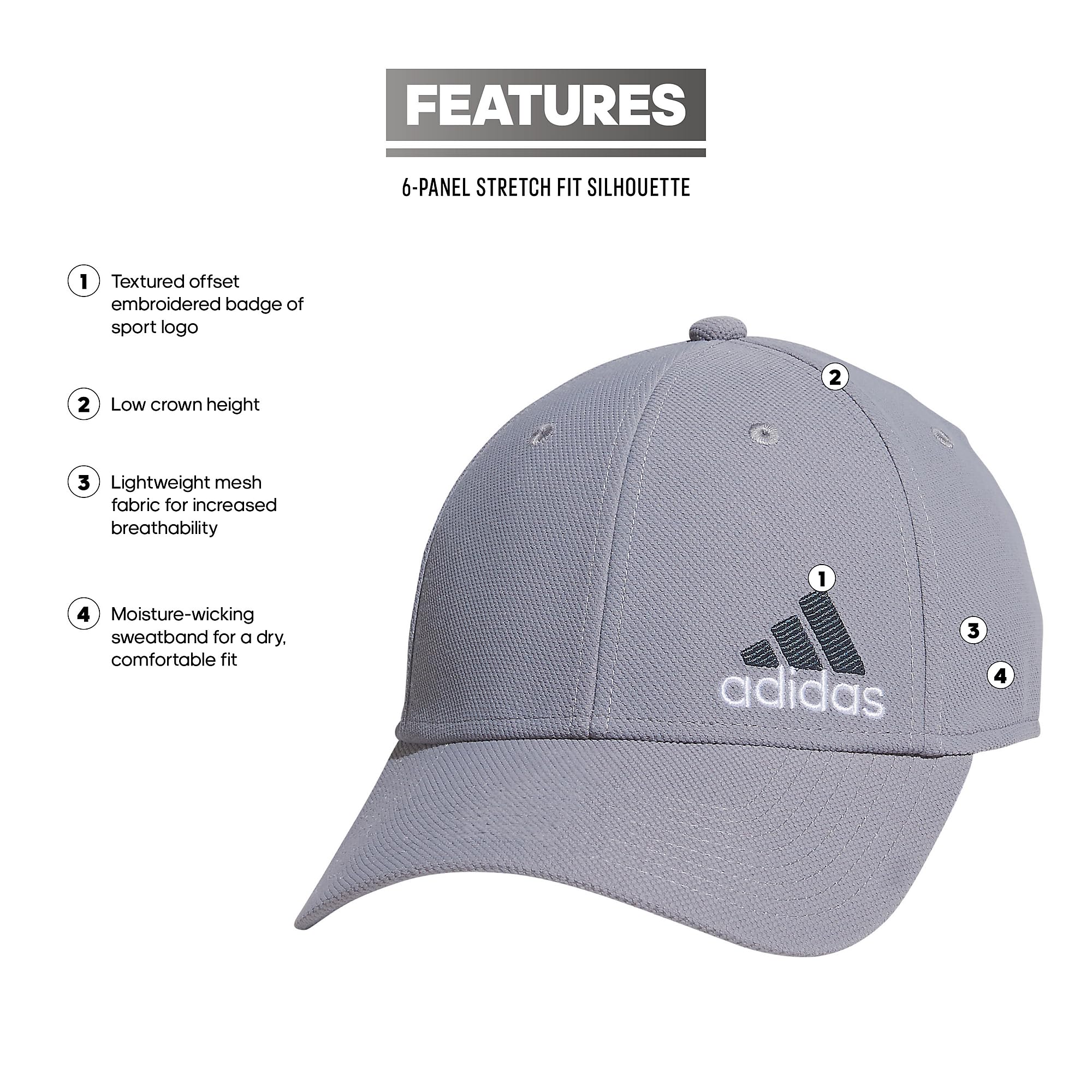 Description Designed for comfort during any workout, this men's hat is made with stretch fabric. A moisture-wicking sweatband keeps your forehead dry and your focus on your session. An embroidered adidas Badge of Sport sits proudly in front.