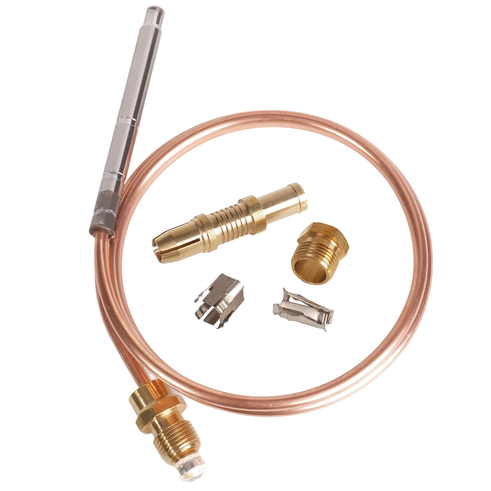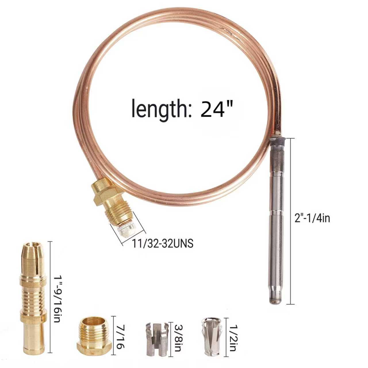 The Thermocouple length 24" replace Robertshaw Model 1980-024 Snap Fit. Made of durable copper and high temperature resistance sensor. Temperature resistance 750°C with universal adapter and clamps. This thermocouple automatically shuts off gas flow if the pilot light goes out when work with control valve. Open valve time less than 10 seconds.