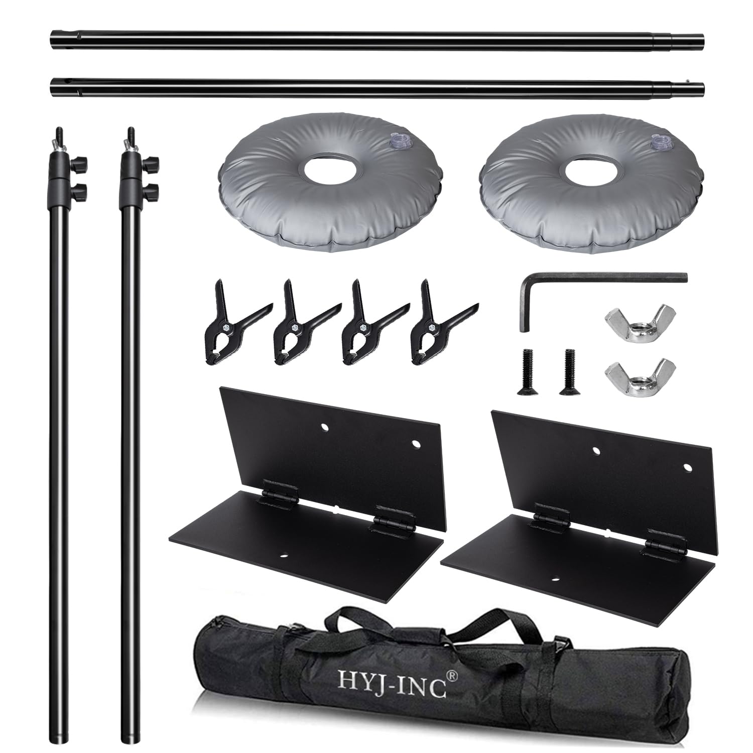 The Kit included 2 x Heavy Metal Base, 2 x Support Sand, 2 x Cross Bar, 2 x wing nut,4 x Spring Clamps, 2 x Water weight bag,2 x Screw,1 x Wrench,1 x Carrying Case Professional heavy duty photo backdrop stand kit, Meet your party's decorative need and create a romantic and beautiful party atmosphere,Whether Indoors or Outdoors Active.