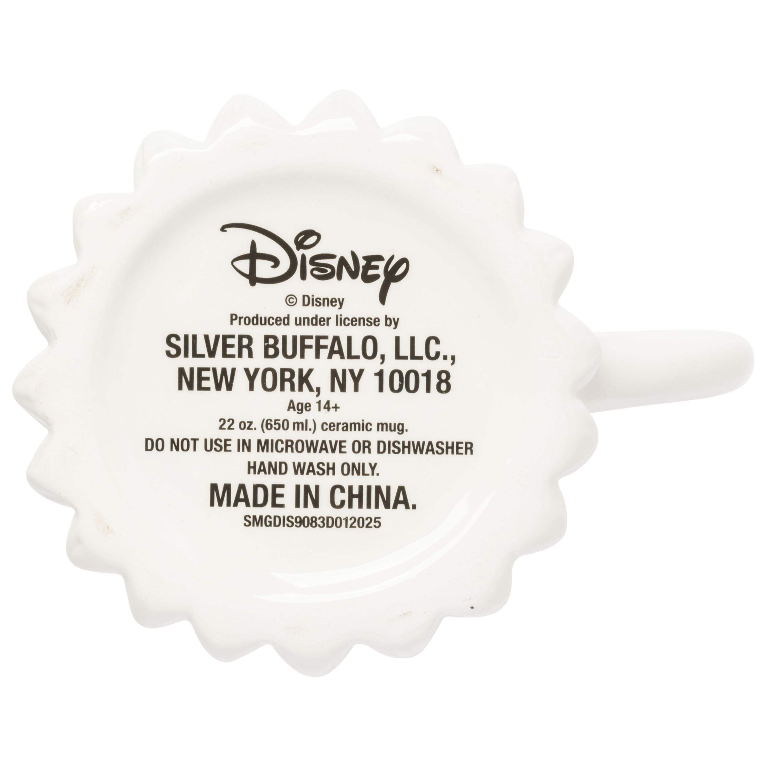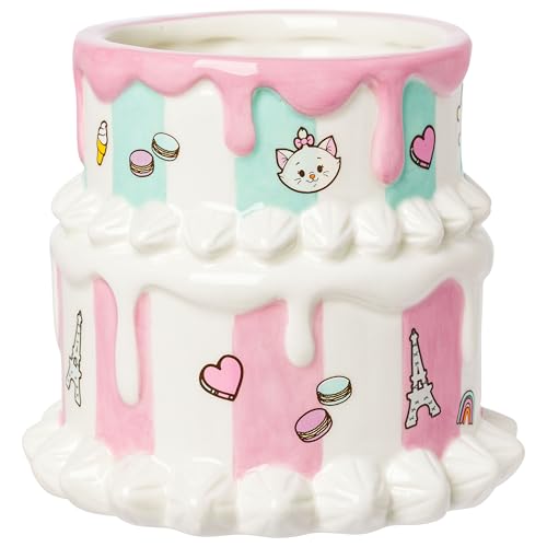 THE ARISTOCATS: Adorable mug is in the shape of a two tiered cake. Featured throughout the design is Marie alongside the Eiffel Tower, bows, music notes, ice cream cones, macaroons, and rainbows. Mug is decorated with blue and pink stripes.