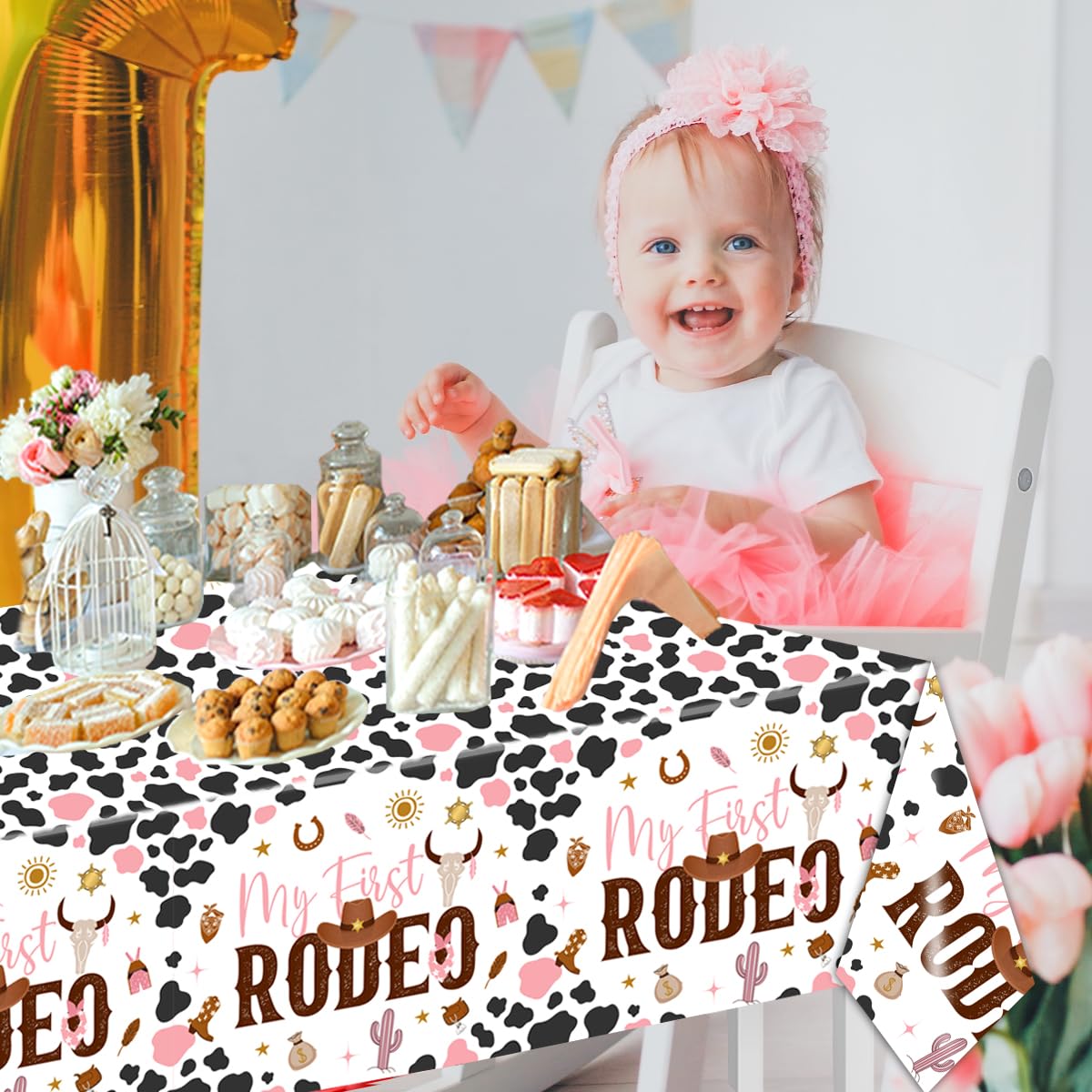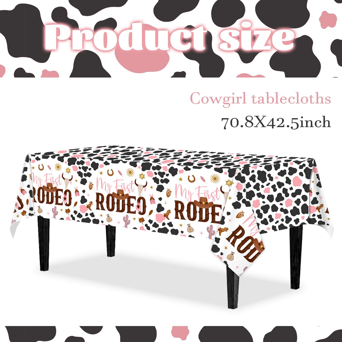 šćUNIQUEćWestern rodeo tablecloths specifically designed for girlās 1st birthday.Various elements of cow, such as horseshoes,boot,hat,rompers and scarf ,the unique design attracts people's attention, let you deeply remember this unforgettable party.