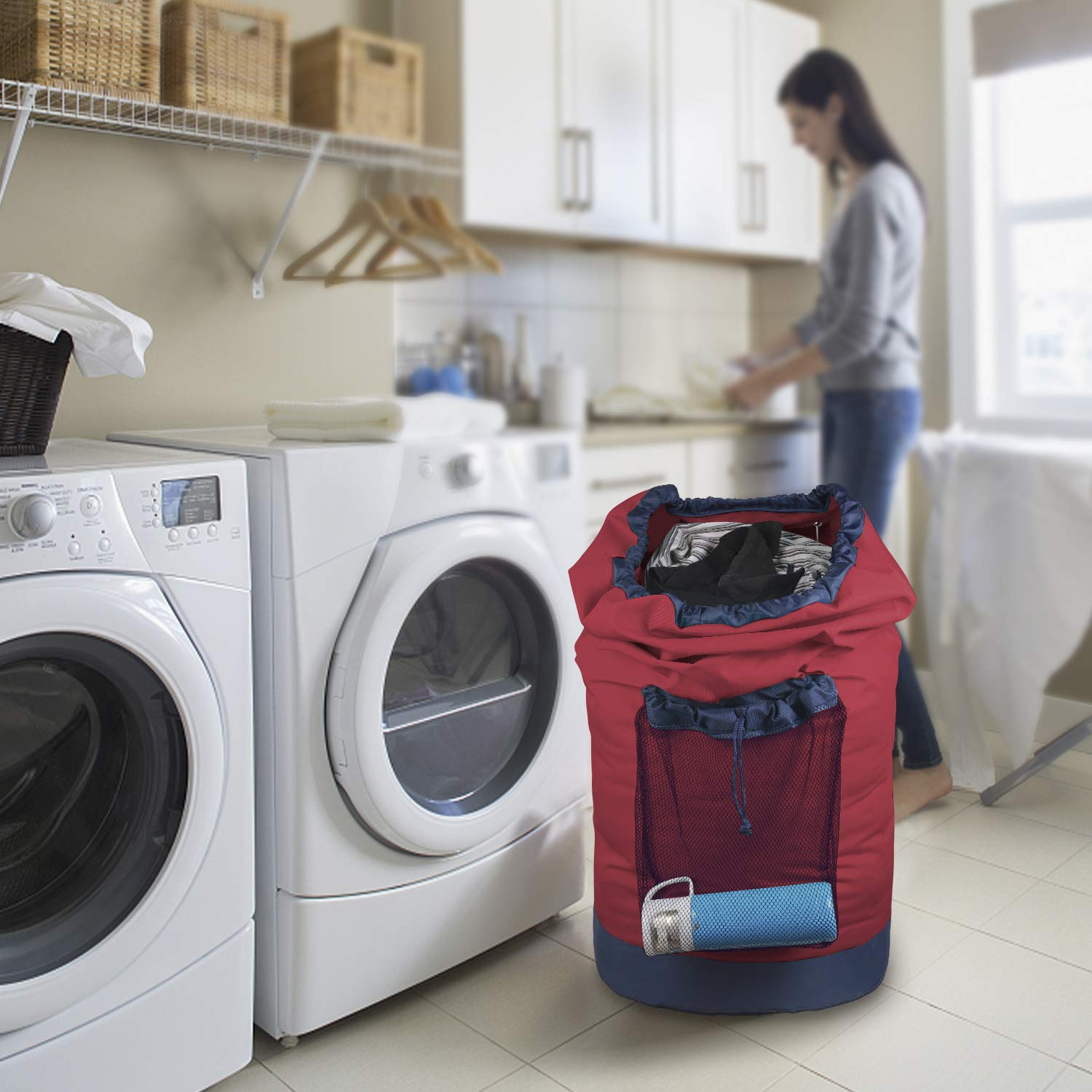 EXTERNAL MESH POCKET AND INNER POCKET WITH ZIPPER - Designed with front mesh pocket(13" x 9") with drawstring closure, provide extra storage space for laundry detergent or fabric softener. And inner pocket (6.3" x 7") with zipper for cell phone, coins or cash change.