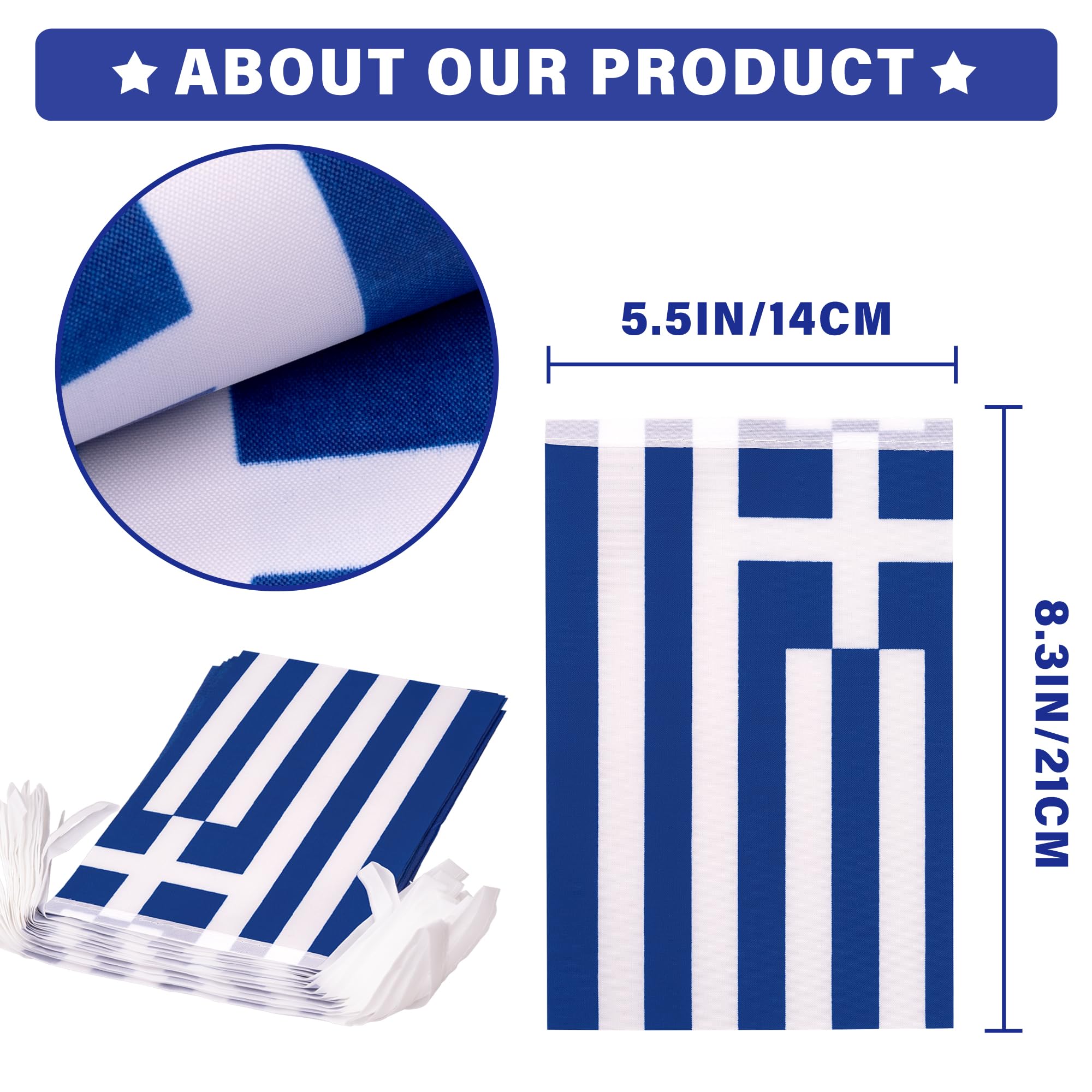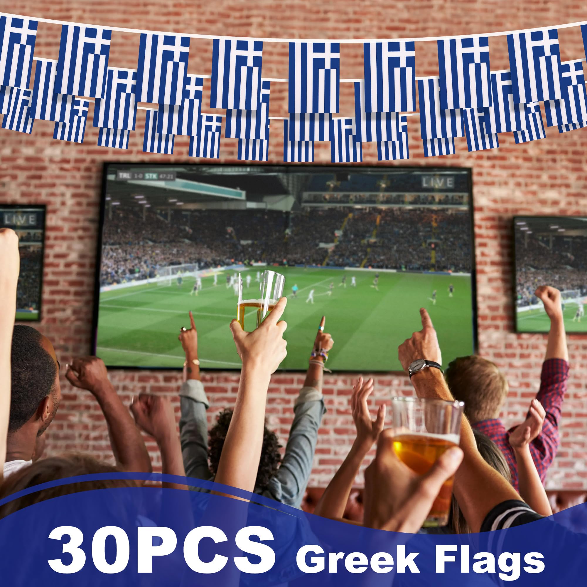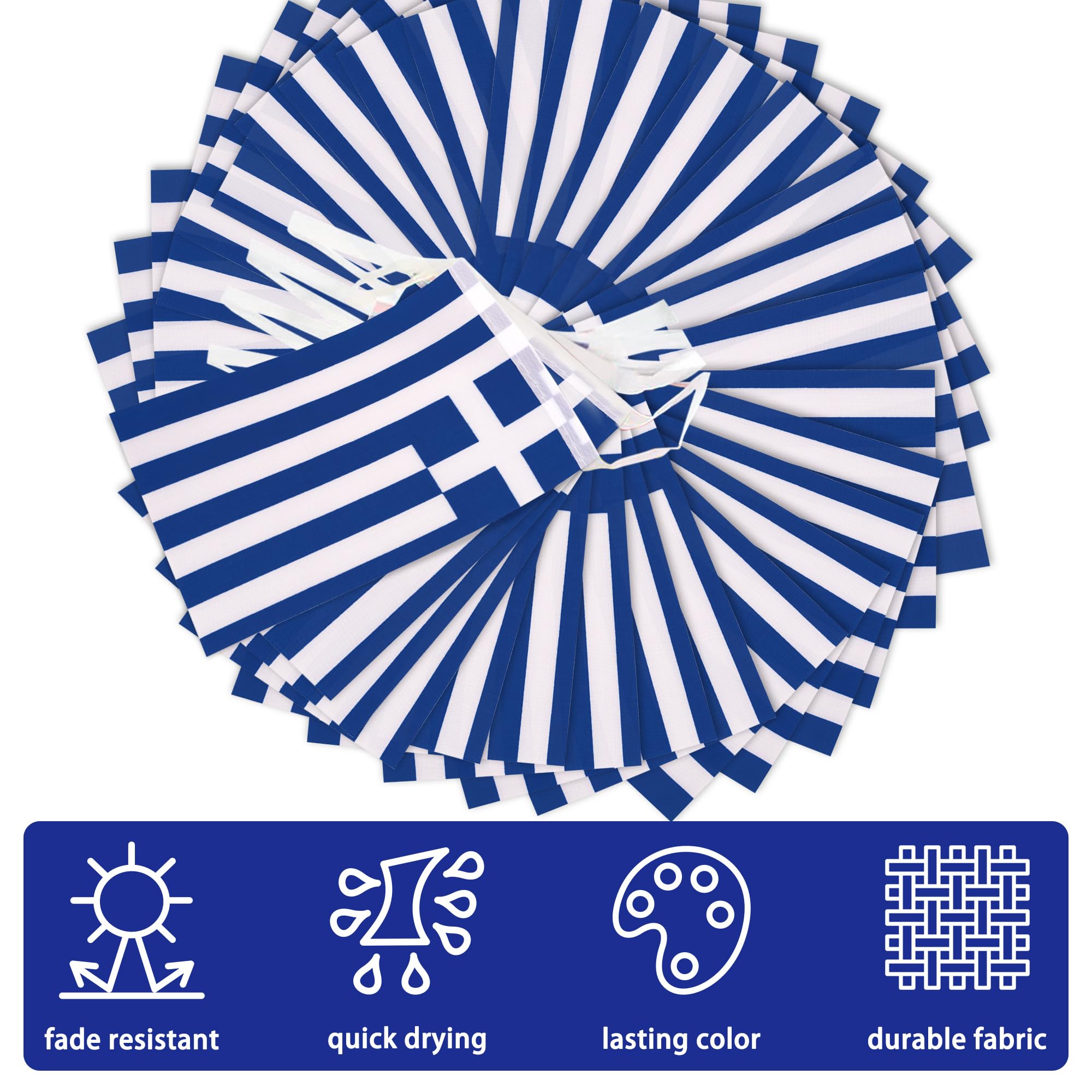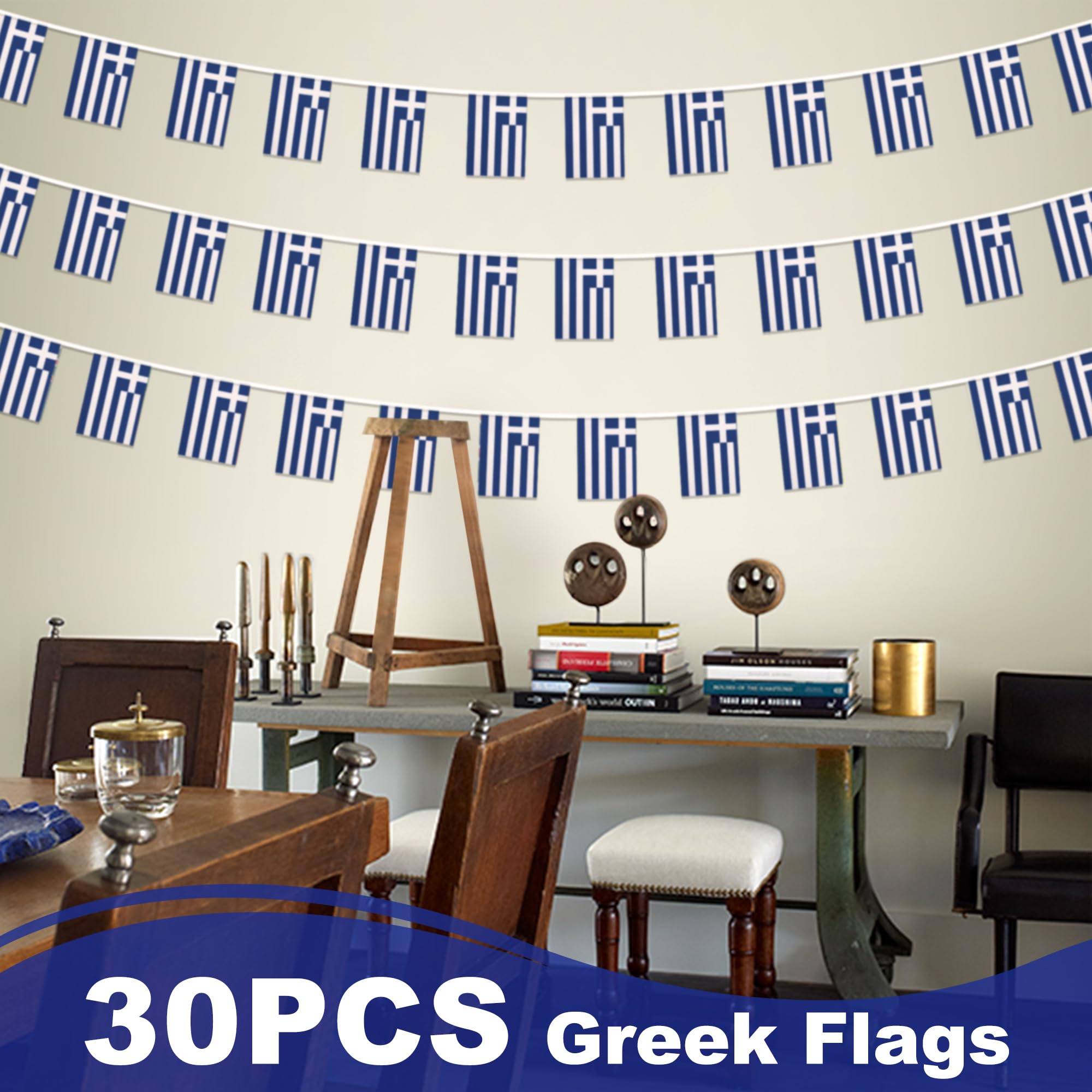 【Specifications】Each string is approximately 33 feet long. Includes 30 pcs Greek flags. Each flag is approximately 5.5 in wide and 8.2 in long.