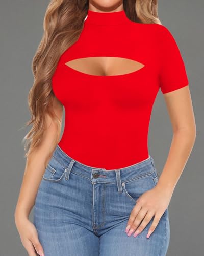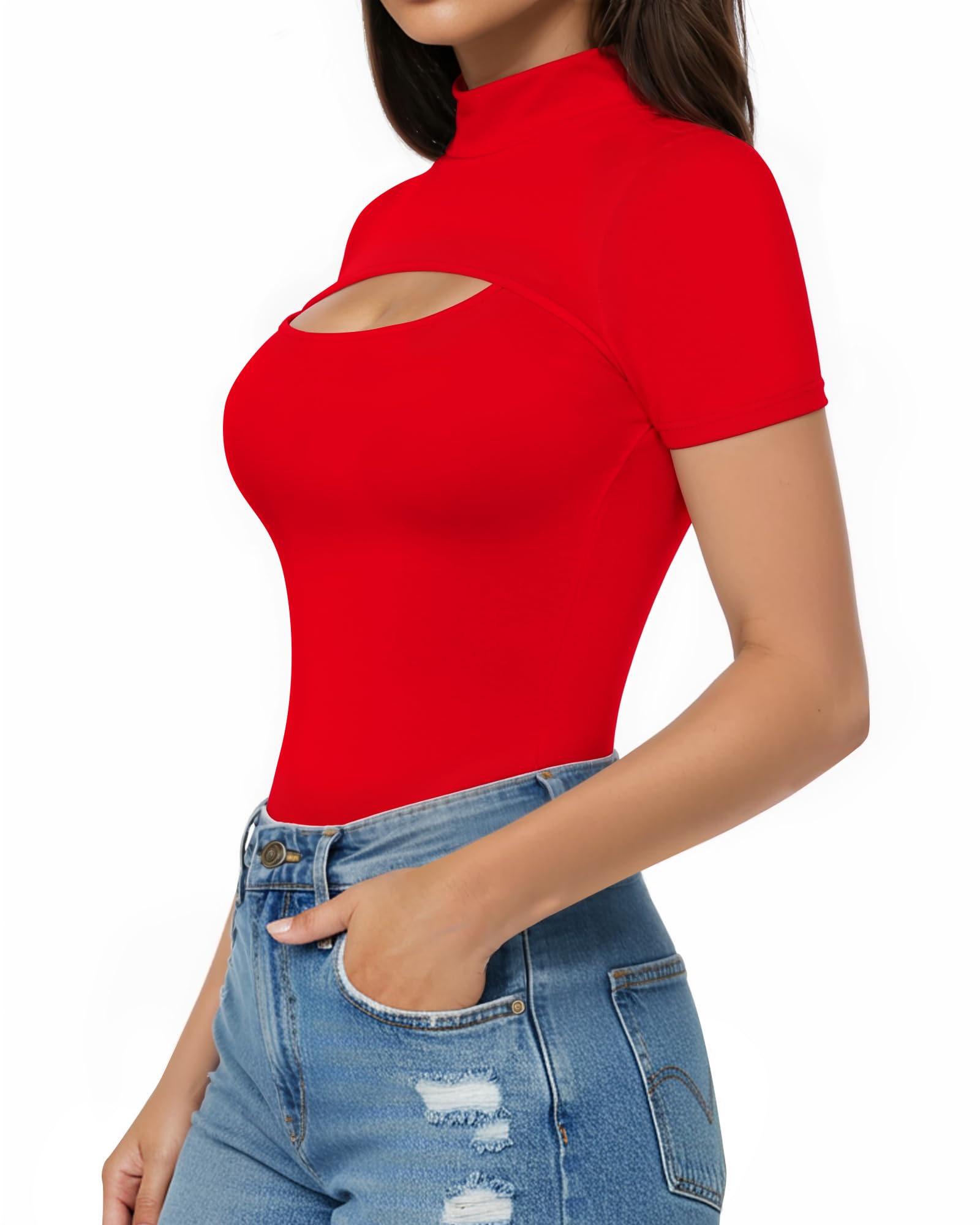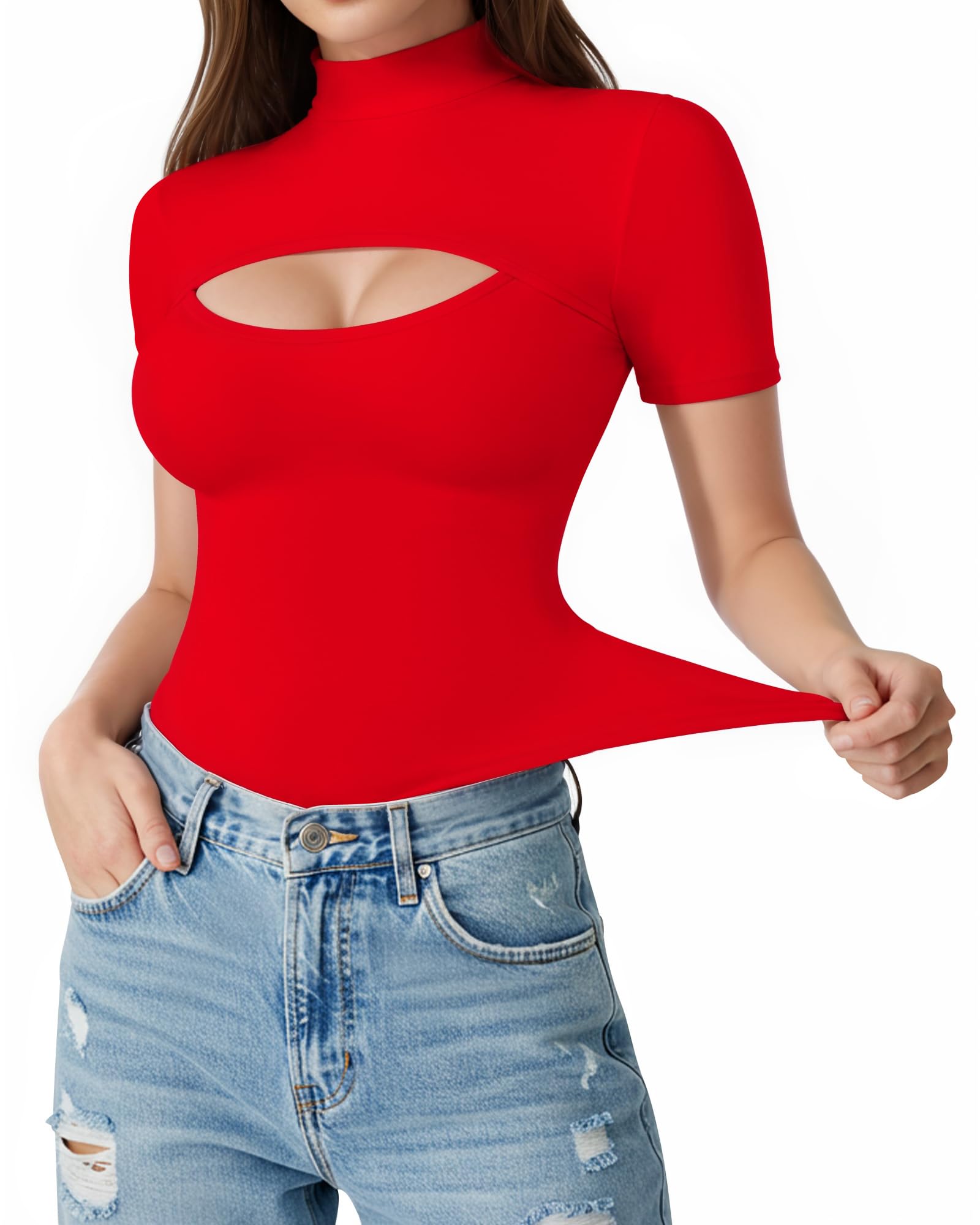 Cut Out Front Design: Womens short sleeve tops feature a sexy cutout front design, showcasing charming cleavage and enhancing the overall allure of women.The addition of a mock turtle neck make you look very compatible
