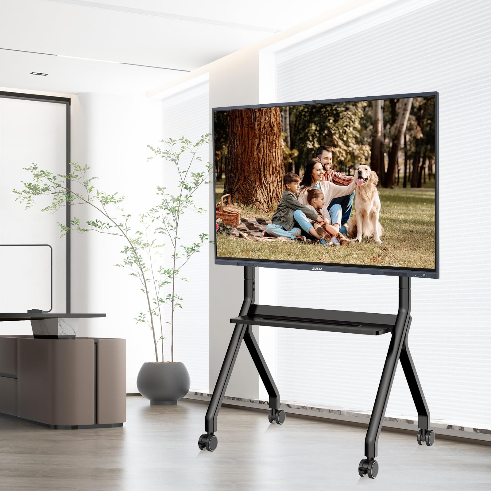 Rolling Stand: Equipped with sturdy castor wheels, the mobile stand lets you make any room a dynamic meeting space with your JAV smart board.