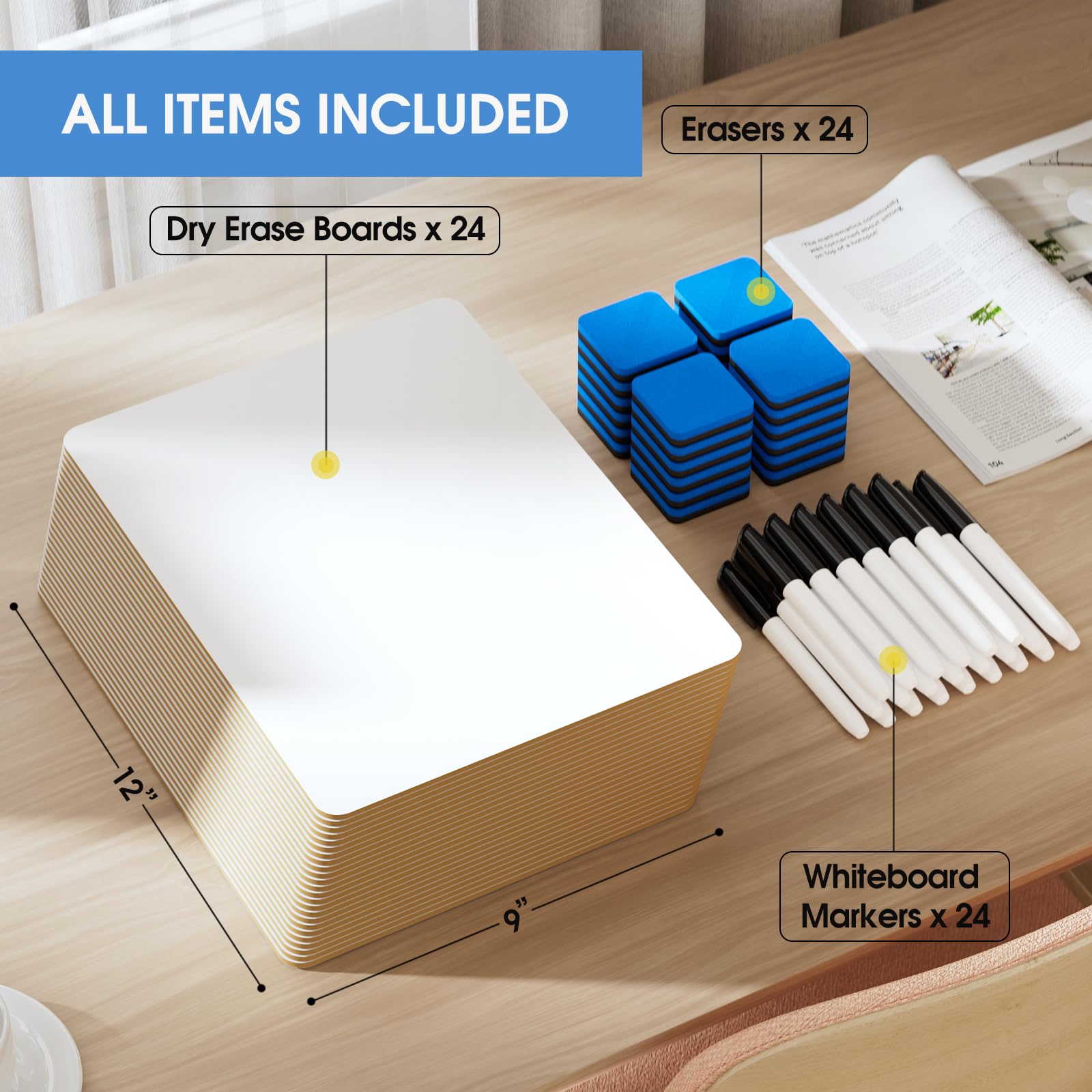 Complete Dry Erase Board Set - Includes 24 reusable whiteboards, 24 whiteboard pens, and 24 erasers - a great solution that replaces paper notepads and reduces waste, and the all-in-one set offers a convenient, one-stop solution