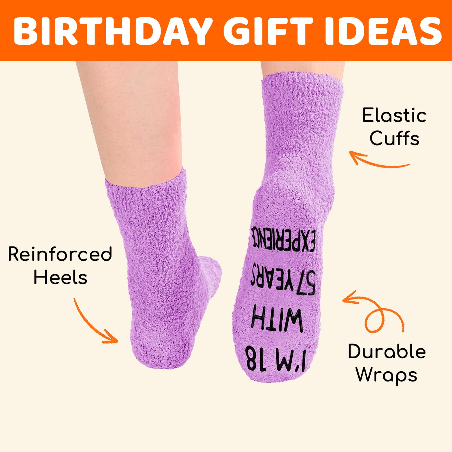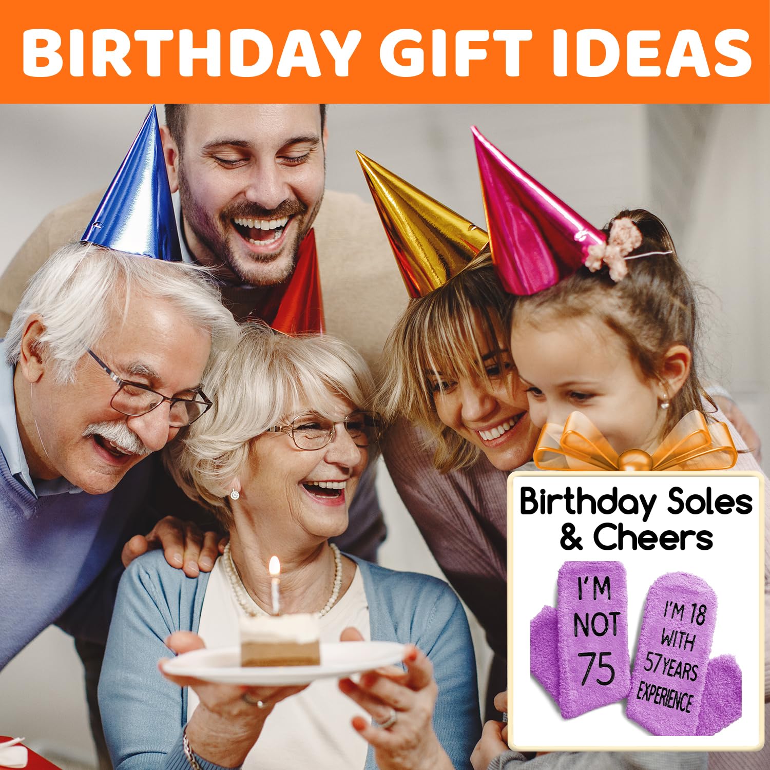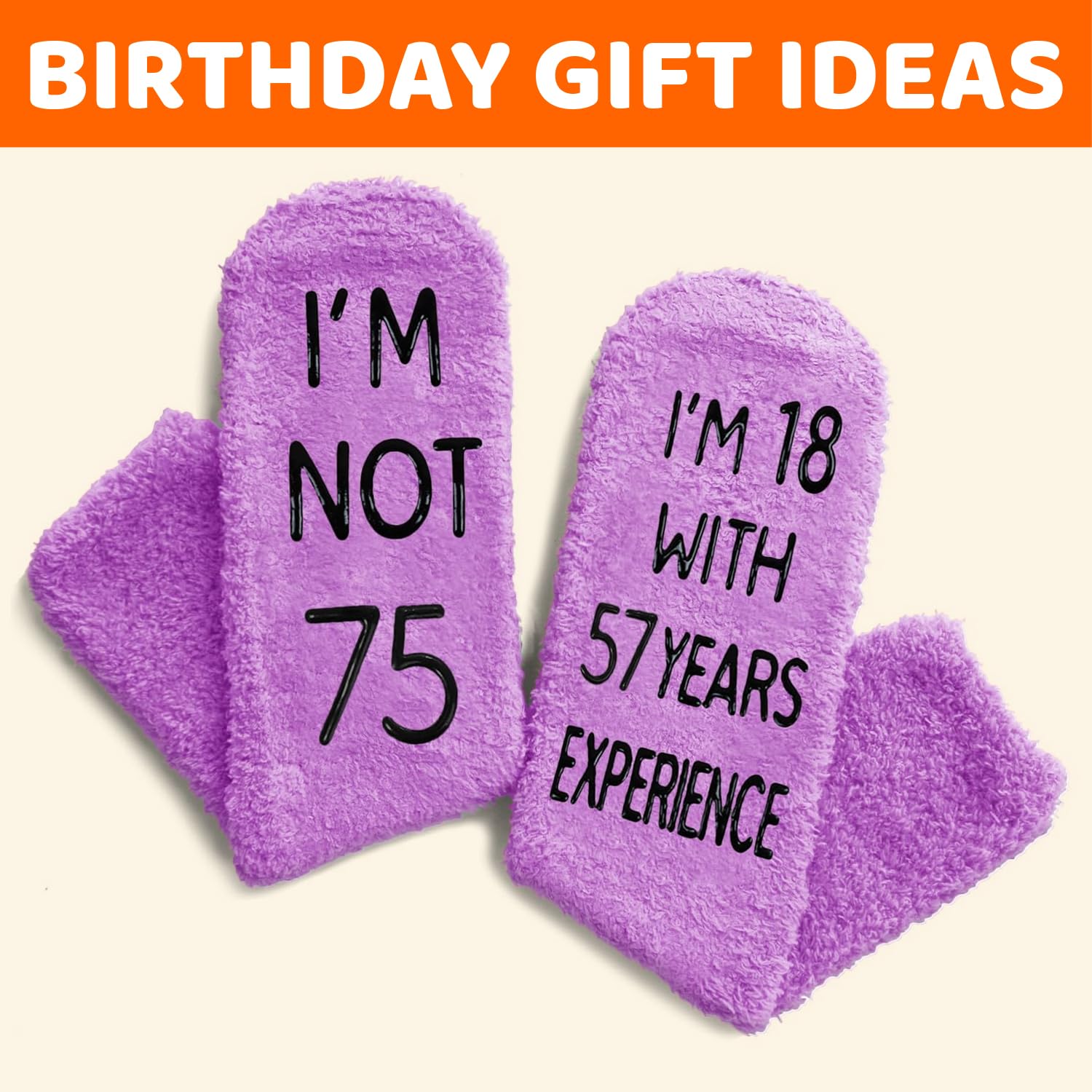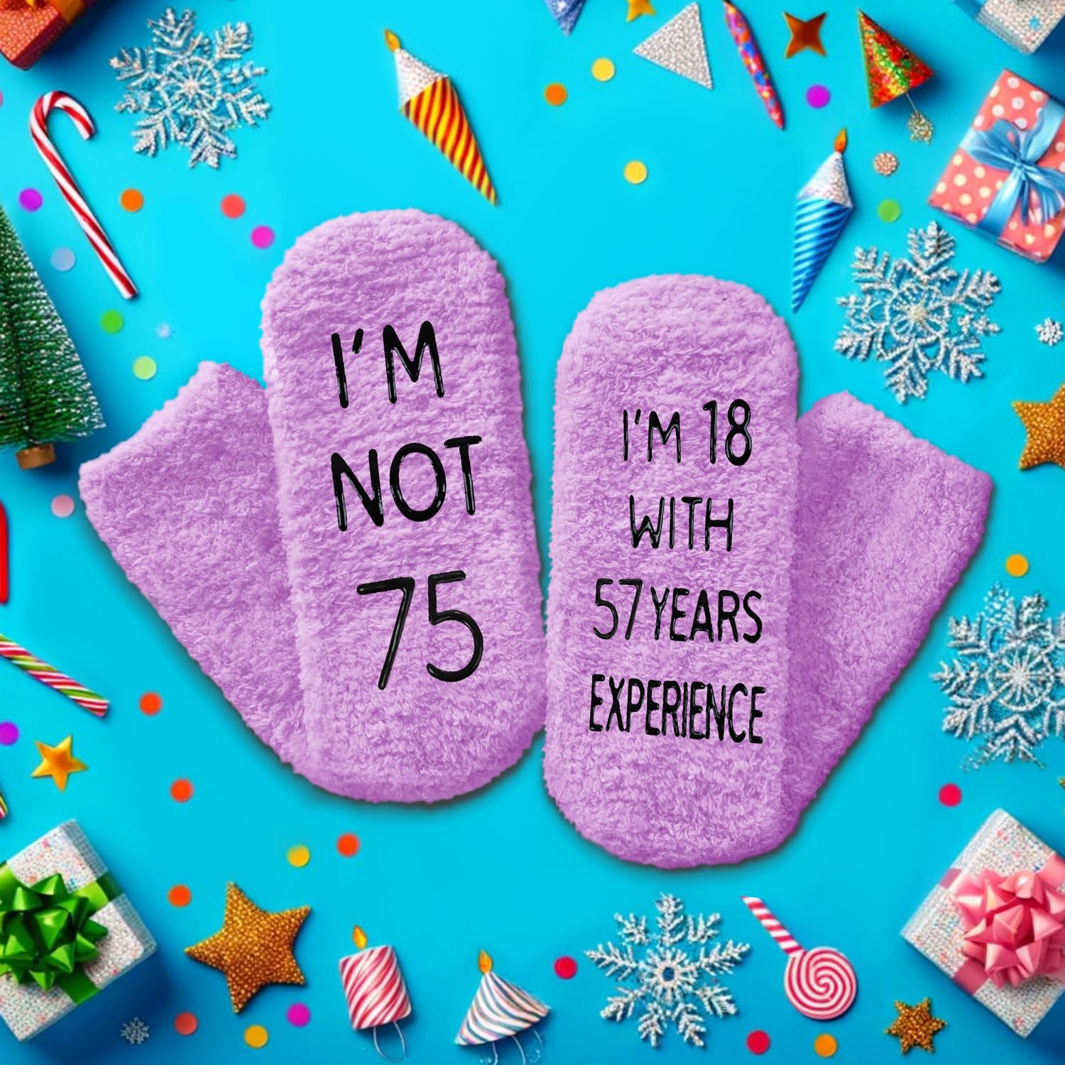 GIFTS FOR HER: Say it with socks - "I'M NOT 75, I'M 18 WITH 57 YEARS EXPERIENCE." These are suitable for any holiday gifts, such as Birthday gifts, White Elephant gifts, Christmas gifts.