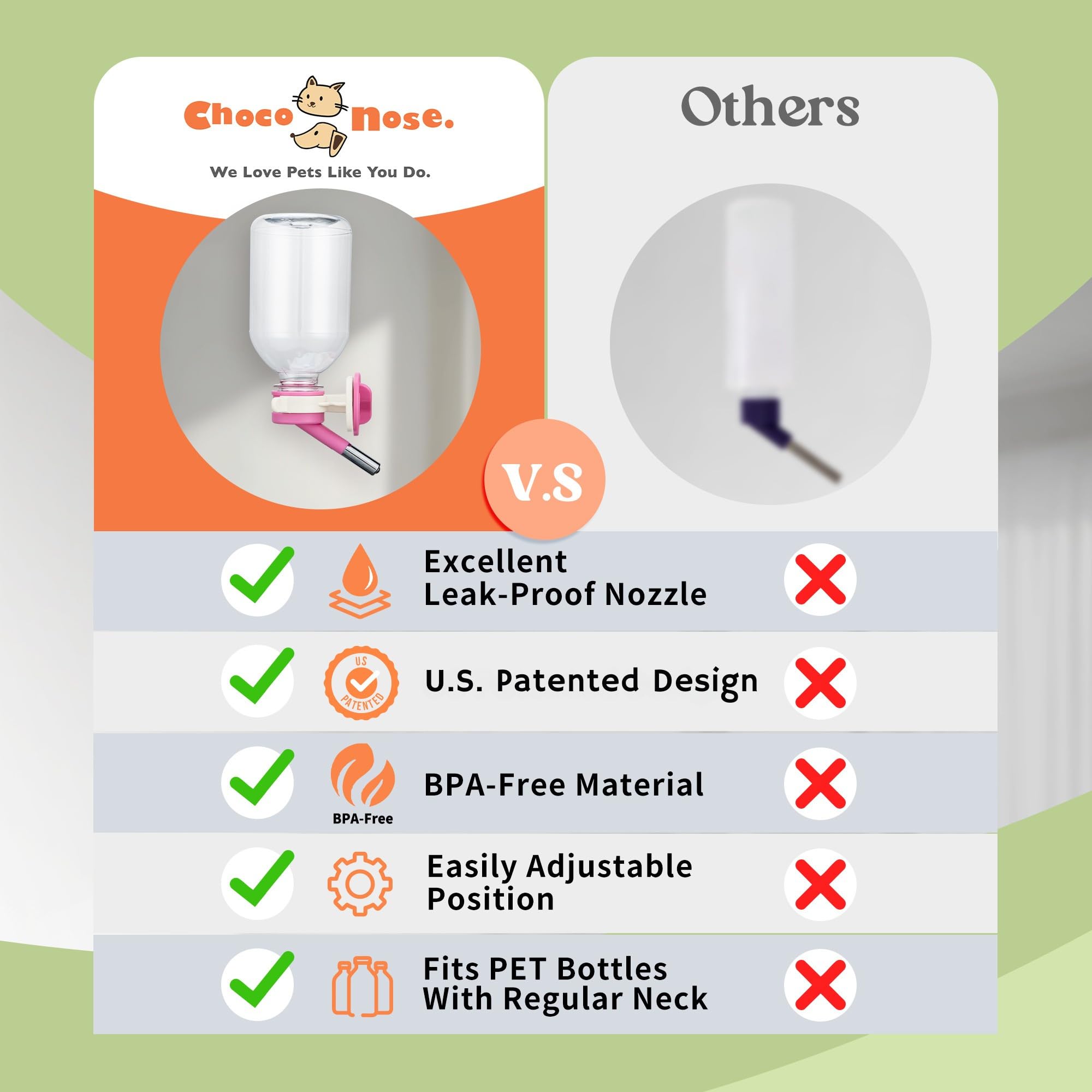 🐾 Why Choco Nose Water Bottle? Are You Tired of Changing the Wet Bedding for Your Pet Cage? This Is The Best Small Pet Water Bottle For Your Beloved Pets. Providing A Wet-Free and Mess-Free Living Area For Your Furry Kids Is Very Essential. Choco Nose U.S. Patented Leak Proof Nozzle Can Prevent Water Leakage Effectively. Our Innovative Design Allows Your Pets to Enjoy Clean and Fresh Water While Keeping Your Home Clean and Dry.