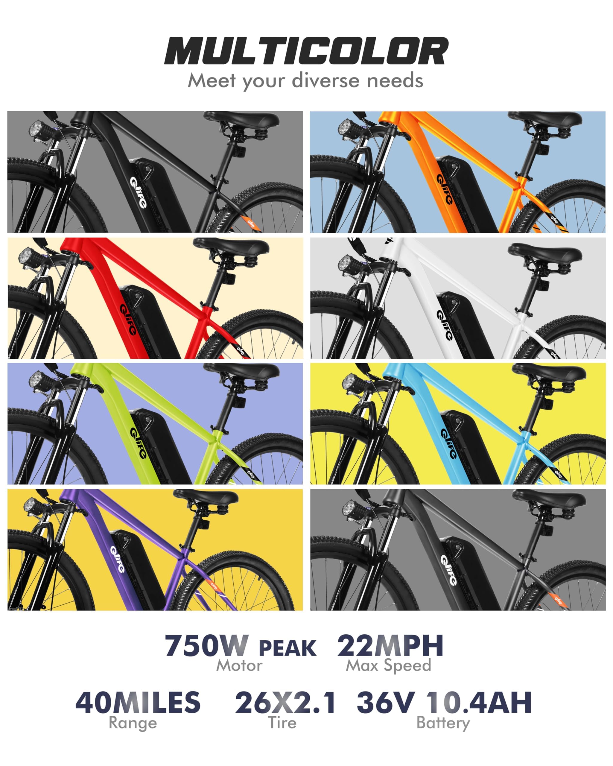 The youthful and stylish commuter e-bike features four riding modes, including a Peak 1000W/750W brushless motor, reaching speeds of up to 25MPH/22MPH, 26''X2.1 tires. In addition to manual, pedal-assisted, and pure electric modes, a walking-assist mode has been added to cater to the needs, enabling easy navigation through various terrains, including hilly areas, for commuting, traveling, and sightseeing.