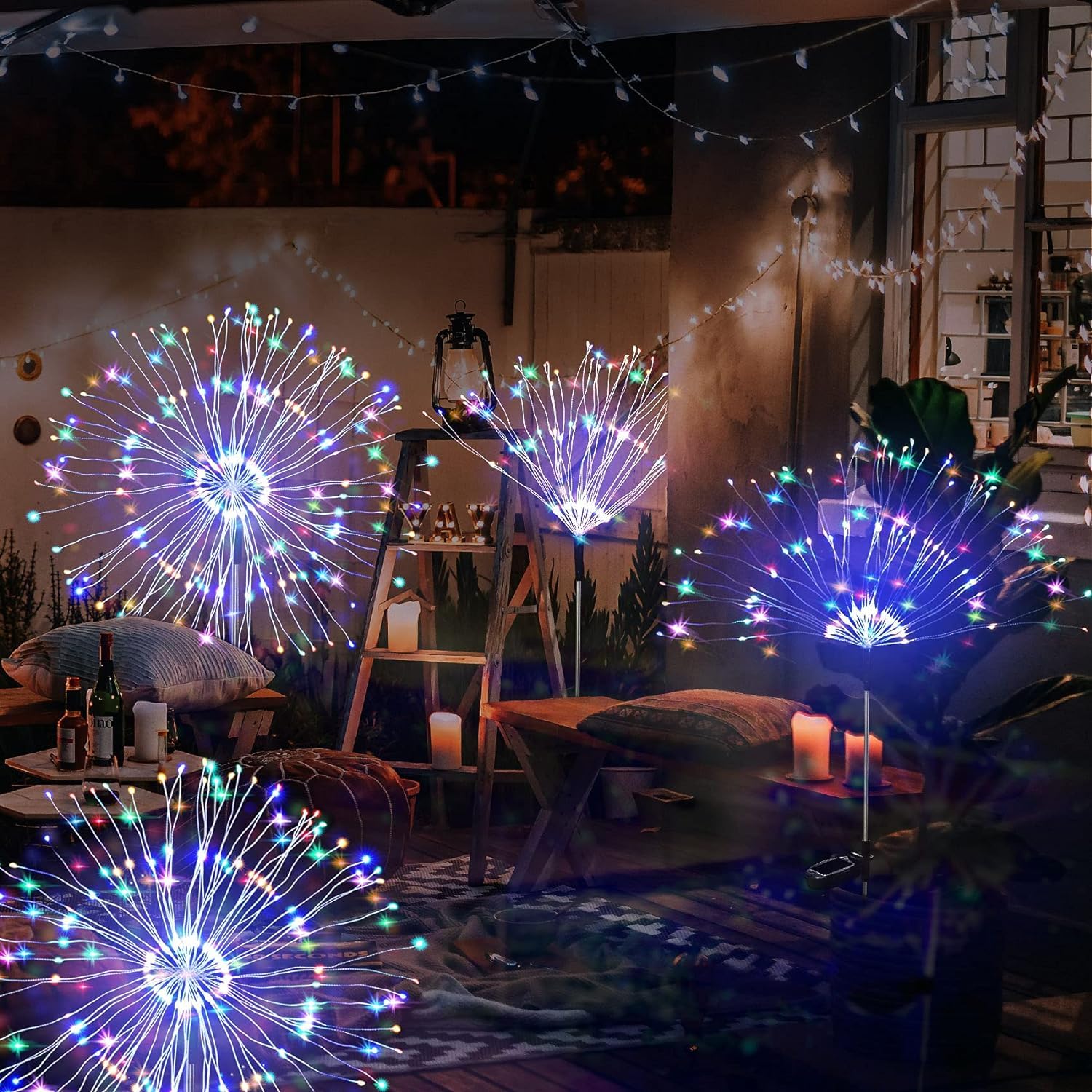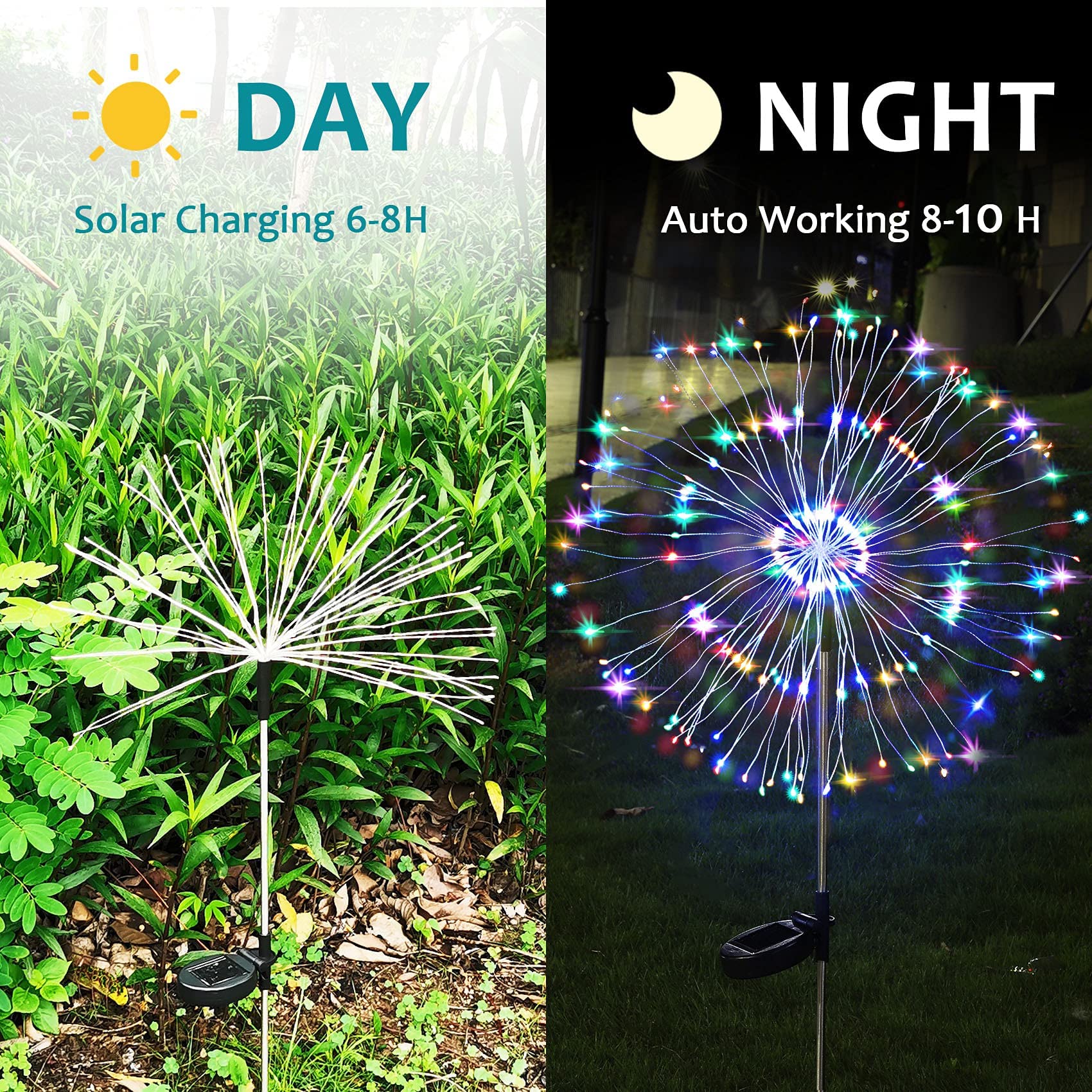 Solar Garden Lights Outdoor Decoration Fireworks Our garden lights use 50 High-quality copper wires, These copper wires are flexible and could be easily curled to meet your needs. These copper wires are flexible, decorate your room to enjoy the atmosphere of relaxing, memorize your important moment in the wedding. Also suitable for the shop, school, garden decoration. Feature: - Waterproof class is IP65; they work well under all kinds of weather, no worries about exposing to rain or snow. - DIY your favorite shapes such as flowers, trees, fireworks, Ferris wheels, hearts, spirals, spheres, etc. - Working modes: STEADY ON / FLASH (Put the switch into “ON”, change different modes use "MODE" button) - Build with automatic light sensor function, the solar lights auto turn on at night. - Decorate any celebrating occasions with these amazing garden lights, Add a romantic, moving atmosphere to your garden Specifications: Brightness: About 150 LM Power: 6W LED quantity: 150 LEDs Material: copper wire + stainless steel + plastic Working Time: 8-10 hours lighting time after 6-8 hours full sunlight charging. Working Mode: Light control,ON / OFF/ Twinkling Tips: 1. If the solar light does not light up when you receive your package, please charging in the sun and then take it to a completely dark room to see whether it will light up, if no, please contact us for replacement. 2. Remove the protective film (Protect panels) on the solar panel before charging 3. Ensure the bottom “ON” when charging 4. Install the solar light outdoors, adjust the angle of the solar panel to make sure it can absorb maximum sunlight 5. IP65 waterproof, but it does not support underwater use. Please do not immerse the product in water. Package: - 2 x LED Solar Firework Lights - 1 x User manual