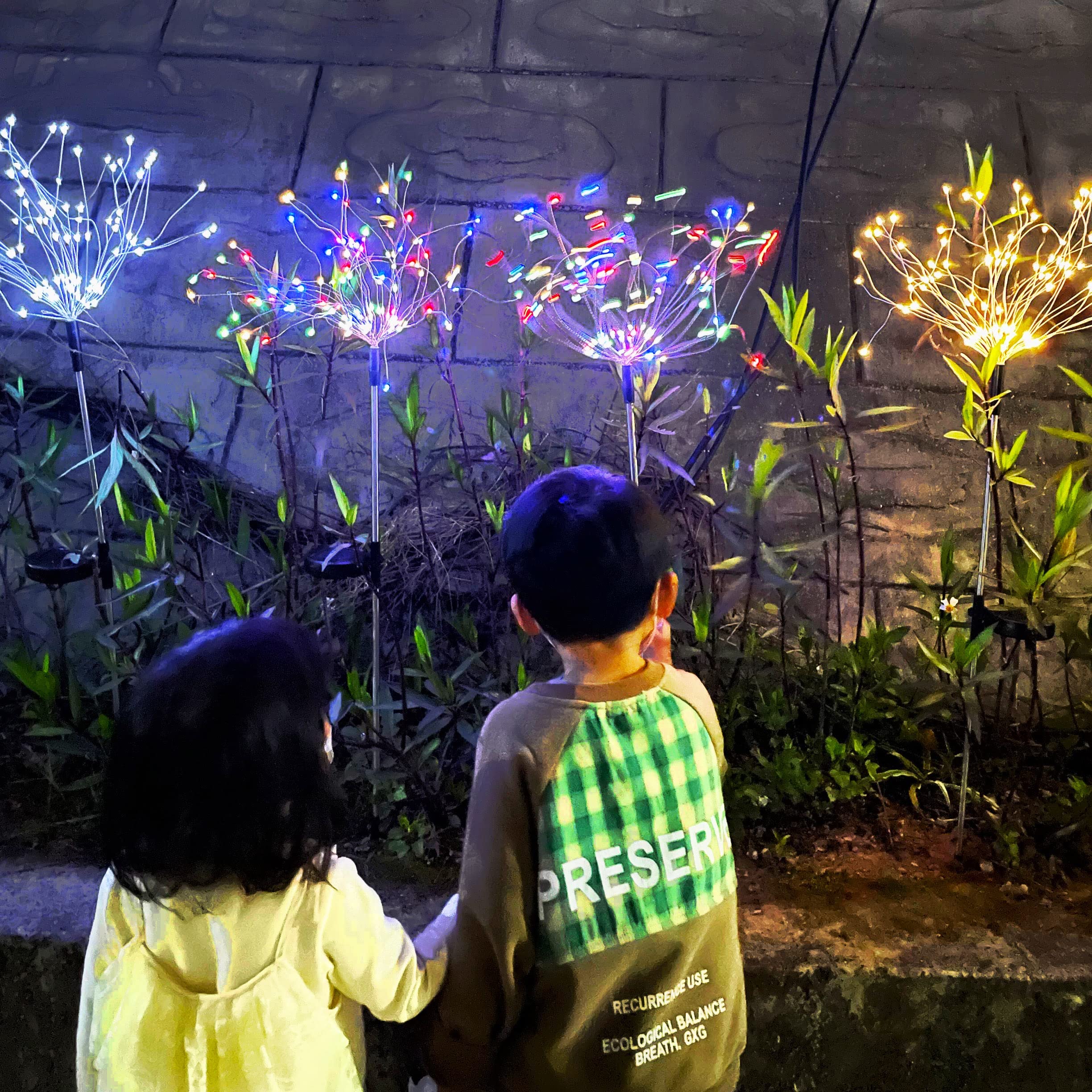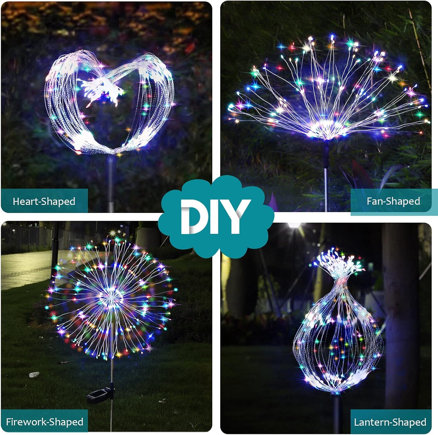 【Creative Solar Garden Lights】2 Pack, Each stake has 150 LEDs distribution in 50 branches copper wire, 2 lighting modes ( twinkling / steady on). Solar firework light is made of flexible copper wire with bright LED beads, and you can bend any shape you want to decorate pathway yards garden patio