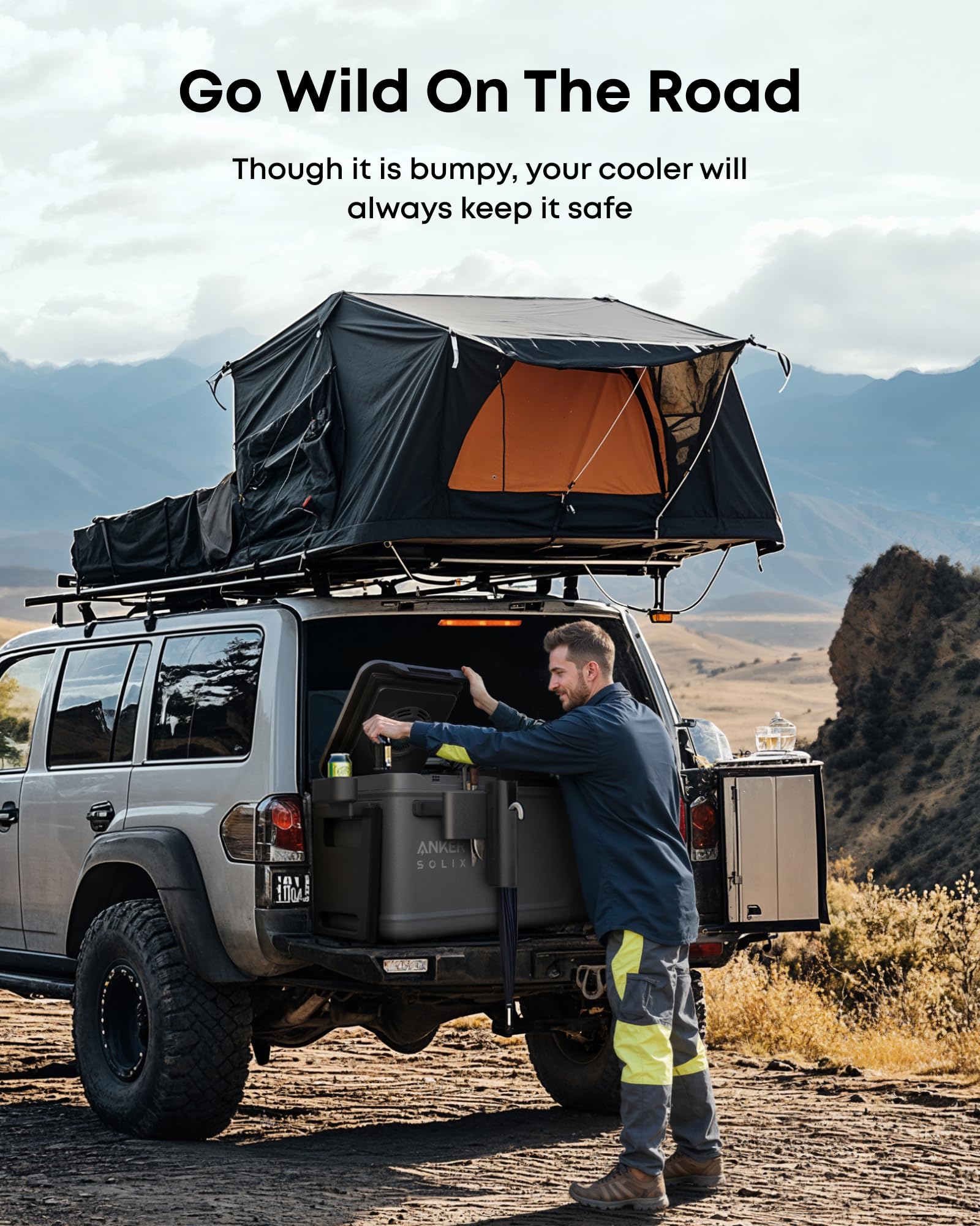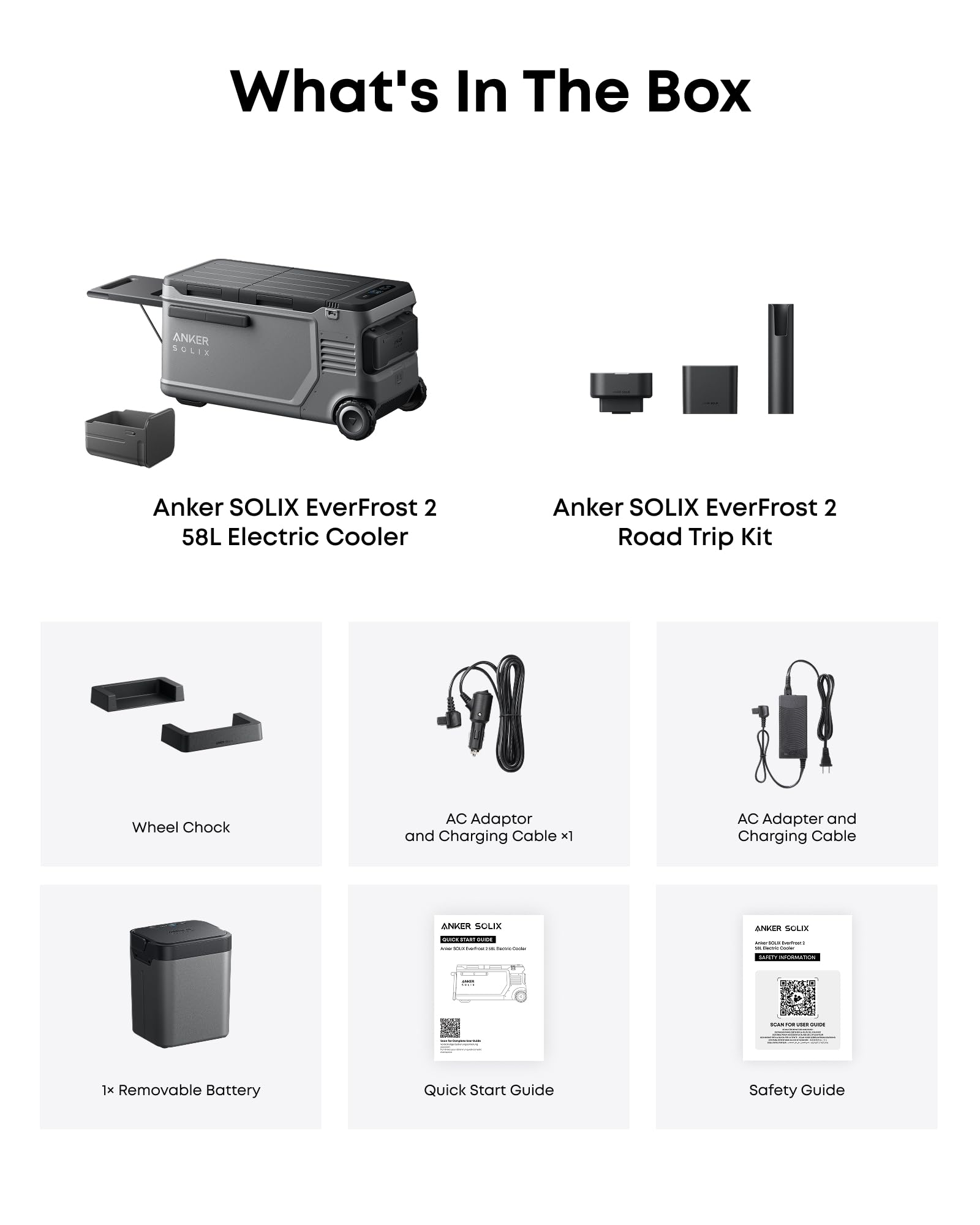 What's in the Box: Anker SOLIX EverFrost 2 Cooler, Road Trip Kit, Removable Battery, AC Adapter and Charging Cable, Car Charging Cable, Accessory Container, Wheel Chock, Safety, and Quick Start Guide.