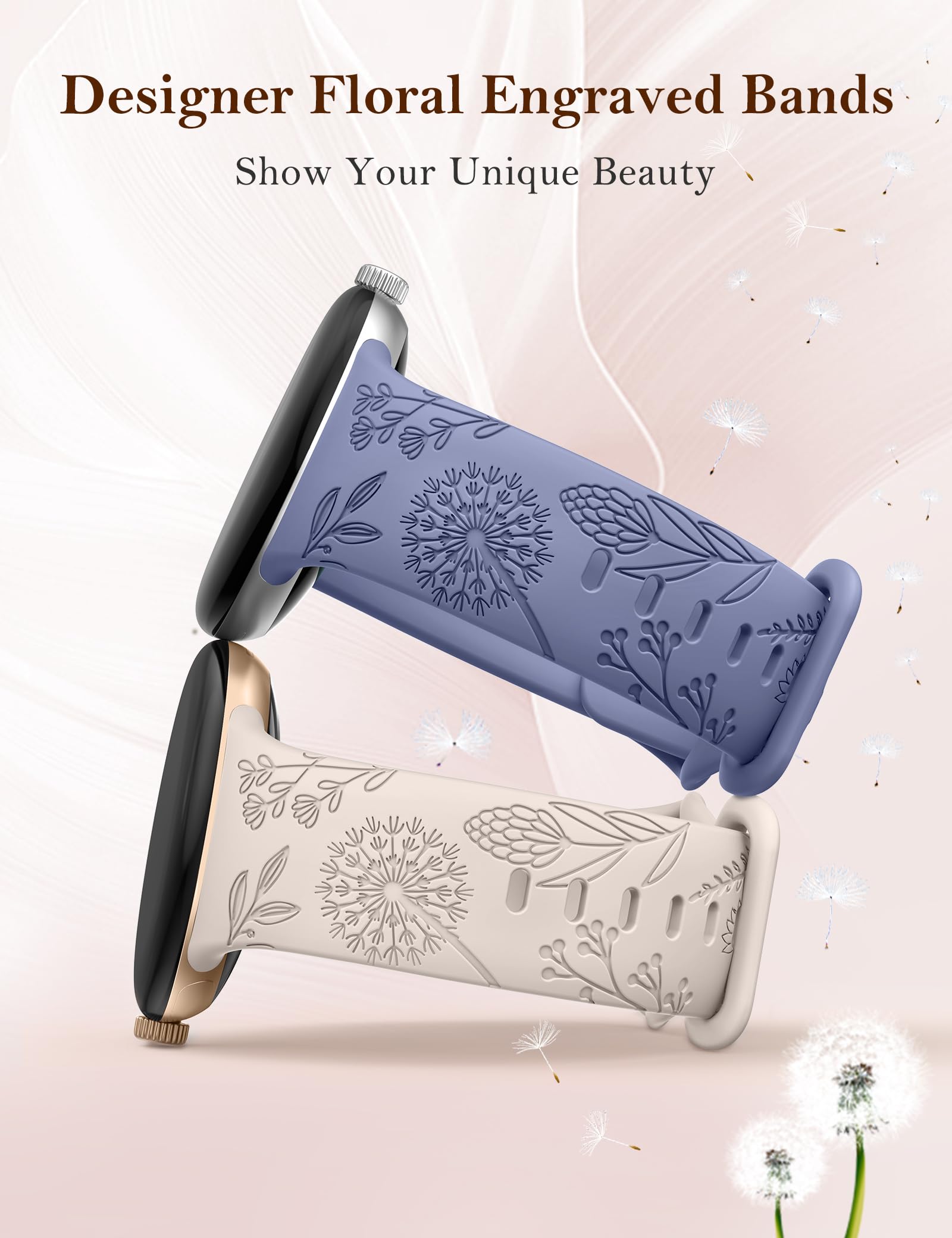 Designer Floral Engraved Google Pixel Watch Bands: Each fancy flower engraved band is made of different wildflower floral and dandelion pattern designs. Wild flowers and dandelions symbolize Fortitude, Growth, Freedom. Let your wishes fly in the vast field of life. like the small flowers of the dandelion, they will fall to the ground to take root and flourish everywhere