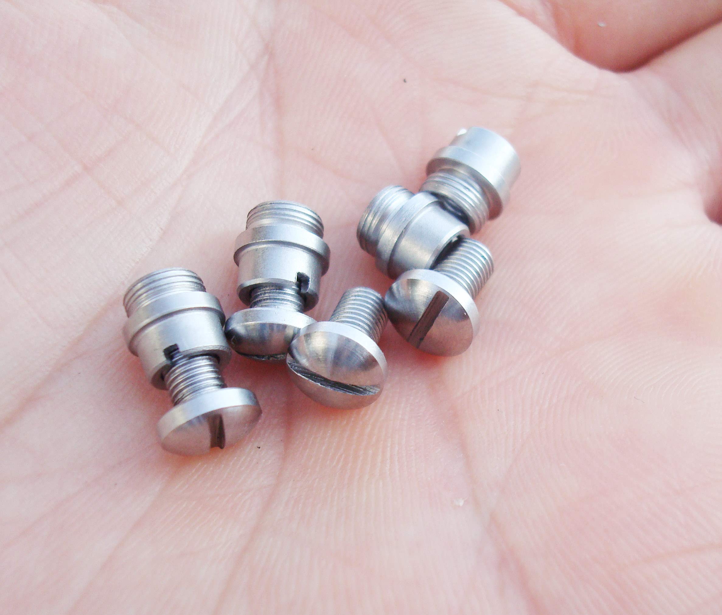 New set of 4 grip screw bushings and 4 grip screws. These are made with top quality stainless steel and close machining tolerances Fits 1911 M1911 Clones 1911A1 and other standard 1911 .45 .38 Precision 1911 Parts: Proudly made, treated and finished for yours 1911 Industries Pro Series 1911 Grip Screws with Bushings Kit. These premium parts are precision CNC machined from solid stainless steel bar stock, heat treated The parts come as pictures, 8 pieces (4 grip screws and 4 bushings). These high quality 1911 grip screws and bushings will work with all standard 1911 models, both full size (government and commander) and compact, and quality clones. THESE ARE PRECISION PARTS, PROUDLY MADE, TREATED AND FINISHED! WE ARE DEDICATED TO PROVIDING ONLY THE FINEST PARTS POSSIBLE.
