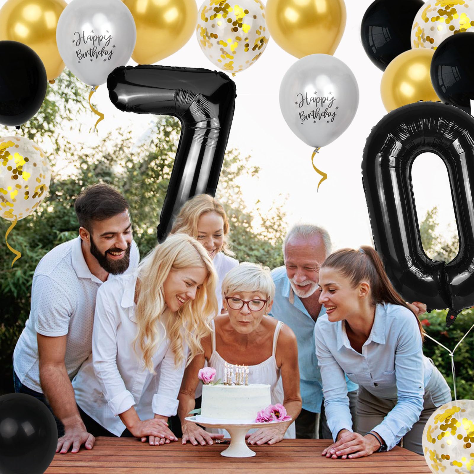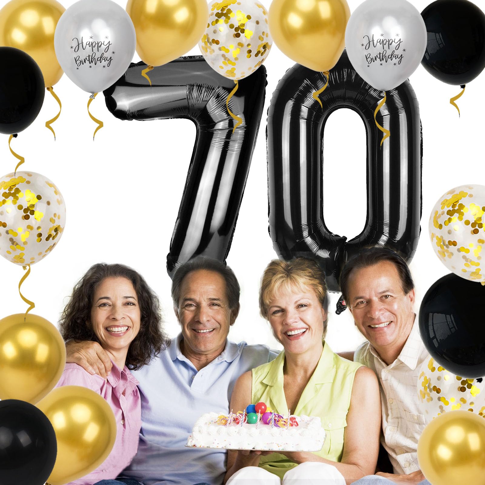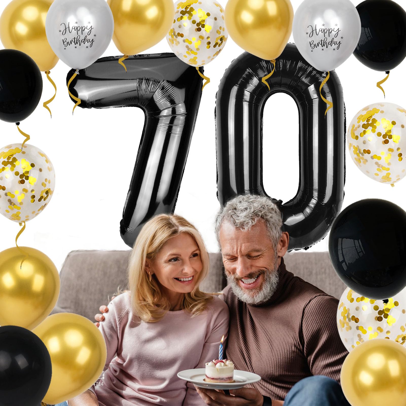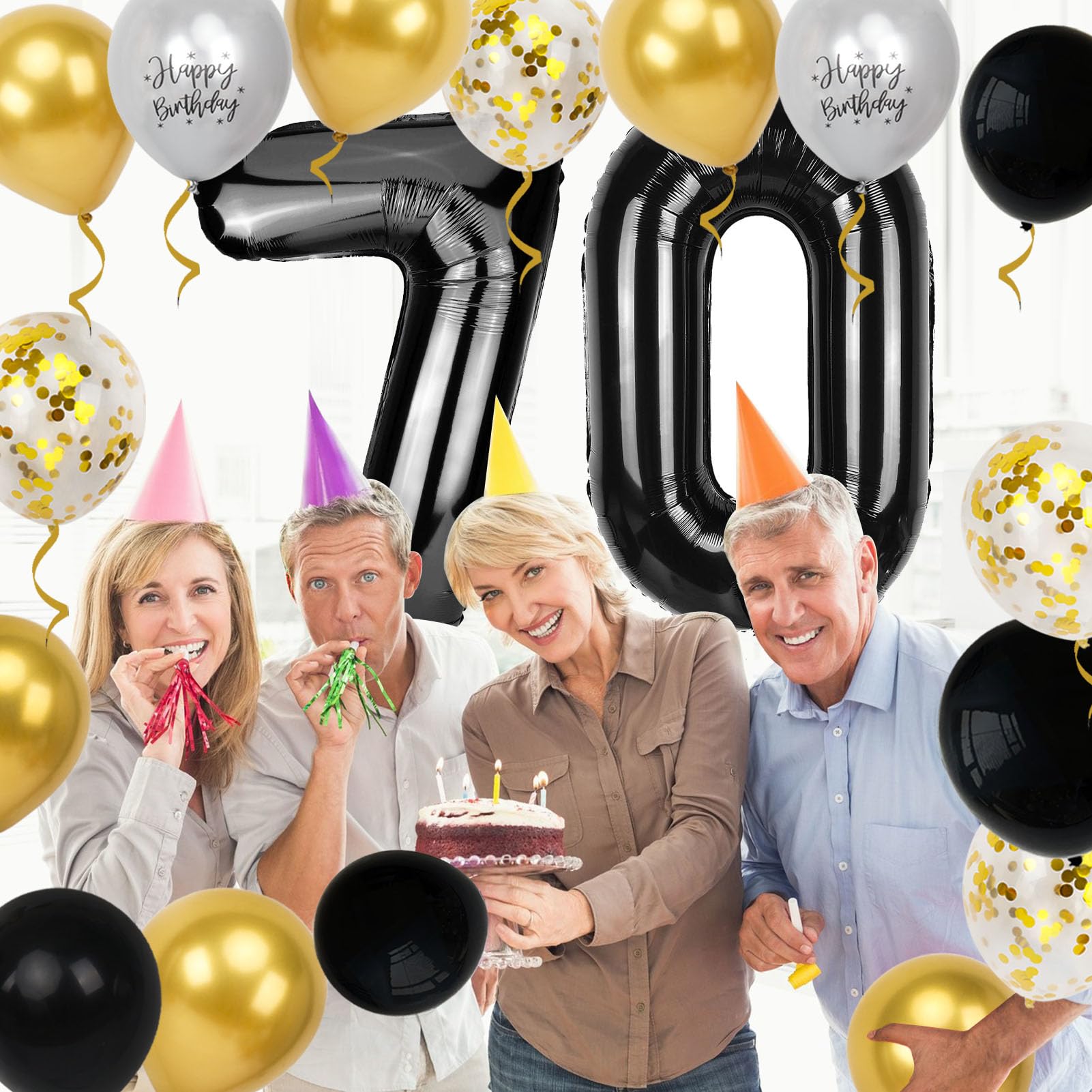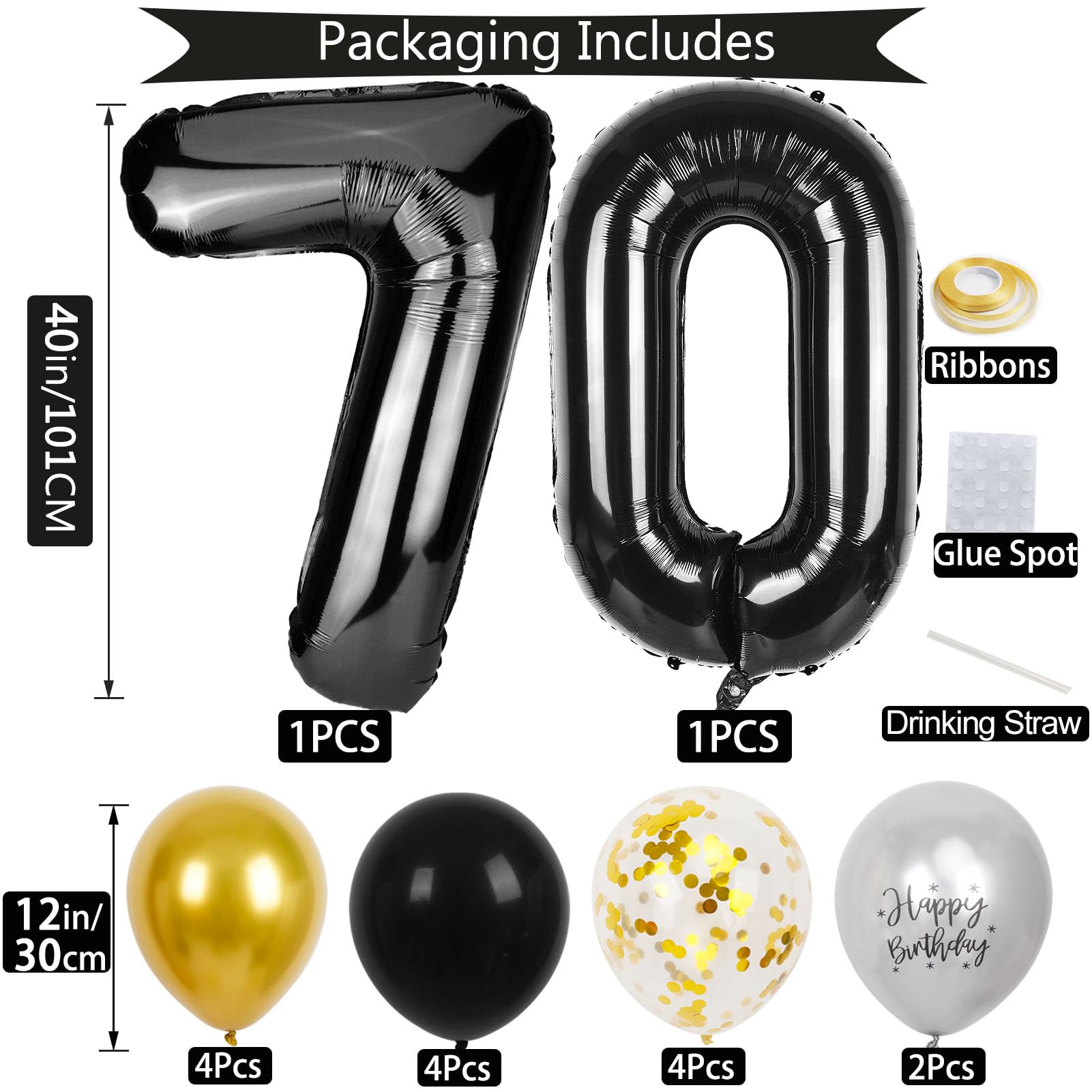70th Birthday Decorations for Men Women Set: Package includes 2 pcs large 40 inch black 70 balloon numbers, 4 pcs 12-inch gold metallic balloons, 4 pcs 12-inch gold confetti balloons, 4 pcs 12-inch black latex balloons, 2 pcs 12-inch silver metallic birthday balloons, 1 gold ribbon, 1 piece of straw 1 sheet of glue dots. This 70th birthday decorations is perfect for celebrating your 70th birthday or 70th anniversary decorations and makes your party even more exciting!