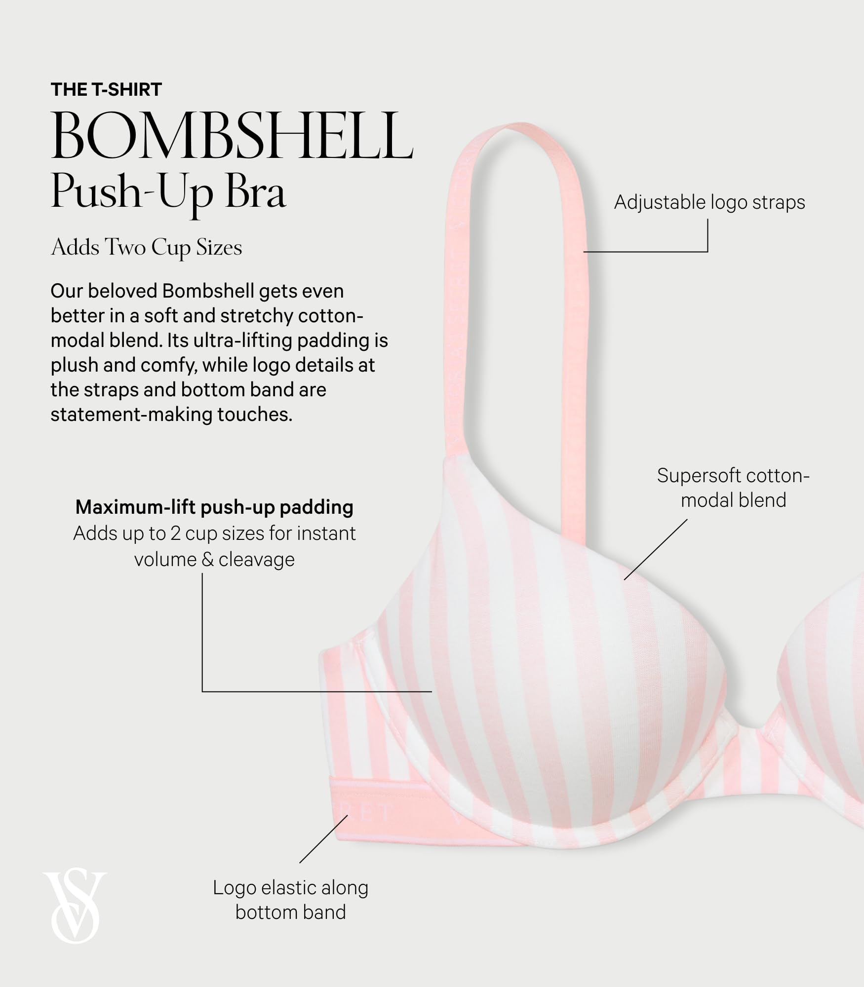 Description Our beloved Bombshell gets even better in a soft and stretchy cotton-modal blend. Its ultra-lifting padding is plush and comfy, while logo details at the straps and bottom band are statement-making touches.
