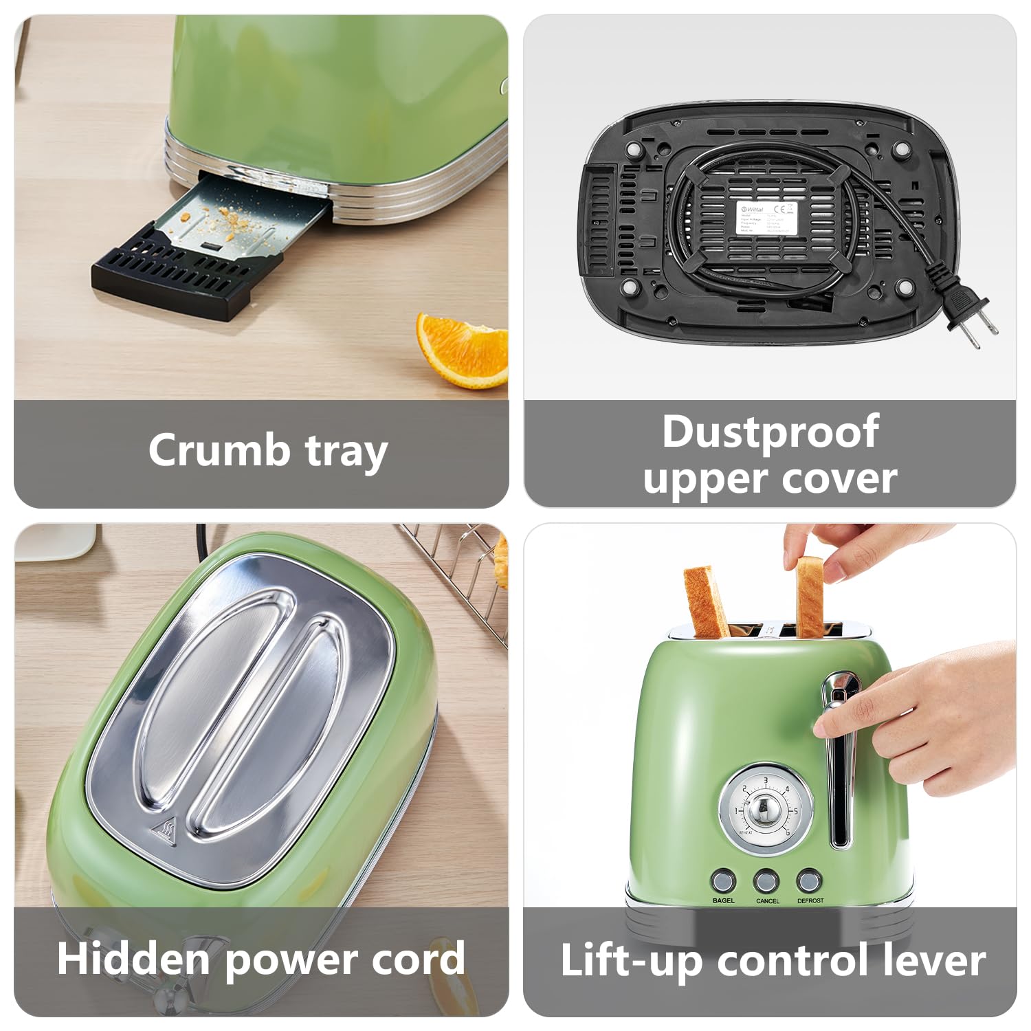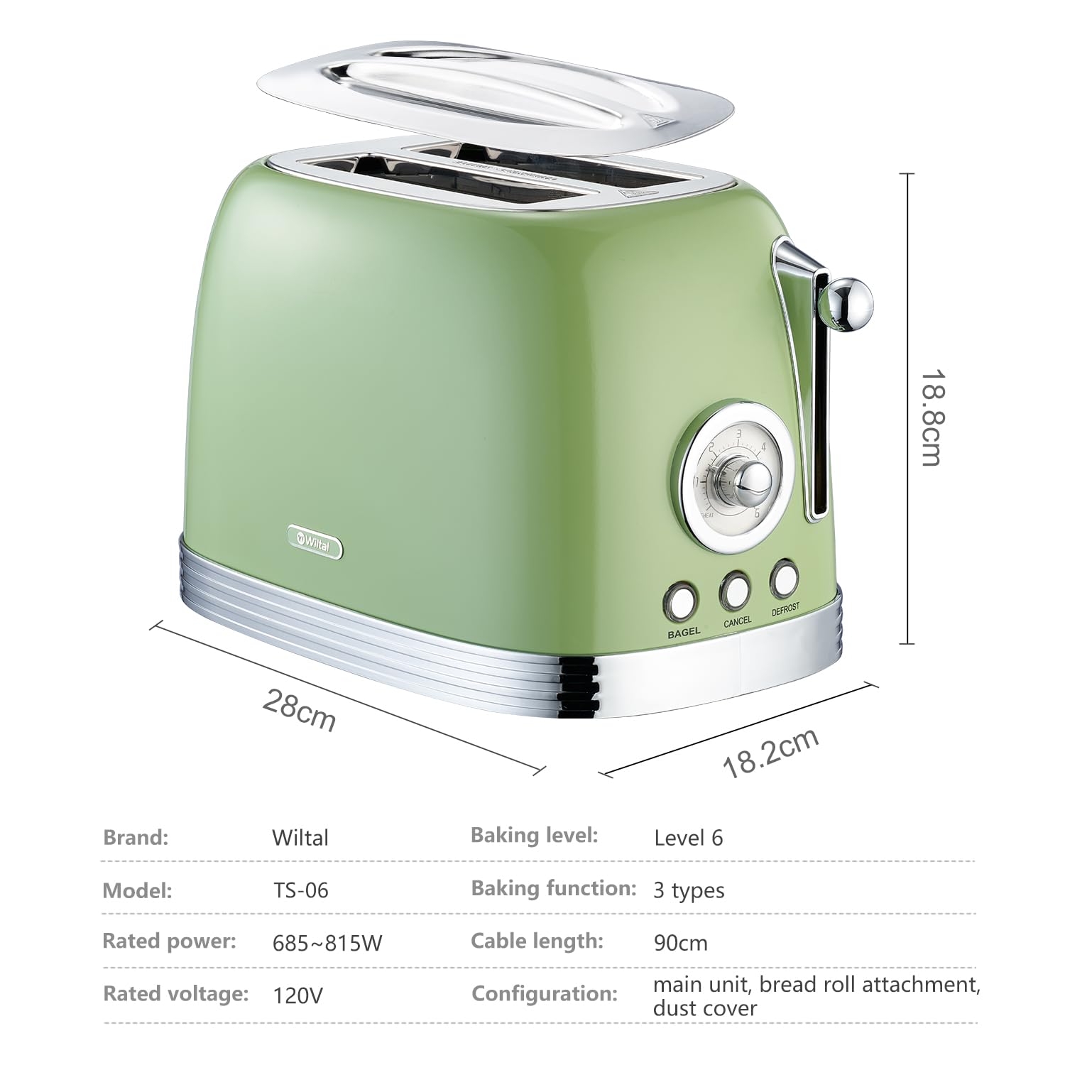 πŸ₯―【𝑹𝒆𝒕𝒓𝒐 𝑻𝒐𝒂𝒔𝒕𝒆𝒓 π’˜π’Šπ’•π’‰ π‘Ύπ’Šπ’…π’† 𝑺𝒍𝒐𝒕𝒔】Wiltal 1.58" wide slots 2 slice toaster with a size of 11 x 7.16 x 7.4inch, our cream retro series toaster features a vintage avocado green. Powered by 685-815W, it includes two wide slots, perfect for Bagels, Thick-sliced Bread, Sandwiches and more. Compact yet versatile, it complements your kitchen countertop.