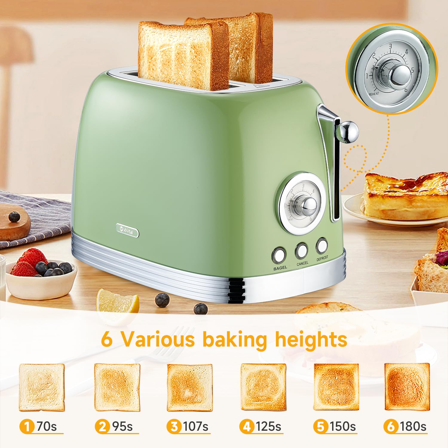 Wiltal Green Cute Retro Toaster 2 Slice with 1.58" Wide Slots, with Stainless Steel Lid, with Warming Rack, Preheat, Defrost, Countdown Timer Display
