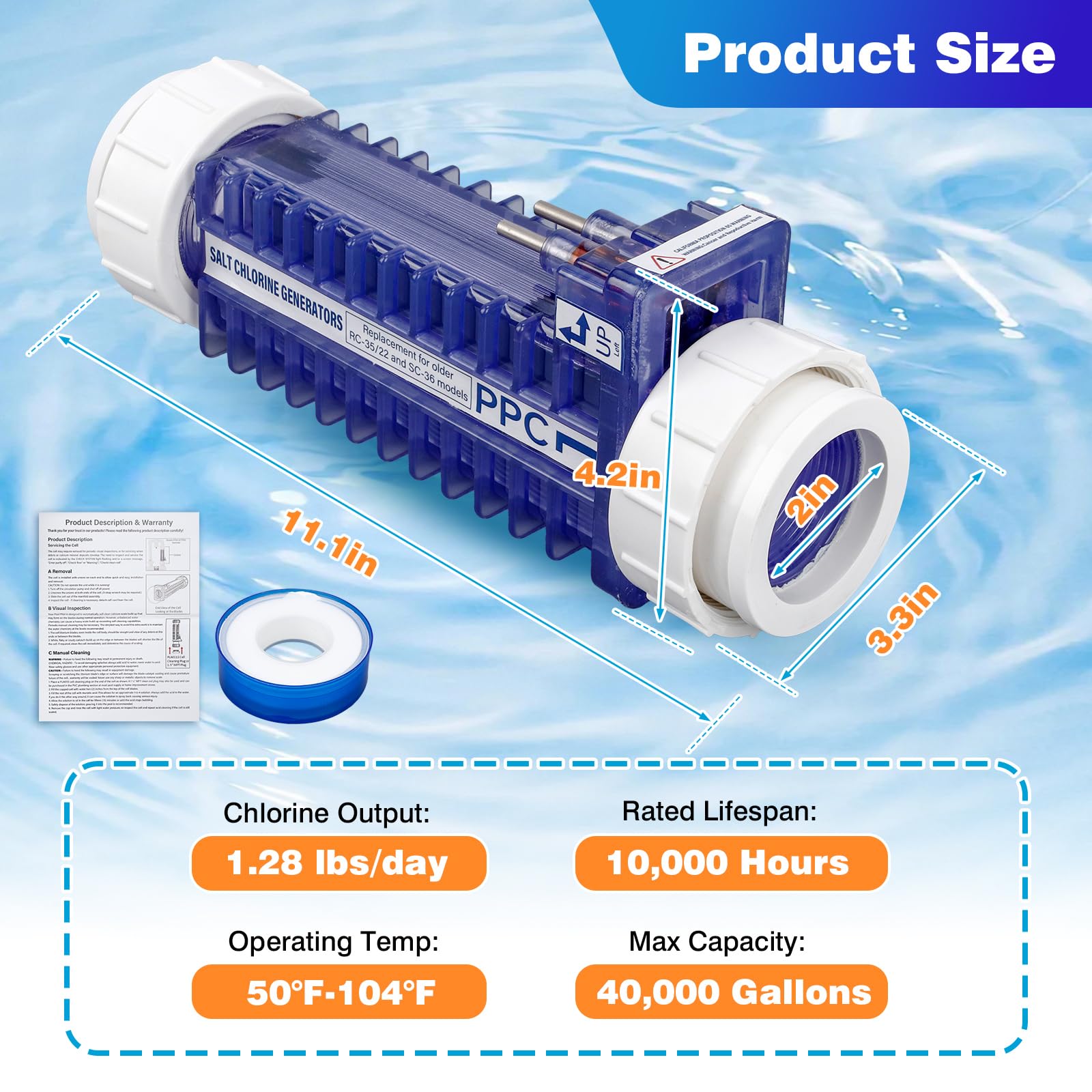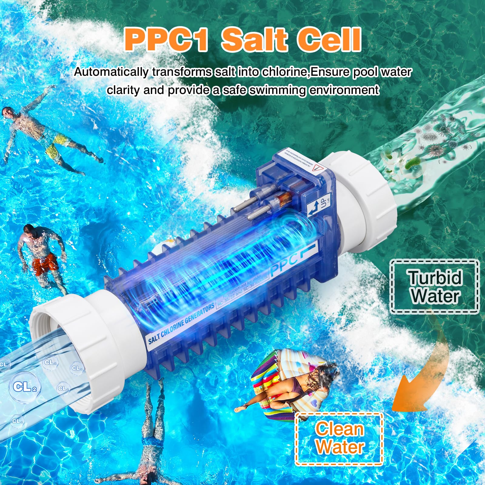 Superior chlorination: PPC1 Salt Cell is the core component of the automatic pool digital chlorinator, which converts salt in the pool into chlorine to provide efficient and continuous disinfection for the water, its 5-blade design produces strong chlorine,Designed for up to 10,000 hours of chlorination performance,guarantees the cleanliness and hygiene of the swimming water