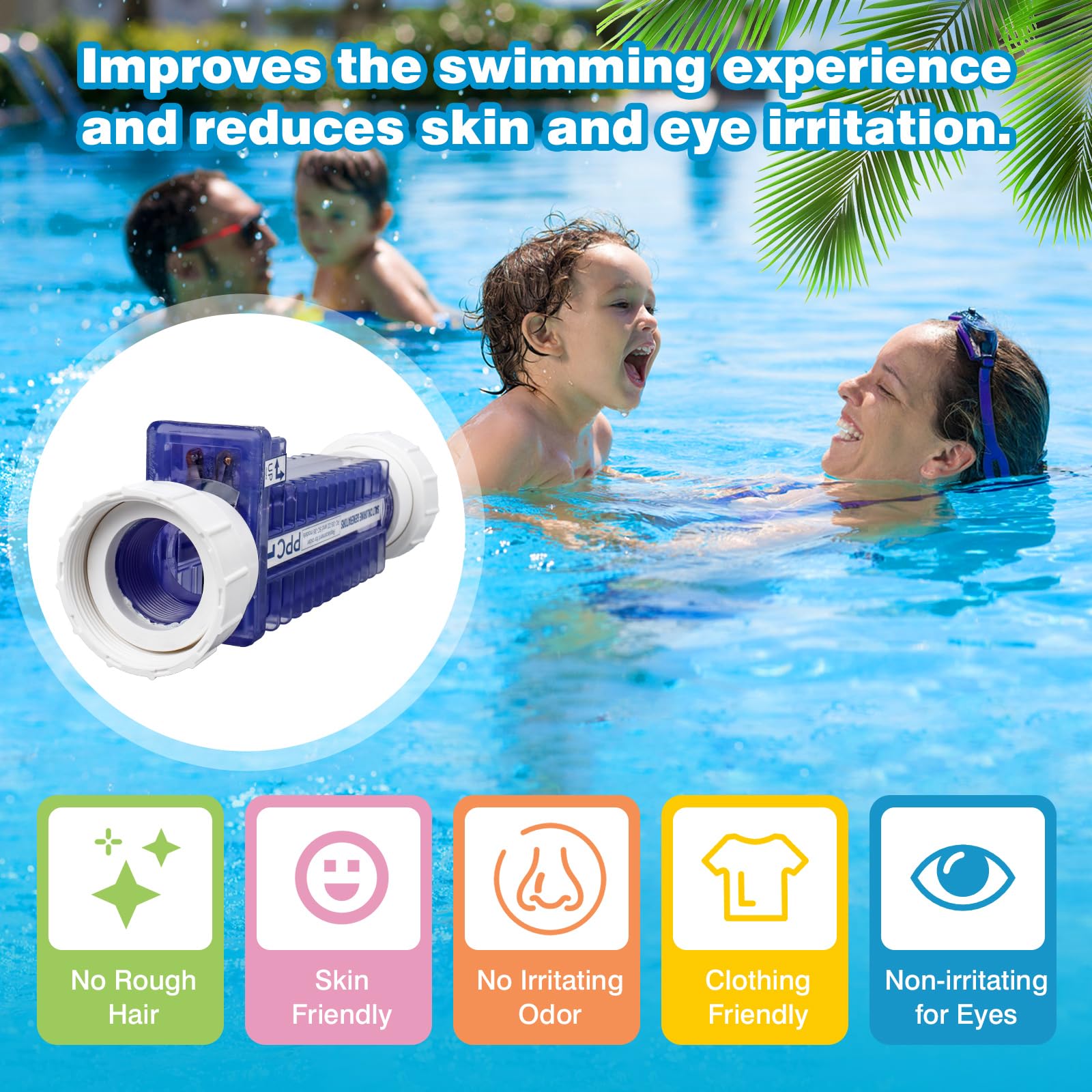 Gentle and Non-Irritating: Digital chlorine generator intelligent salinity balance makes the water silky smooth, reduce irritating by-products, avoid red eyes and skin sensitivity to the greatest extent and protect the color of swimsuits from fading , achieving more efficient purification and cleaner wate