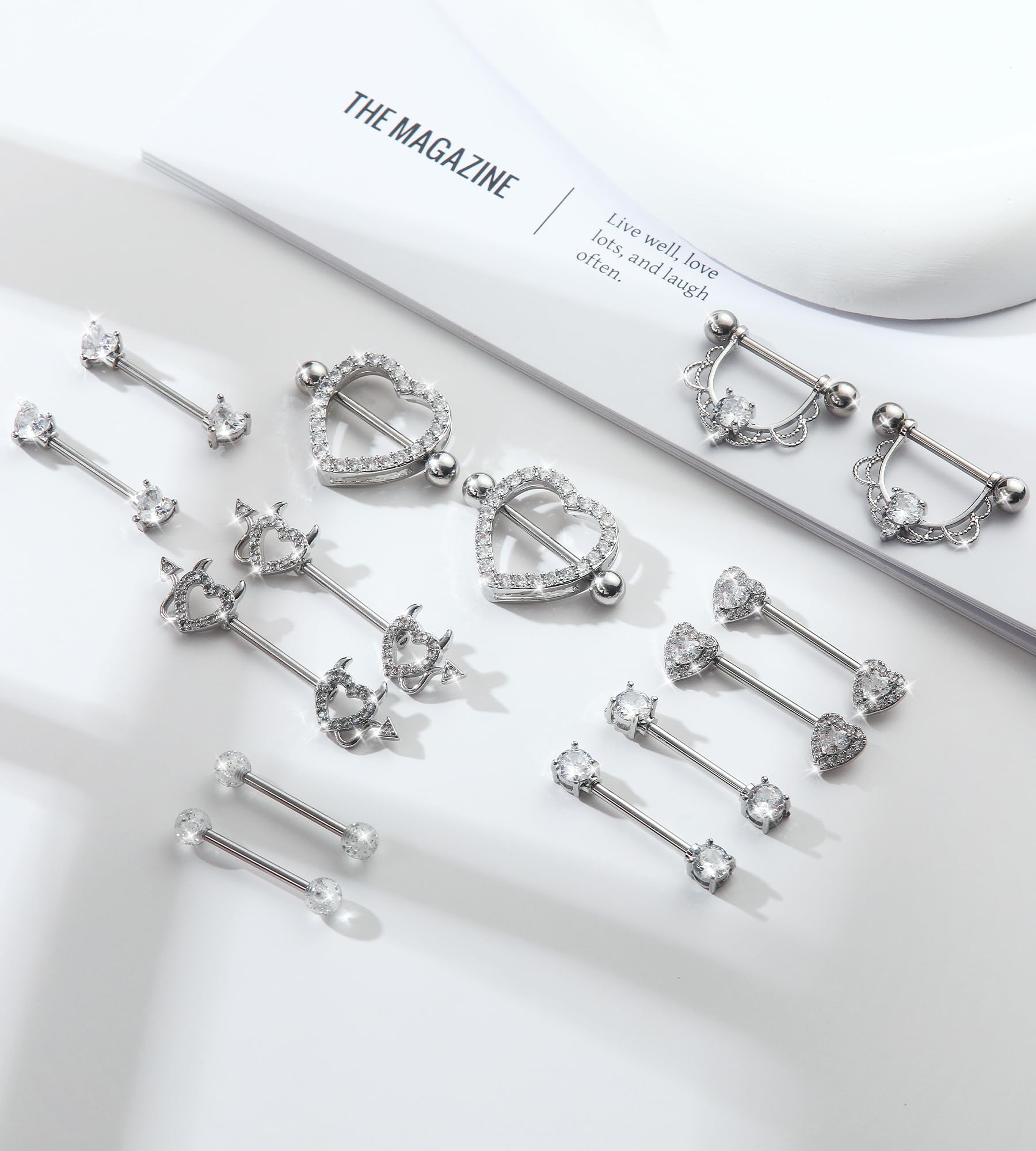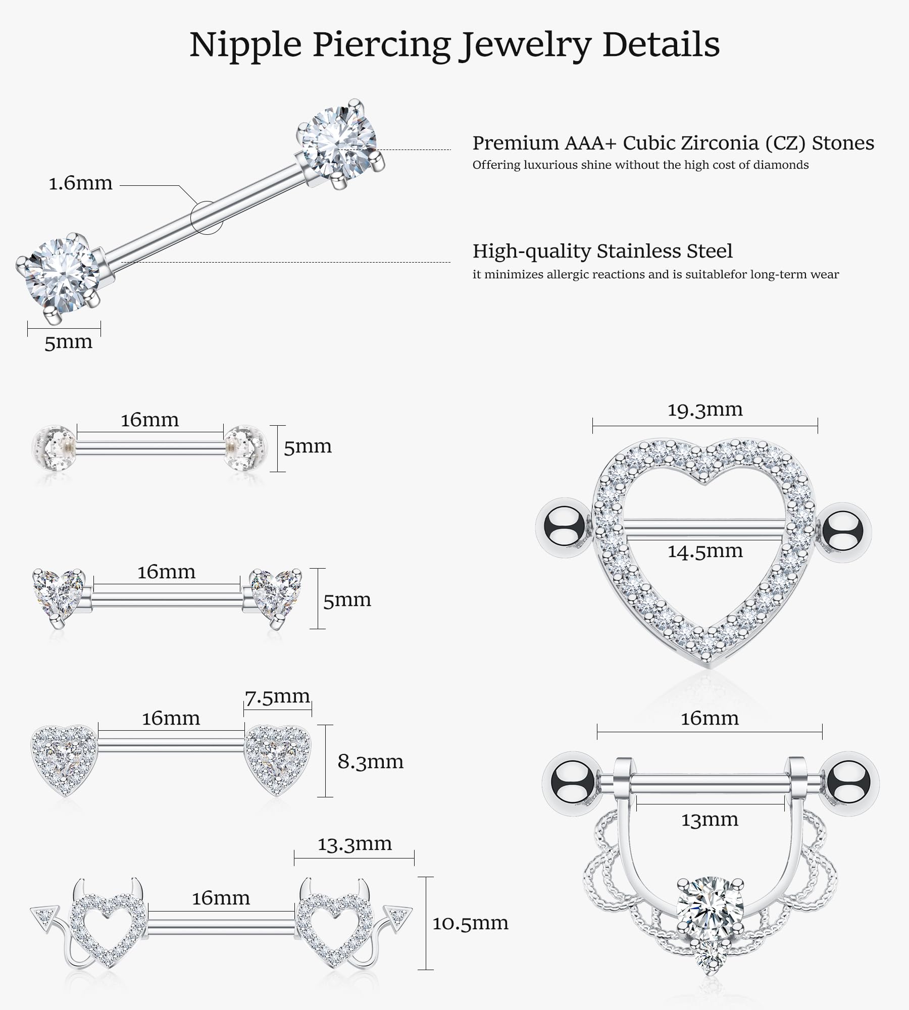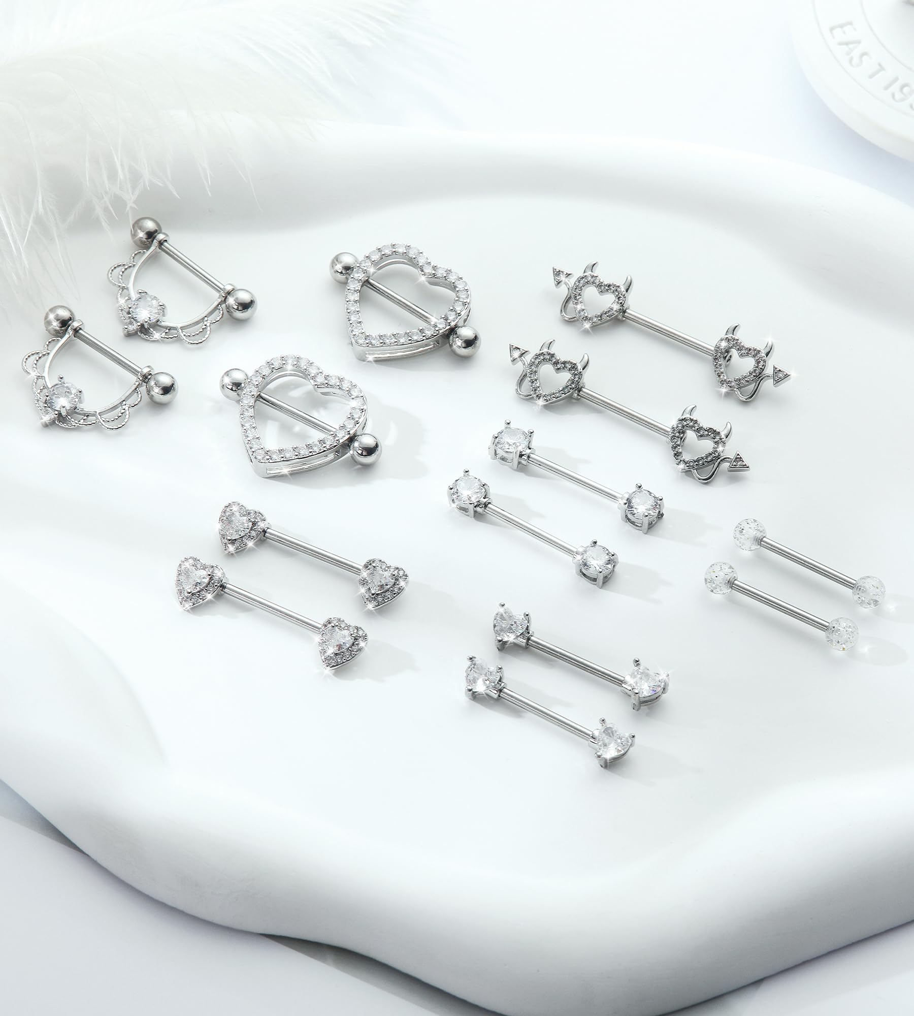 Nipple Piercing Jewelry Set: Nipple rings pack includes 7 pairs of stylish nipple piercings with diverse designs: heart, devil heart, cz, ball. Mix and match to express your mood and style, creating a versatile foundation for your body jewelry collection