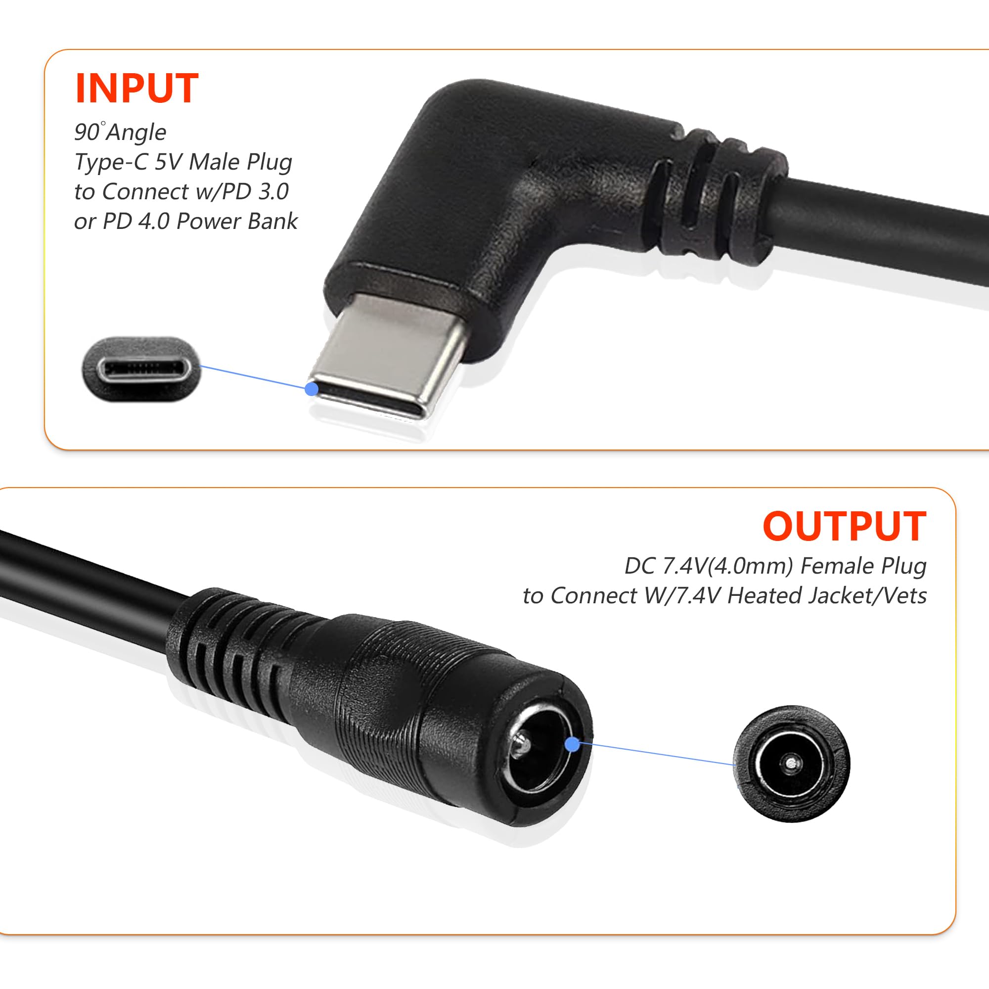 GREAT WINTER GIFT: Nothing is better than keeping you warm when staying outdoor in cold winter! This cable portable and convinent, easy for carry out for travel. With it, normal PD fast charging rechargeable batteries can be treat as heated jacket batteries, and the battery will be far more comfortable on your back/hipand, no need to carry huge and bulky heated jacket batteries anymore