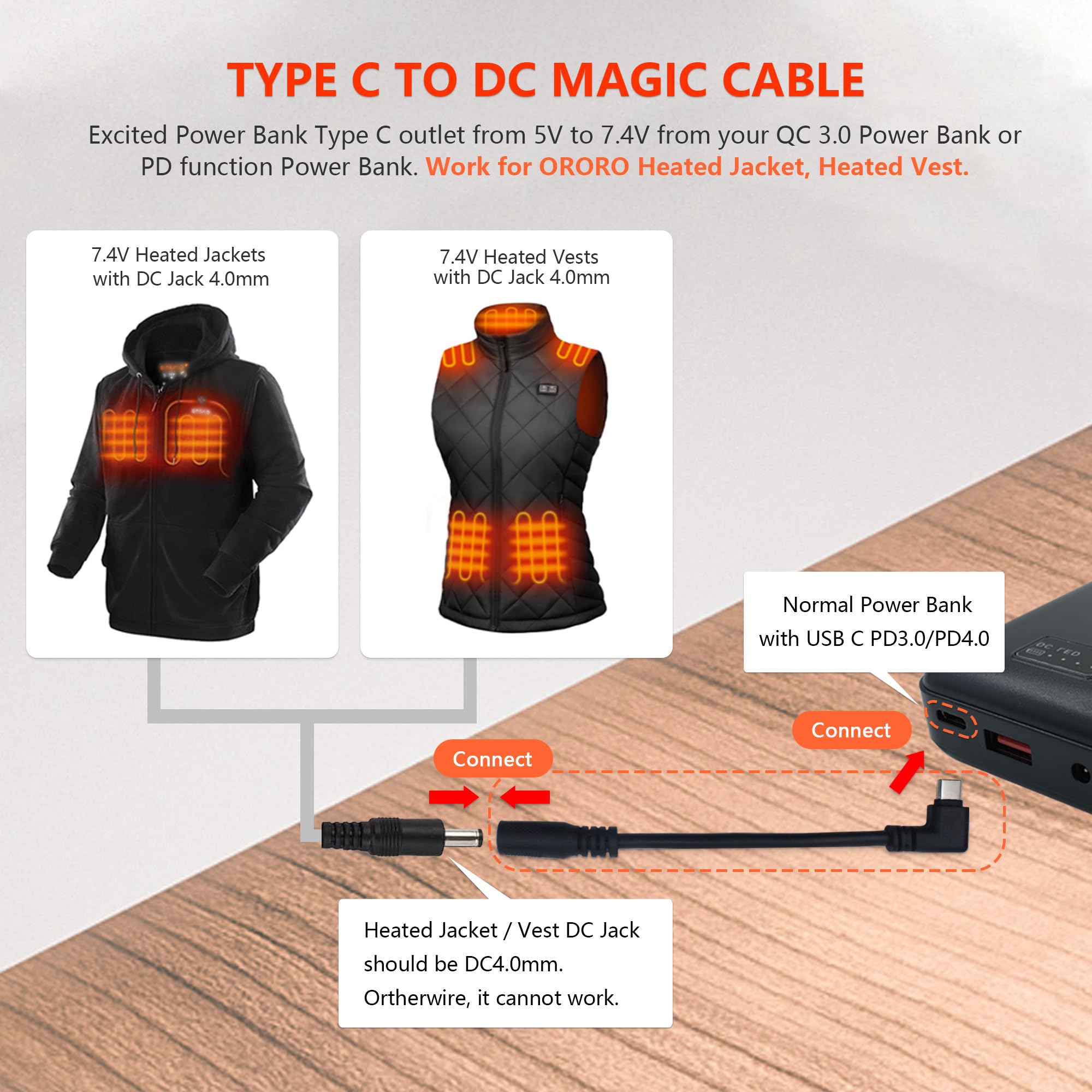 Why your Jacket cannot work with this Cable? At first, make sure you have a battery bank with PD type C fast charging port. And then connected this heated jacket adapter cable type C male port to the PD battery bank, while the cable DC port connects with 7.4V or 8.4V heated jackets(make sure your jackets has 4.0mm DC jack), then it will works perfectly!