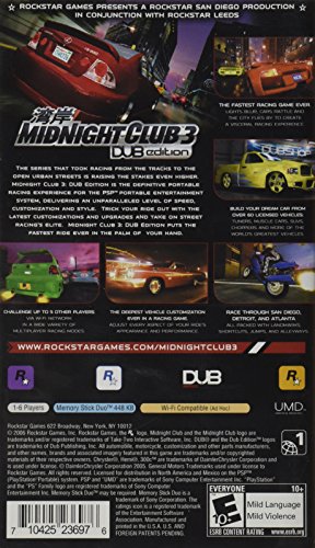 Midnight Club 3: DUB Edition has more speed, more choices, and more chrome than any game has ever packed under the hood. The game developers hooked up with DUB Magazine -- the authority on high-speed life -- to redefine racing games. The stakesa re highly now, and teh action is insanely faster. Drive the hottest licensed SUVs, import tuners, muscle cars, choppers and luxury rides. Trick them out with the latest rims, trims, and upgrades, then take them out to open city races in Atlanta, San Diego, and Detroit. The multiplayer action features 8-player action for serious racing action with friends.