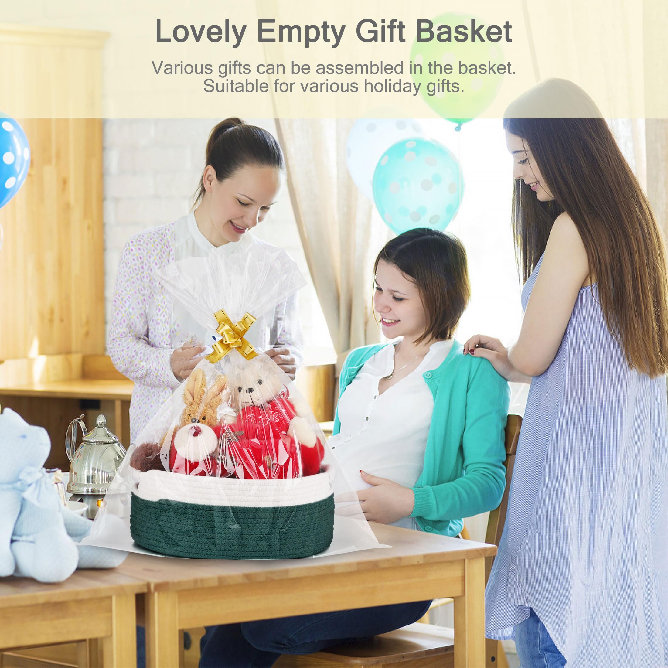 【Ideal Size and Material】Our lovely empty gift basket measures 13“ x 9” x 5.5". It is made of high quality natural cotton rope, soft and skin-friendly, chemical free, and won't scratch clothes or furniture. It's a perfect storage basket for families with babies or pets.