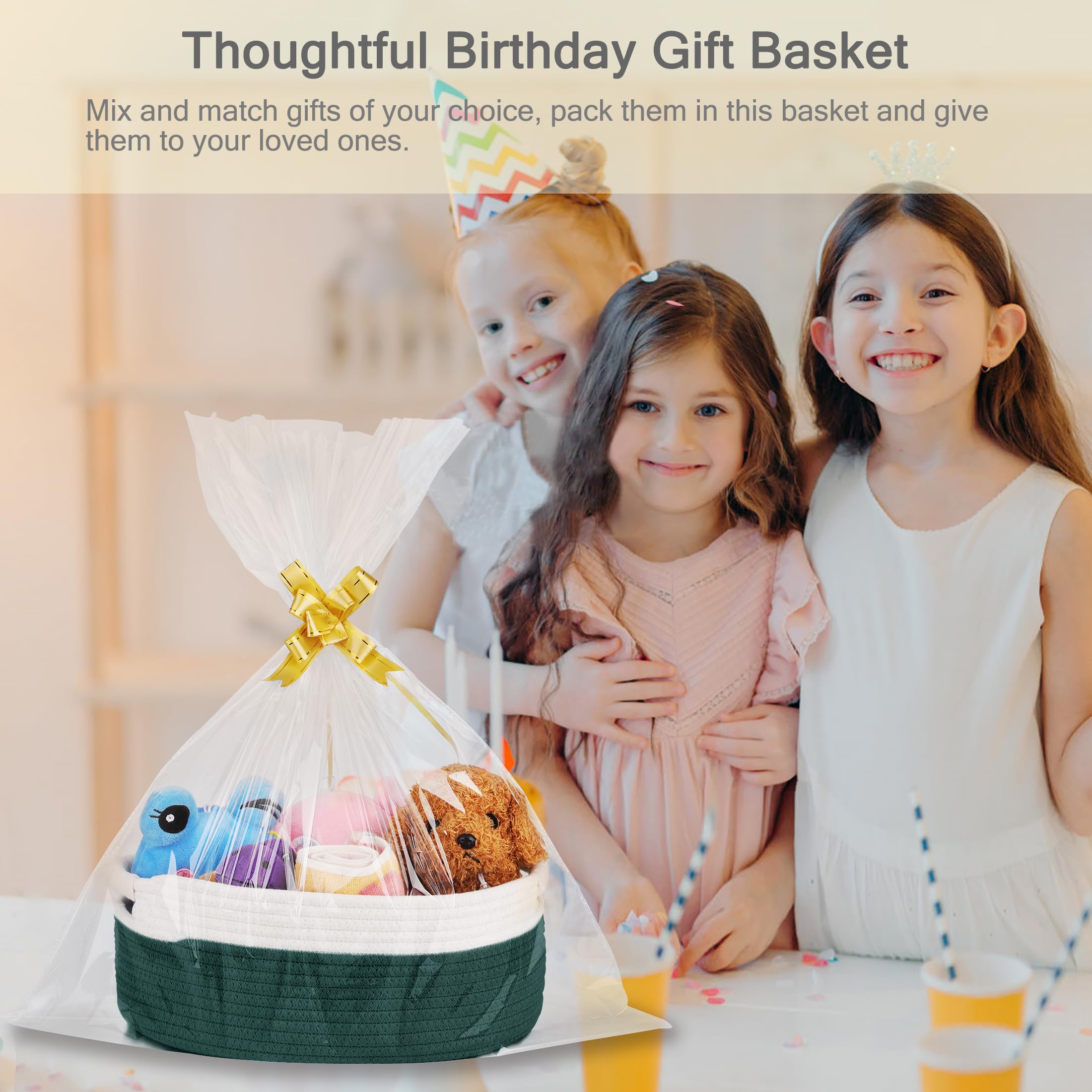 【Best Gift Set】The small storage basket comes with one clear cellophane bag and three ribbons of different colors. Mix and match gifts of your choice, pack them in this basket and give them to your loved ones. It's perfect for various occasions like Birthdays, Baby Showers, Mother's Day, Father's Day, Valentine's Day, Graduation Gifts, Easter, Christmas and more. This woven basket is a great gift in itself.