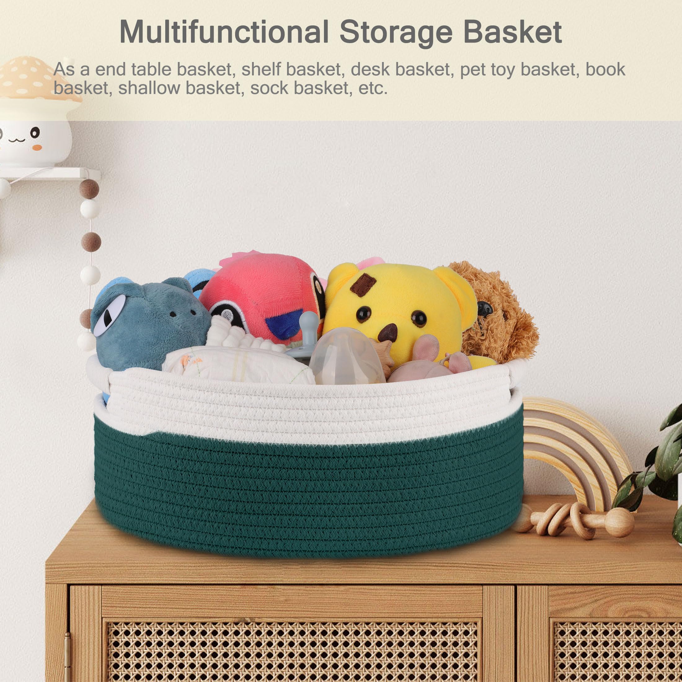 【Multifunctional Storage Basket】 Our rope storage basket is the perfect solution for keys, wallets, diapers, books, remotes, toys, makeups, and more. You can use it as a baby basket, end table basket, shelf storage basket, desk basket, kids' toy basket, book basket, shallow basket, and more. It can even be used as a pet toy basket for cats and dogs.