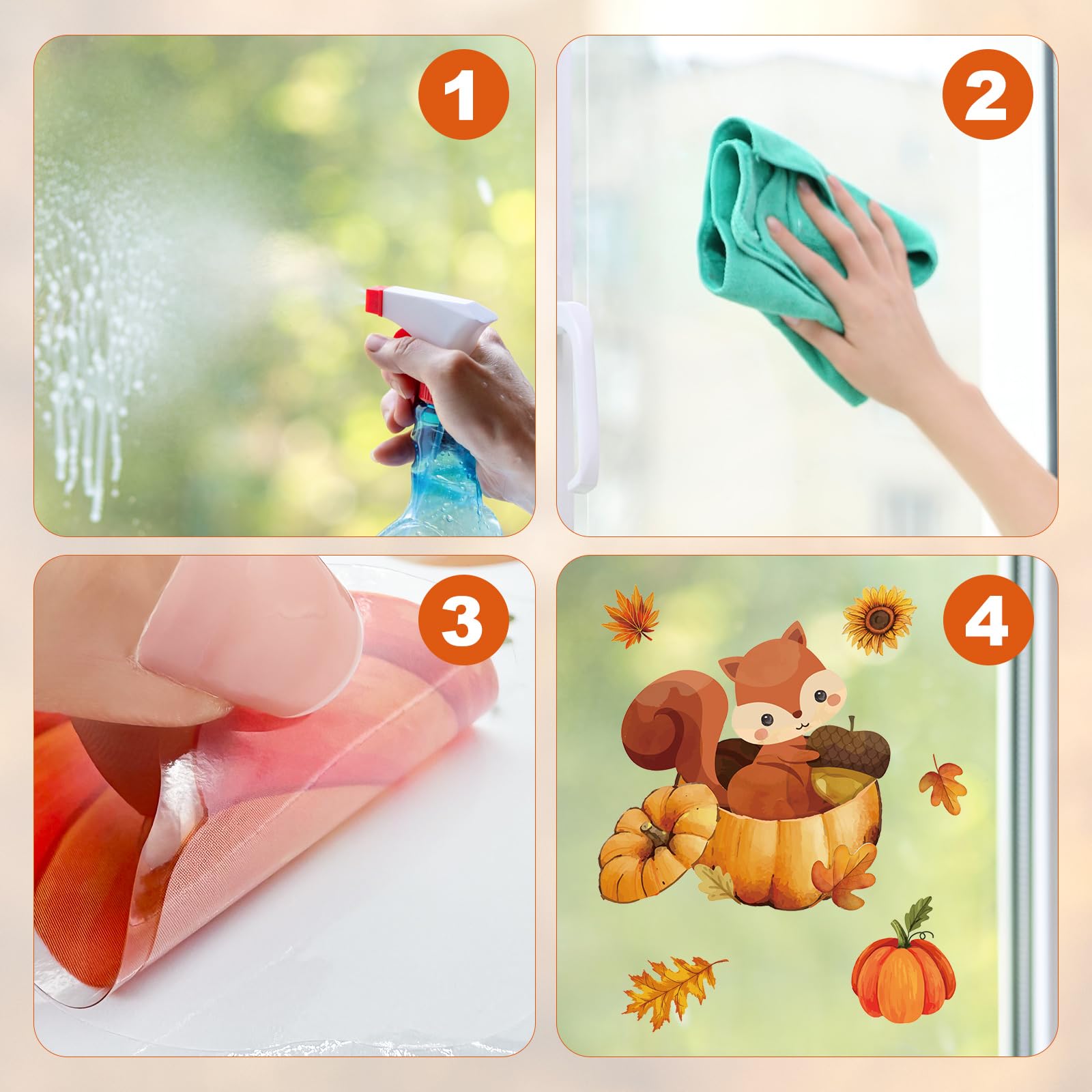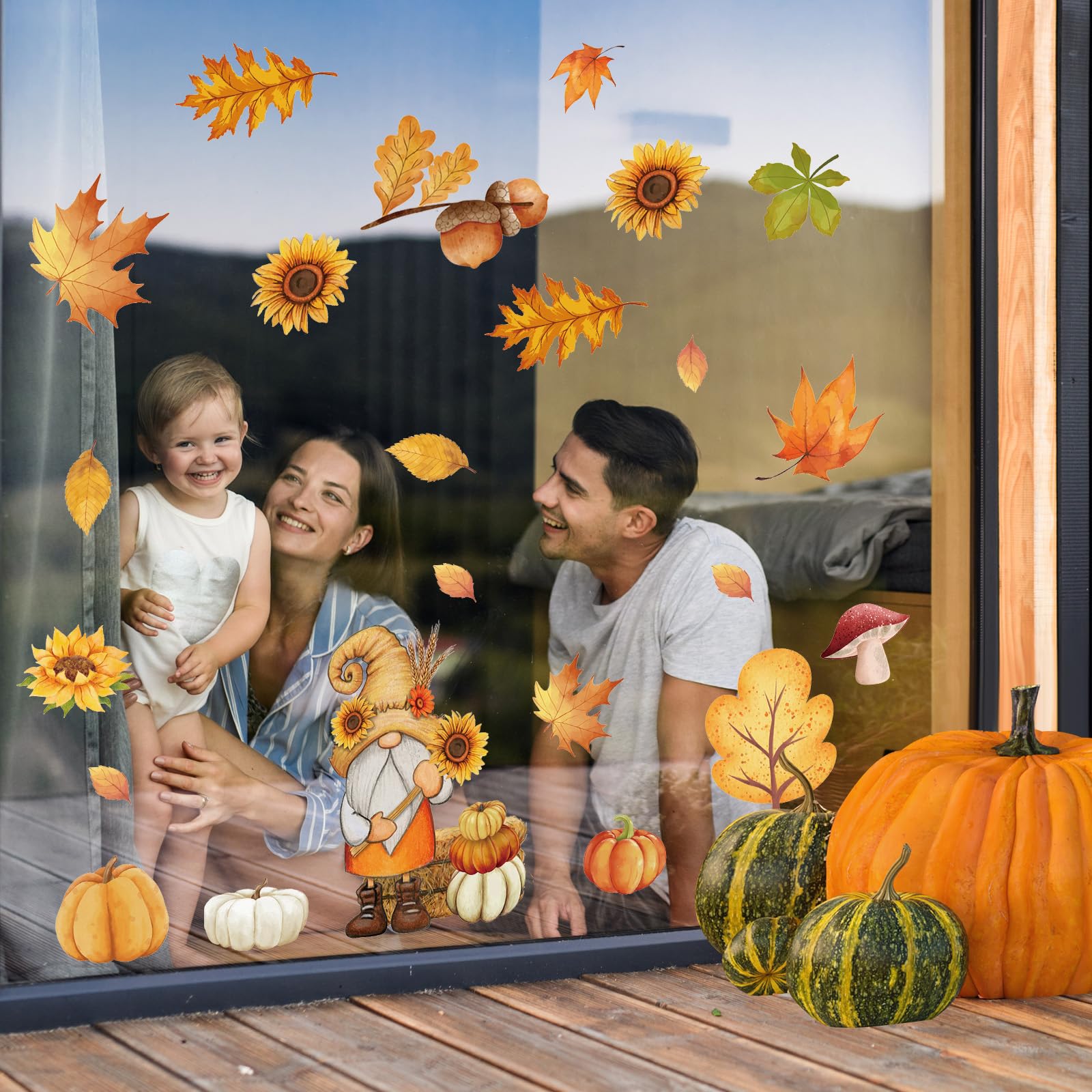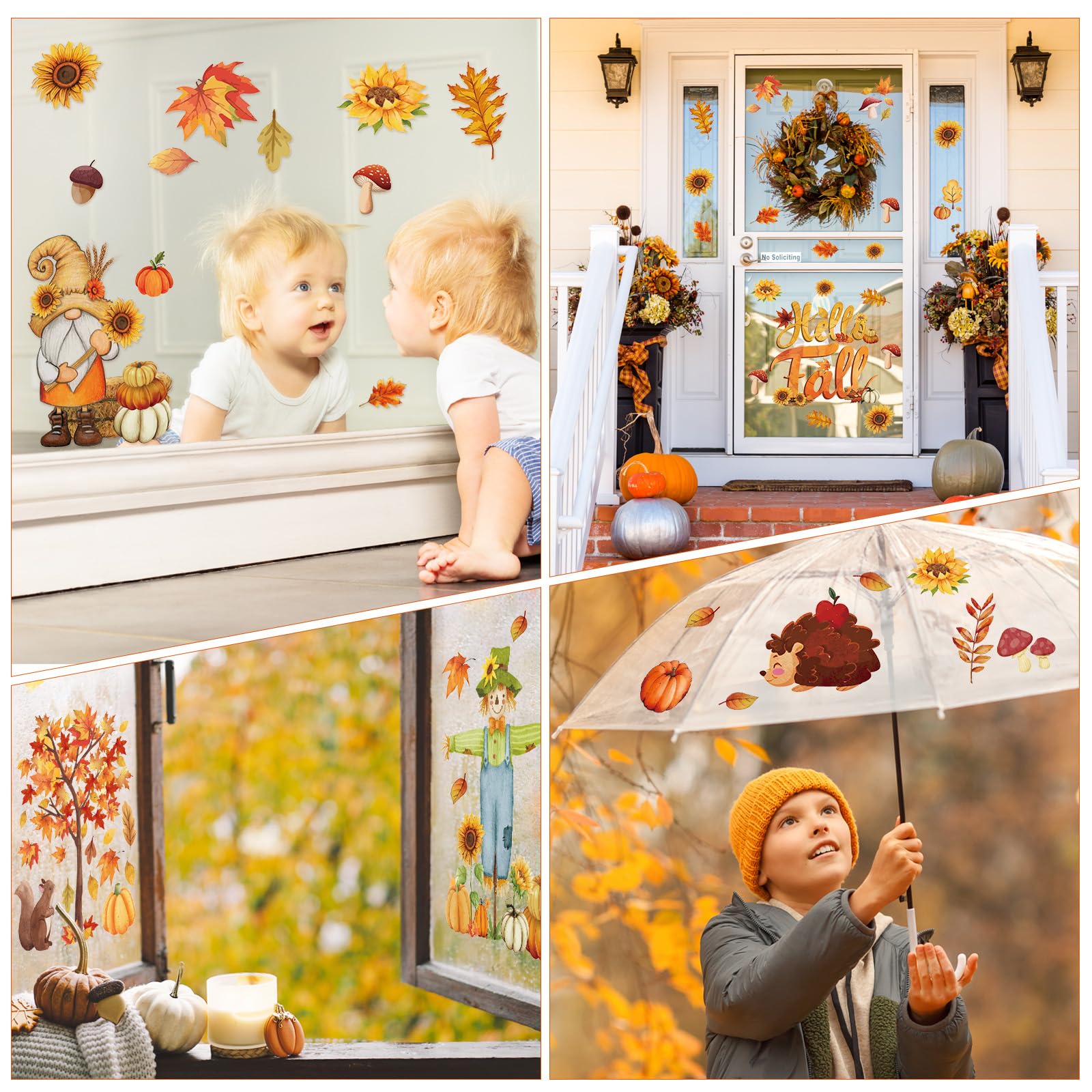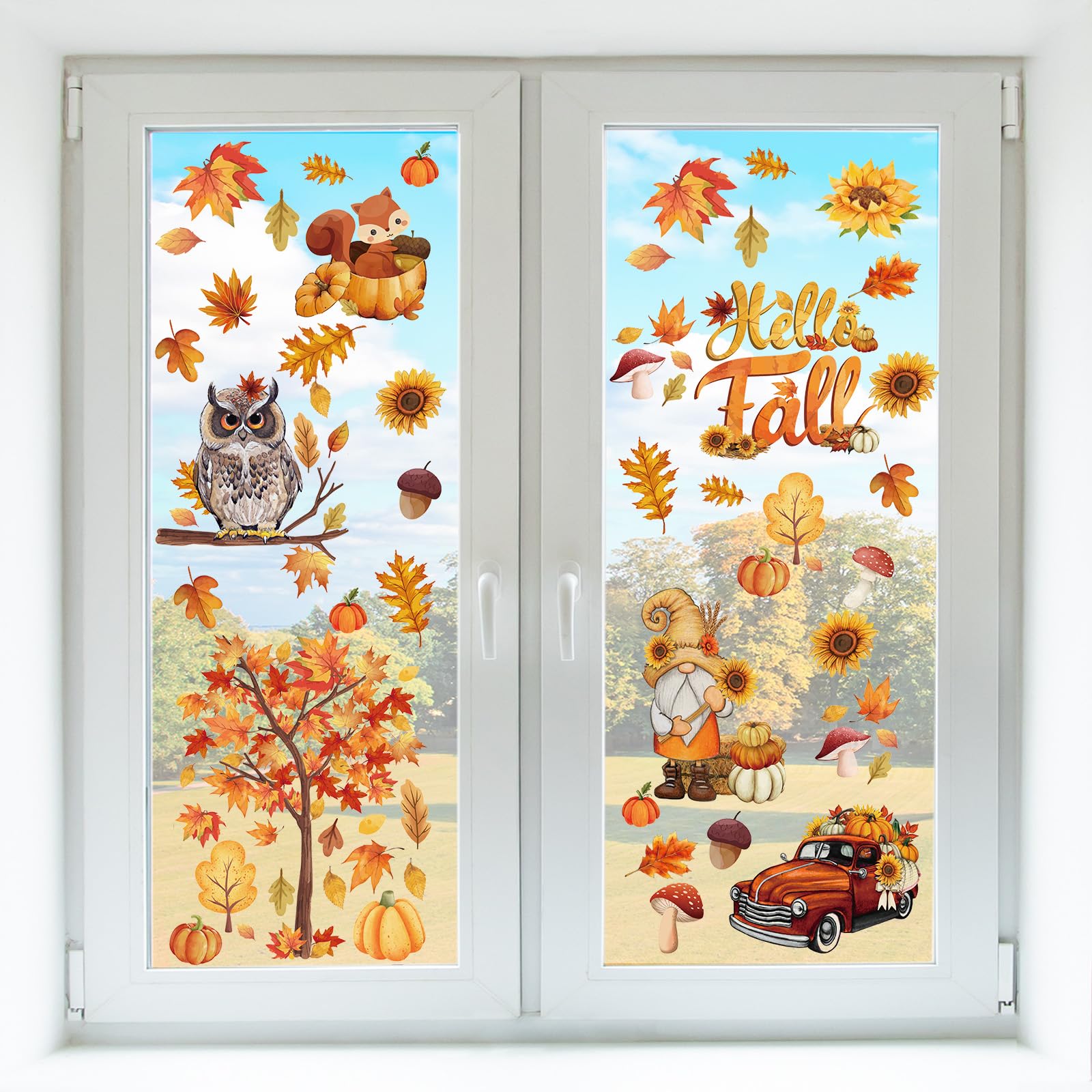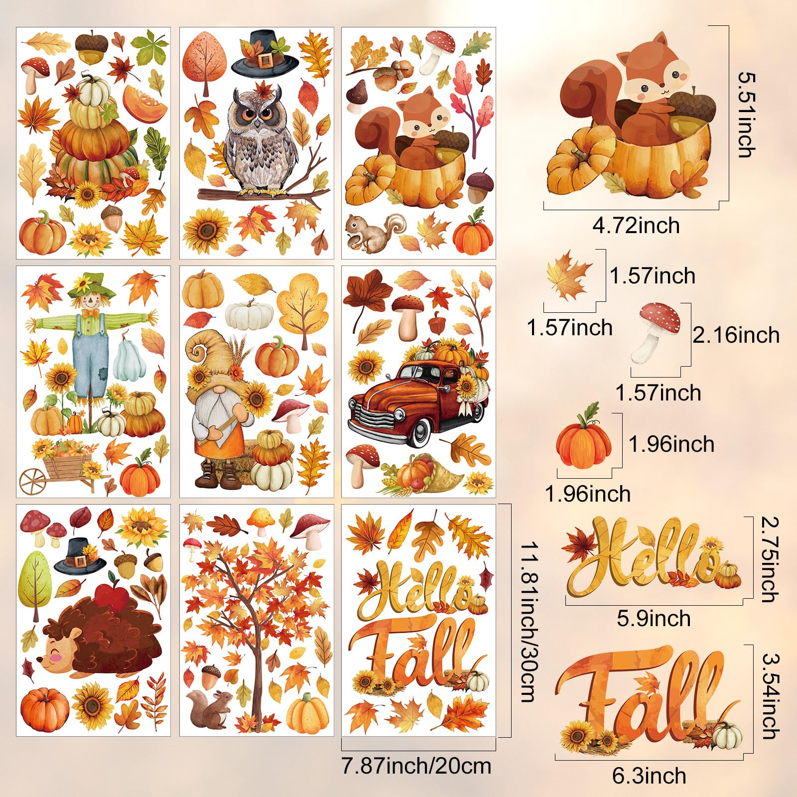Unique designs: 9 sheets of fall decals for windows are designed with different patterns and colors, each sheet measures 20 x 30cm / 7.8 x 11.8inch, printed with pumpkin,maple leaf,scarecrow,squirrel,pine cone, gnome,owl,hedgehog and so on, well match the fall harvest season atmosphere