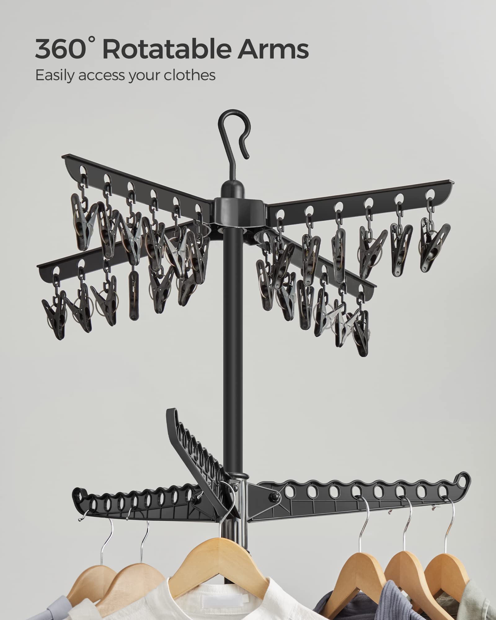 [Large Capacity] Designed with 27 holes for holding hangers on the second tier and 24 clips on the first tier, this laundry rack can hold lots of clothes and accessories; total max. static load capacity: 35 lb