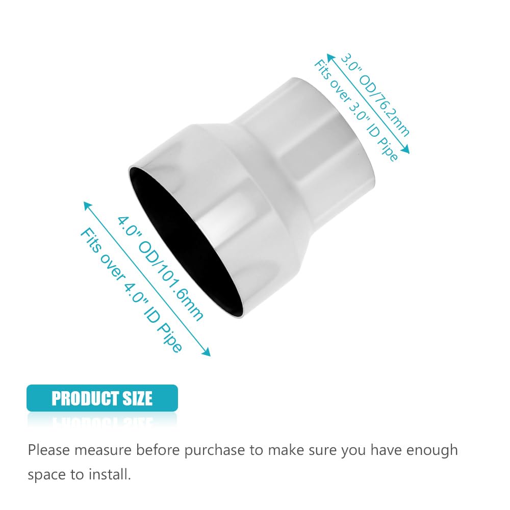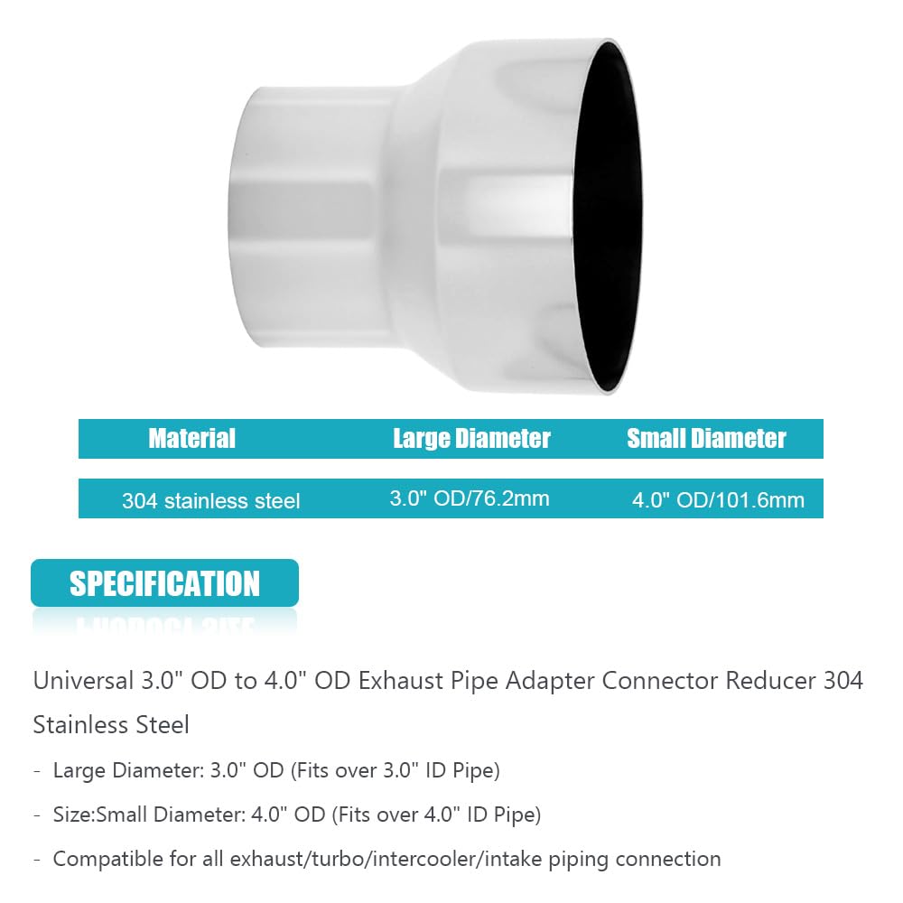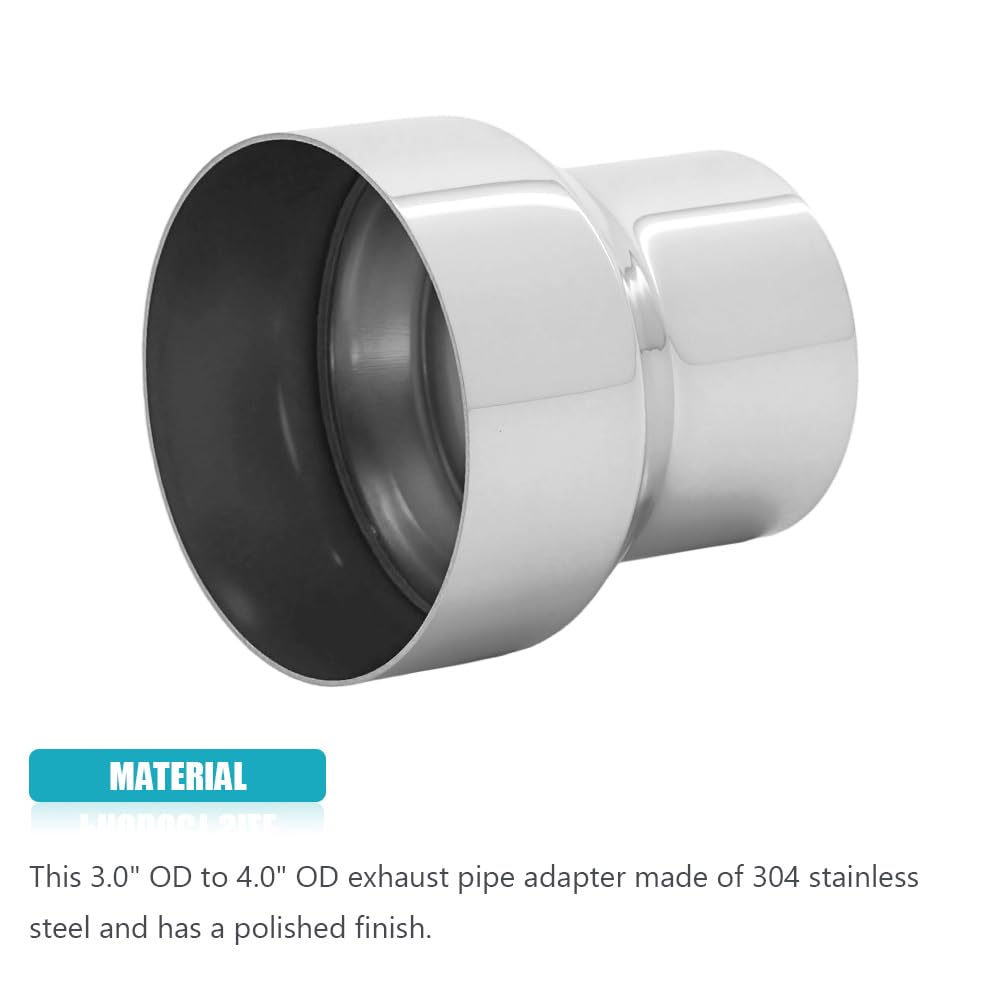 【High Quality】This 3.0 Inch to 4.0 Inch (3" OD to 4" OD) exhaust pipe adapter made of 304 stainless steel and has a polished finish.