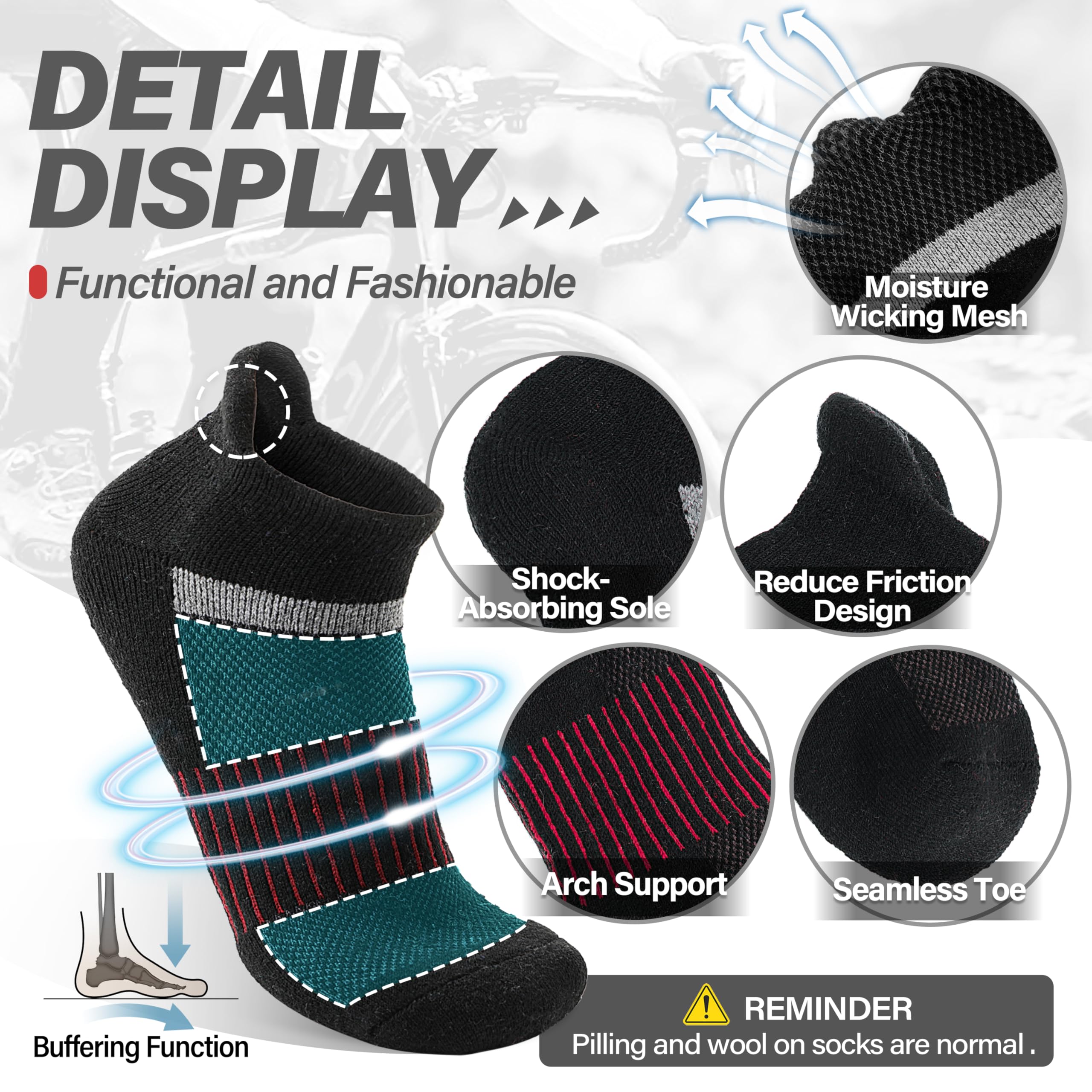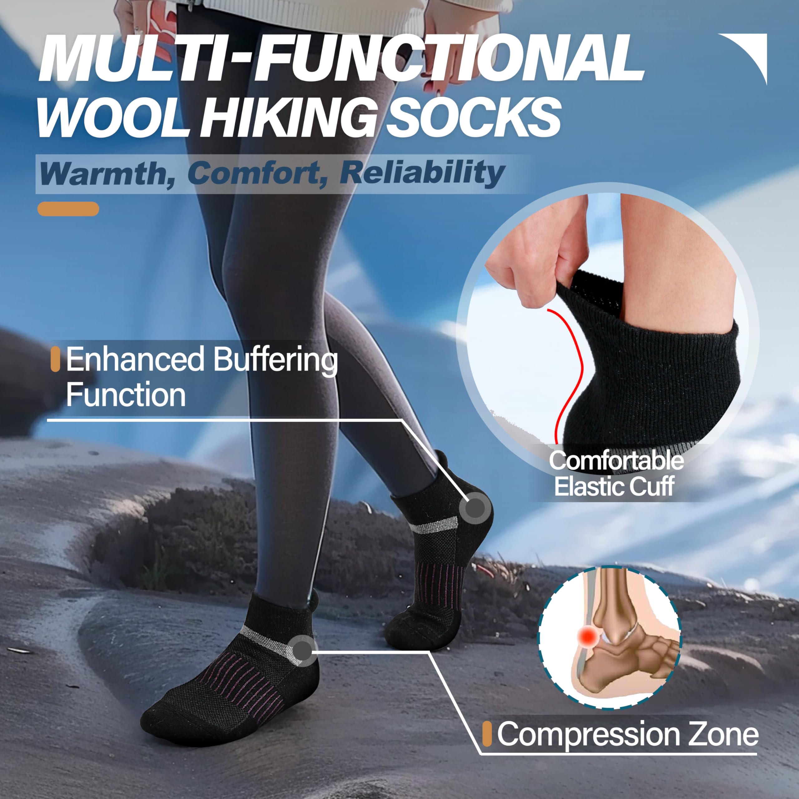 MOISTURE WICKING- By designing with ventilation mesh function, these wool hiking ankle socks are breathable and release heat, which keep feet dry quickly and have great help in odor repelling. They are suitable for hiking, running, outdoor walking , trekking or working.