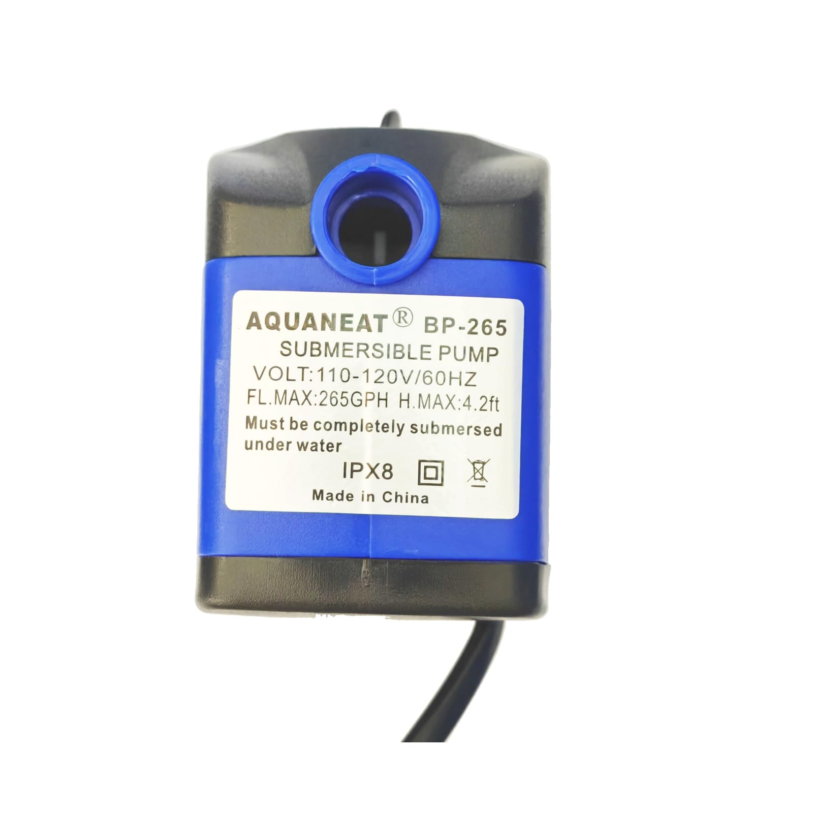 Features: The submersible water pump has an adjustable flow valve allowing you to control the water flow accordingly. The small water pump work as a replacement pump for various fountains, birdbaths, water tables, waterfalls and other water features. The aquarium water pump can be used for circulating water in the tank and for fish tank water changes. The fountain pump ensures fresh water pumped through fountain daily and creates babbling brook sounds to relax you. 4 pcs of suction cups for either vertical or horizontal mounting No need any tools to detach it, easy to separate, easy to clean Specifications: Max Flow Rate: 265 GPH (1000L/H) Recommended H-Max (Lift height): 2.5 feet Voltage: 110 - 120 V @ 60 Hz Length of power cord: 6 feet Outlet: Fits 5/16, 1/2 inch ID (inside diameter) tubing Dimension: : 2.75" x 2" x 2.62" (L x W x H) Package includes: (1) Pump (2) Outlet adapters (1) 3.3ft 5/16” Tubing Troubleshooting Instructions: Why is my pump weak? The pump operates on the principle that higher lift results in lower flow rate. 265 GPH is the theoretical flow rate at zero lift; the actual output decreases with pipe resistance, lifting height. And the higher the lifting height is, the lower the flow rate will be. Why is my pump not working properly? To ensure the water pump operates properly, the following steps must be taken: Submersion Requirement: The pump must be fully submerged in water. Debris Clearance: If the impeller is jammed by debris (e.g., fish waste, algae, gravel), causing the pump to stop working, disassemble the housing to remove obstructions and check pipe connections for kinks or blockages to resume normal operation. Air Removal: For the first startup or after water replacement, gently shake the pump to expel any trapped air inside; air trapped in the pipe or the pump may cause "gurgling" noises and the pump failure due to airlock. Notes: 1. The inner shaft will be with a little bit of lubricant to ensure the motor is working well, If you are raising sensitive fish or aquatic plants, please use them in other tanks for a short time then move it into fish tanks. 2. Due to all the pumps need professional water testing by our manufacturer before shipment, if the water pump you received has a little water left from the testing, it is a normal phenomenon.