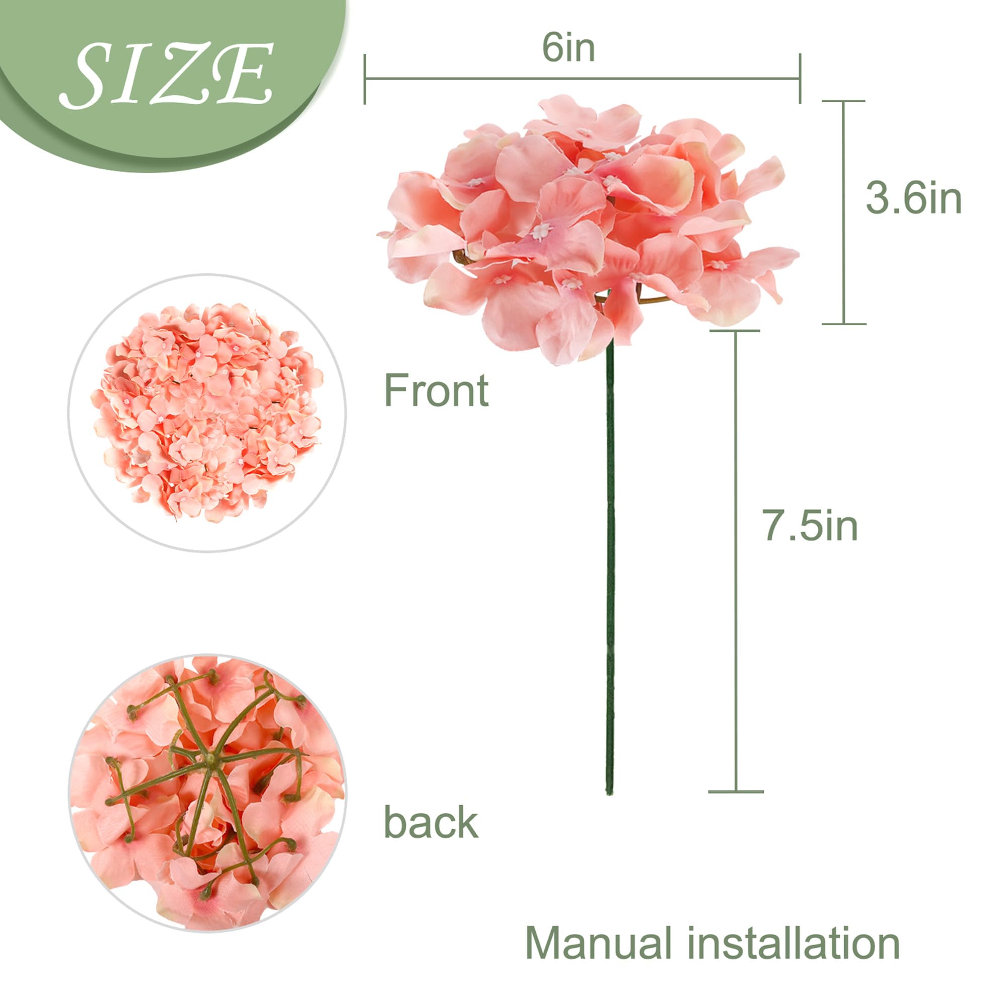 Size & Material: Hydrangea head diameter is about 6 inches, height is about 3.6 inches, made from silk cloth and plastic; Independent stem length is about 8 inches, made of plastic with iron wire inside, can be bent or cut freely to match any decor style or occasion