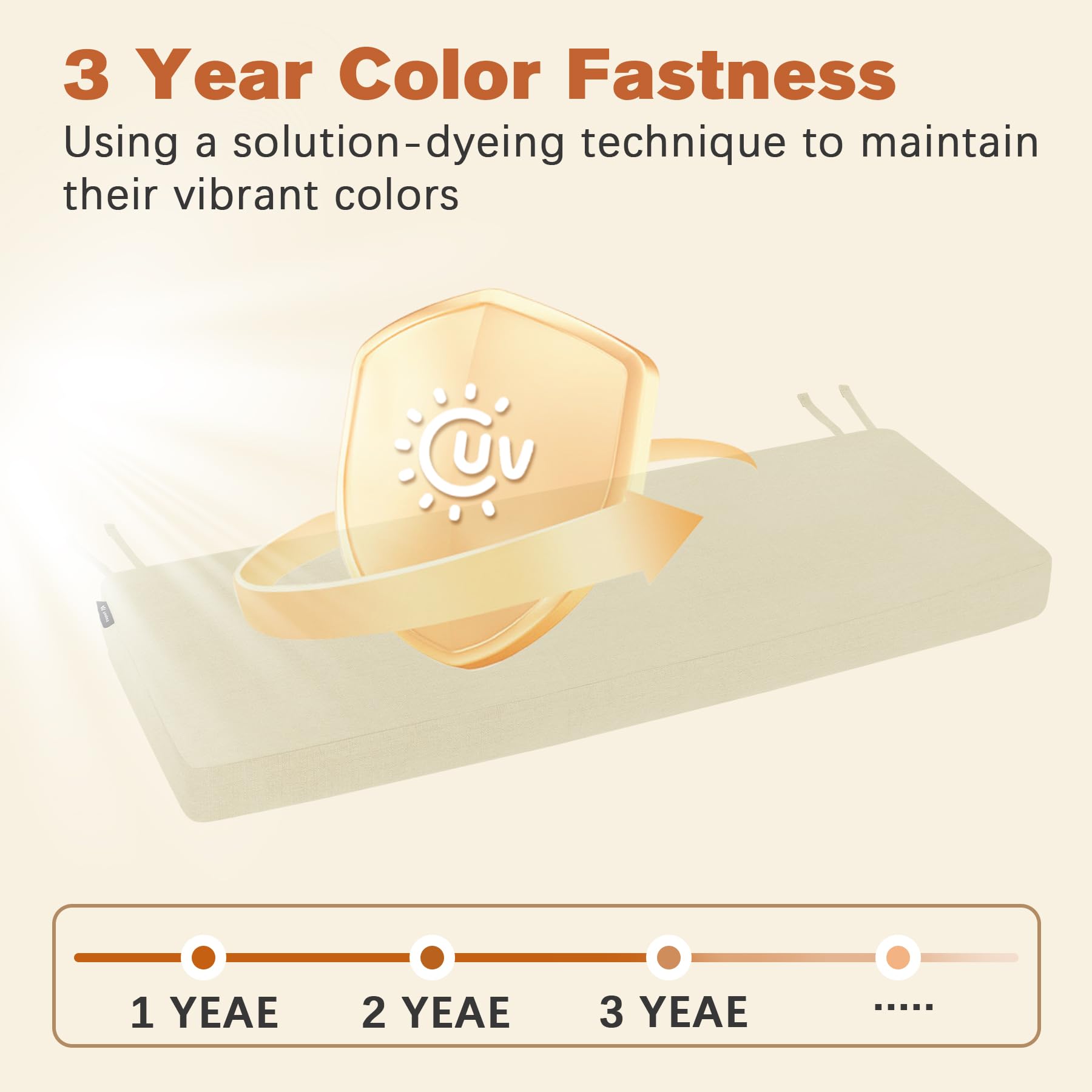 3-Year Color Fastness: Our outdoor loveseat cushions crafted with solution-dyed fabric. This type of fabric is renowned for its exceptional color fastness, making it suitable for outdoor use. With this fade-resistant fabric, our patio furniture cushions can maintain their vibrant colors for up to 3 years, even when exposed to intense midday sunlight for at least 1500 hours.