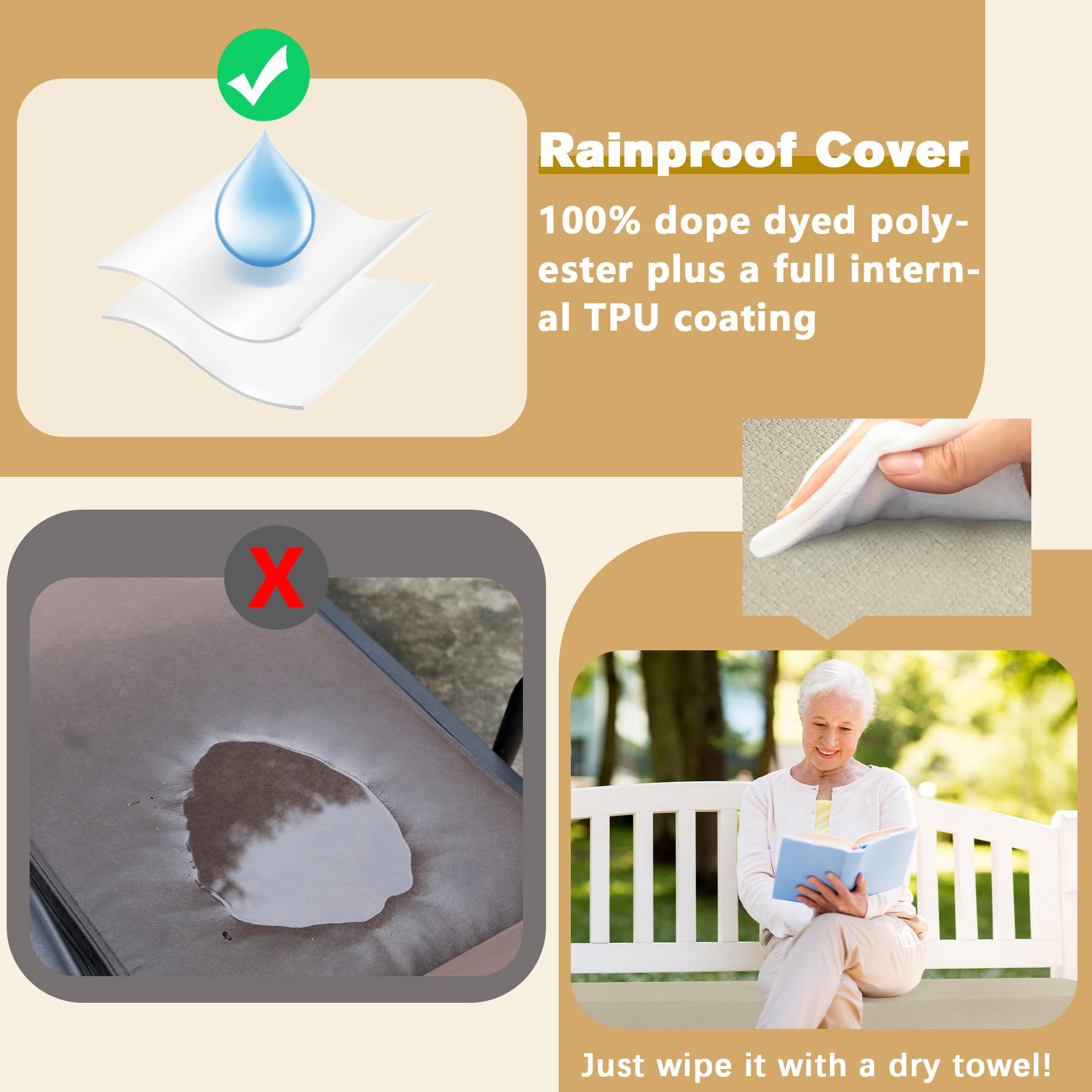 100% Full Rainproof Cushion Cover: Our outdoor bench cushion feature a 100% dope dyed polyester fabric, plus a full internal TPU coating. This material offers excellent waterproofing and dust resistance. Additionally, we have applied the hidden zip to prevent rainwater from getting inside. Favoyard outdoor seat cushion for patio furniture is a perfect decor in garden, patio, porch etc.