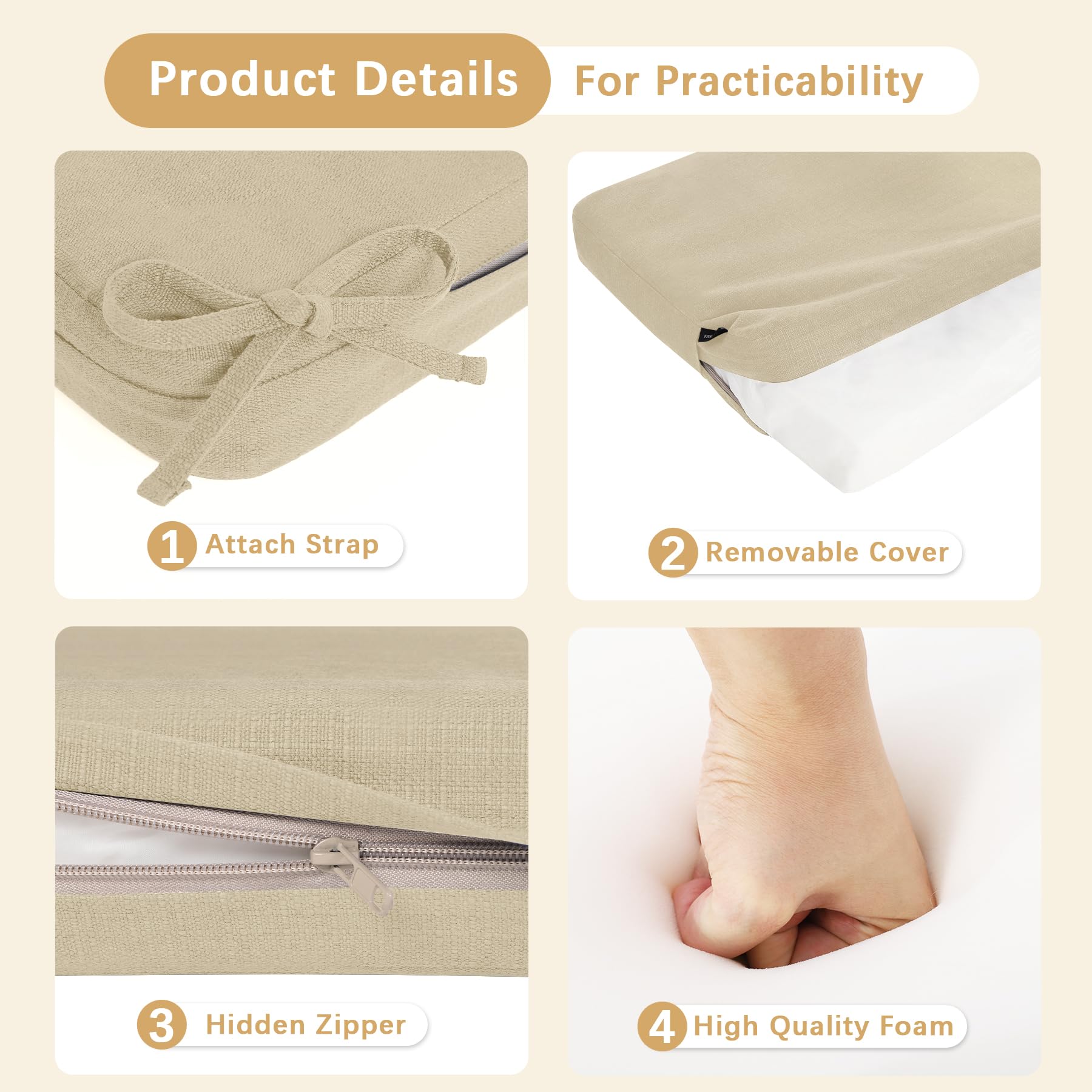 Removable Cover & Details - Our outdoor seat cushion have a removable cover for easy cleaning and maintain. You can wash the cover by hand or in a washing machine and air dry it afterward. Our outdoor cushion is designed with 2 ties, keep your cushions exactly where you want them and also ensure that they look great on your furniture.