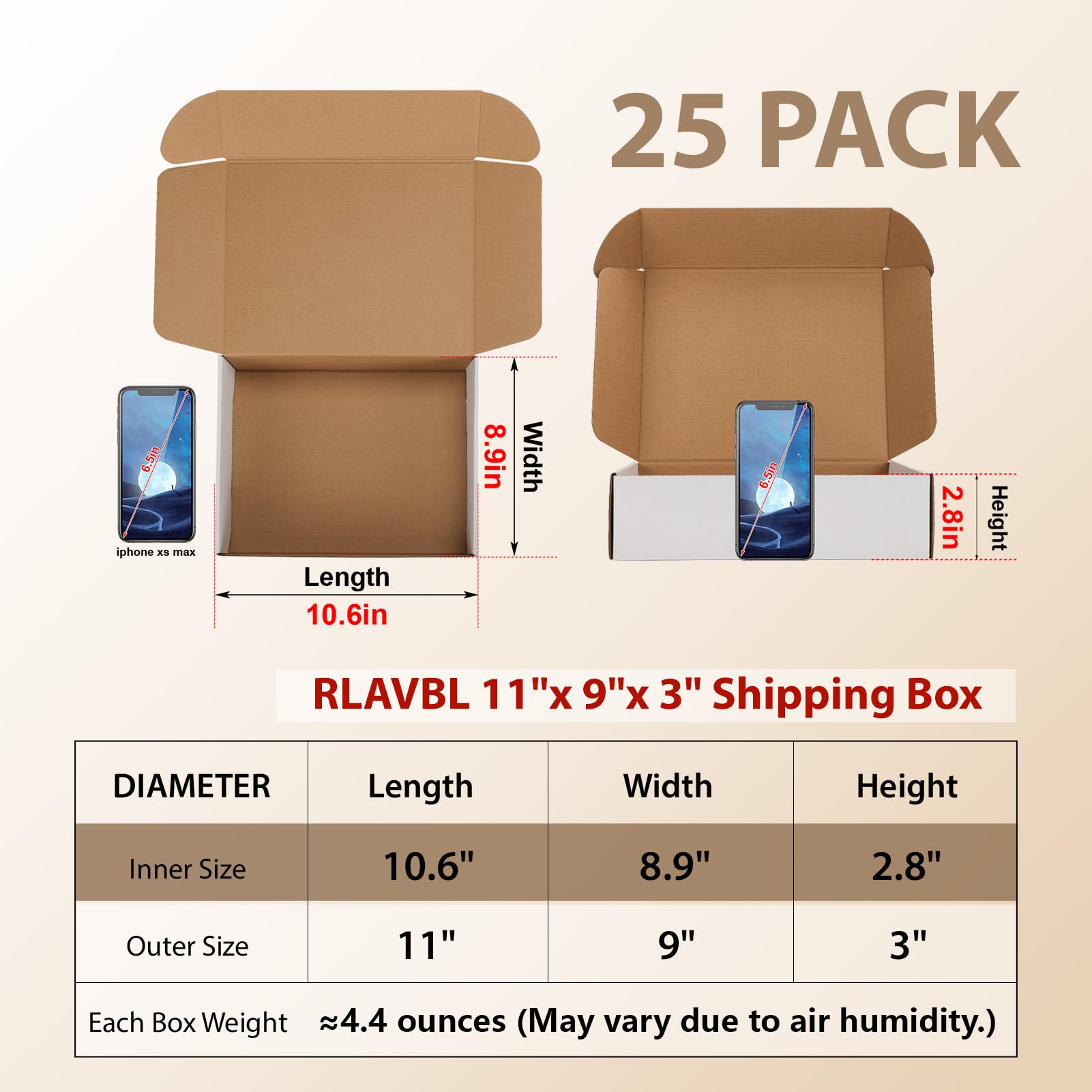 DIMENSION: The shipping boxes set includes 25 packs of the cardboard box. The size of this small moving box is 11” x 9” x 3”(L x W x H), suitable for packing or mailing those small and lightweight items.